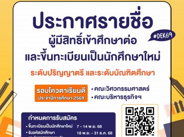 ประกาศรายชื่อผู้มีสิทธิ์สอบคัดเลือก รอบโควตาเรียนดี ประจำปีการศึกษา 2569 คณะวิศวกรรมศาสตร์ และ คณะบริหารธุรกิจฯ ตุลาคม 29, 2025ตุลาคม 30, 2025ประชาสัมพันธ์ประกาศ, รับสมัครนักศึกษา