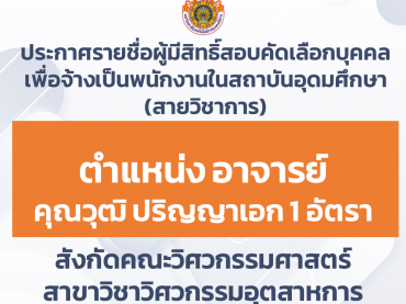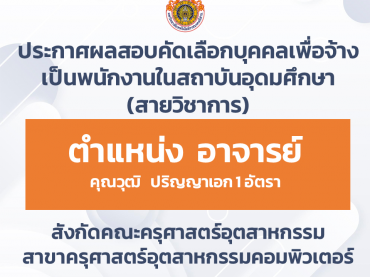 ประกาศผลสอบคัดเลือกบุคคลเพื่อจ้างเป็นพนักงานในสถาบันอุดมศึกษา สายวิชาการ ตำแหน่ง อาจารย์ จำนวน ๑ อัตรา คุณวุฒิ ปริญญาเอก สังกัดคณะครุศาสตร์อุตสาหกรรม สาขาครุศาสตร์อุตสาหกรรมคอมพิวเตอร์ พฤศจิกายน 26, 2025พฤศจิกายน 26, 2025ประชาสัมพันธ์ประชาสัมพันธ์, รับสมัครงาน