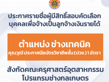 ประกาศรายชื่อผู้มีสิทธิ์สอบคัดเลือกบุคคลเพื่อจ้างเป็นลูกจ้างเงินรายได้ ตำแหน่ง ช่างเทคนิค จำนวน ๑ อัตรา คุณวุฒิ ประกาศนียบัตรวิชาชีพชั้น (ปวช.) สังกัดคณะครุศาสตร์อุตสาหกรรม โปรแกรมช่างกลเกษตร พฤศจิกายน 26, 2025ประชาสัมพันธ์ประชาสัมพันธ์, รับสมัครงาน