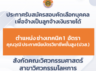 ประกาศรับสมัครสอบคัดเลือกบุคคลเพื่อจ้างเป็นลูกจ้างเงินรายได้ ตำแหน่ง ช่างเทคนิค จำนวน ๑ อัตรา คุณวุฒิ ประกาศนียบัตรวิชาชีพชั้นสูง(ปวส.) สังกัดคณะวิศวกรรมศาสตร์สาขาวิศวกรรมโลหการ พฤศจิกายน 18, 2025พฤศจิกายน 18, 2025ประชาสัมพันธ์ประชาสัมพันธ์, รับสมัครงาน