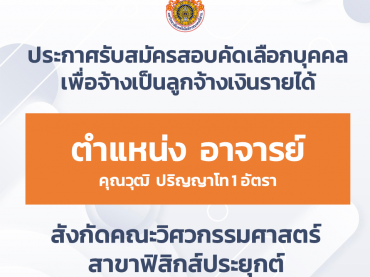 ประกาศรับสมัครสอบคัดเลือกบุคคลเพื่อจ้างเป็นลูกจ้างเงินรายได้ ตำแหน่ง อาจารย์ จำนวน ๑ อัตรา คุณวุฒิ ปริญญาโท สังกัดคณะวิศวกรรมศาสตร์ สาขาฟิสิกส์ประยุกต์ พฤศจิกายน 19, 2025พฤศจิกายน 19, 2025ประชาสัมพันธ์ประชาสัมพันธ์, รับสมัครงาน