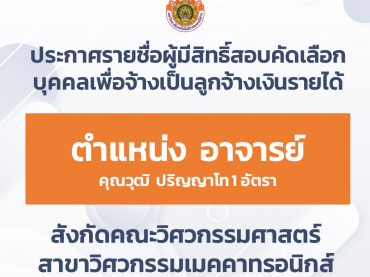 ประกาศรายชื่อผู้มีสิทธิ์สอบคัดเลือกบุคคลเพื่อจ้างเป็นลูกจ้างเงินรายได้ ตำแหน่ง อาจารย์ จำนวน ๑ อัตรา คุณวุฒิ ปริญญาโท สังกัดคณะวิศวกรรมศาสตร์ สาขาวิศวกรรมเมคคาทรอนิกส์ พฤศจิกายน 26, 2025พฤศจิกายน 26, 2025ประชาสัมพันธ์ประชาสัมพันธ์, รับสมัครงาน