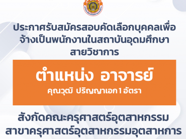 ประกาศรับสมัครสอบคัดเลือกบุคคลเพื่อจ้างเป็นพนักงานในสถาบันอุดมศึกษา สายวิชาการ ตำแหน่ง อาจารย์ จำนวน ๑ อัตรา คุณวุฒิ ปริญญาเอก สังกัดคณะครุศาสตร์อุตสาหกรรม สาขาครุศาสตร์อุตสาหกรรมอุตสาหการ พฤศจิกายน 27, 2025พฤศจิกายน 27, 2025ประชาสัมพันธ์ประชาสัมพันธ์, รับสมัครงาน