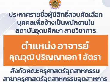 ประกาศรับสมัครสอบคัดเลือกบุคคลเพื่อจ้างเป็นพนักงานในสถาบันอุดมศึกษา สายวิชาการ ตำแหน่ง อาจารย์ จำนวน ๑ อัตรา คุณวุฒิ ปริญญาเอก สังกัดคณะครุศาสตร์อุตสาหกรรม สาขาครุศาสตร์อุตสาหกรรมอุตสาหการ พฤศจิกายน 27, 2025พฤศจิกายน 27, 2025ประชาสัมพันธ์ประชาสัมพันธ์, รับสมัครงาน