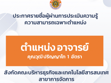 ประกาศรายชื่อผู้ผ่านการประเมินความรู้ความสามารถเฉพาะตำแหน่ง ตำแหน่ง อาจารย์ ๑ อัตรา คุณวุฒิ ปริญญาโท สาขาการจัดการ สังกัดคณะบริหารธุรกิจและเทคโนโลยีสารสนเทศ กุมภาพันธ์ 20, 2026กุมภาพันธ์ 20, 2026ประชาสัมพันธ์ประชาสัมพันธ์, รับสมัครงาน