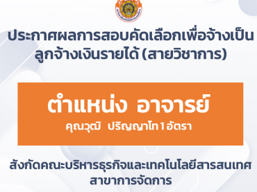ประกาศผลการสอบคัดเลือกเพื่อจ้างเป็นลูกจ้างเงินรายได้ (สายวิชาการ) ตำแหน่ง อาจารย์ ๑ อัตรา คุณวุฒิ ปริญญาโท สาขาการจัดการ สังกัดคณะบริหารธุรกิจและเทคโนโลยีสารสนเทศ กุมภาพันธ์ 20, 2026ประชาสัมพันธ์ประชาสัมพันธ์, รับสมัครงาน