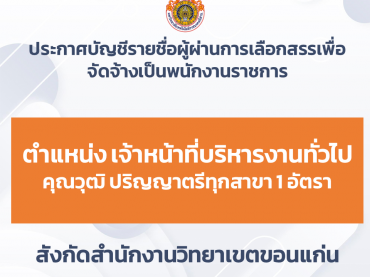 ประกาศรายชื่อผู้ผ่านการประเมินความรู้ความสามารถ ทักษะและสมรรถนะเพื่อเลือกสรรเป็นพนักงานราชการทั่วไป ตำแหน่ง เจ้าหน้าที่บริหารงานทั่วไป ๑ อัตรา คุณวุฒิ ปริญญาตรีทุกสาขา สังกัดสำนักงานวิทยาเขตขอนแก่น กุมภาพันธ์ 20, 2026ประชาสัมพันธ์ประชาสัมพันธ์, รับสมัครงาน