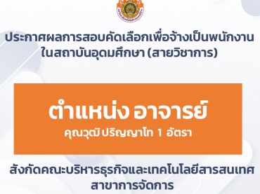 ประกาศผลการสอบคัดเลือกเพื่อจ้างเป็นพนักงานในสถาบันอุดมศึกษา (สายวิชาการ) ตำแหน่ง อาจารย์ ๑ อัตรา คุณวุฒิ ปริญญาโท สาขาการจัดการ สังกัดคณะบริหารธุรกิจและเทคโนโลยีสารสนเทศ กุมภาพันธ์ 27, 2026กุมภาพันธ์ 27, 2026ประชาสัมพันธ์ประชาสัมพันธ์, รับสมัครงาน