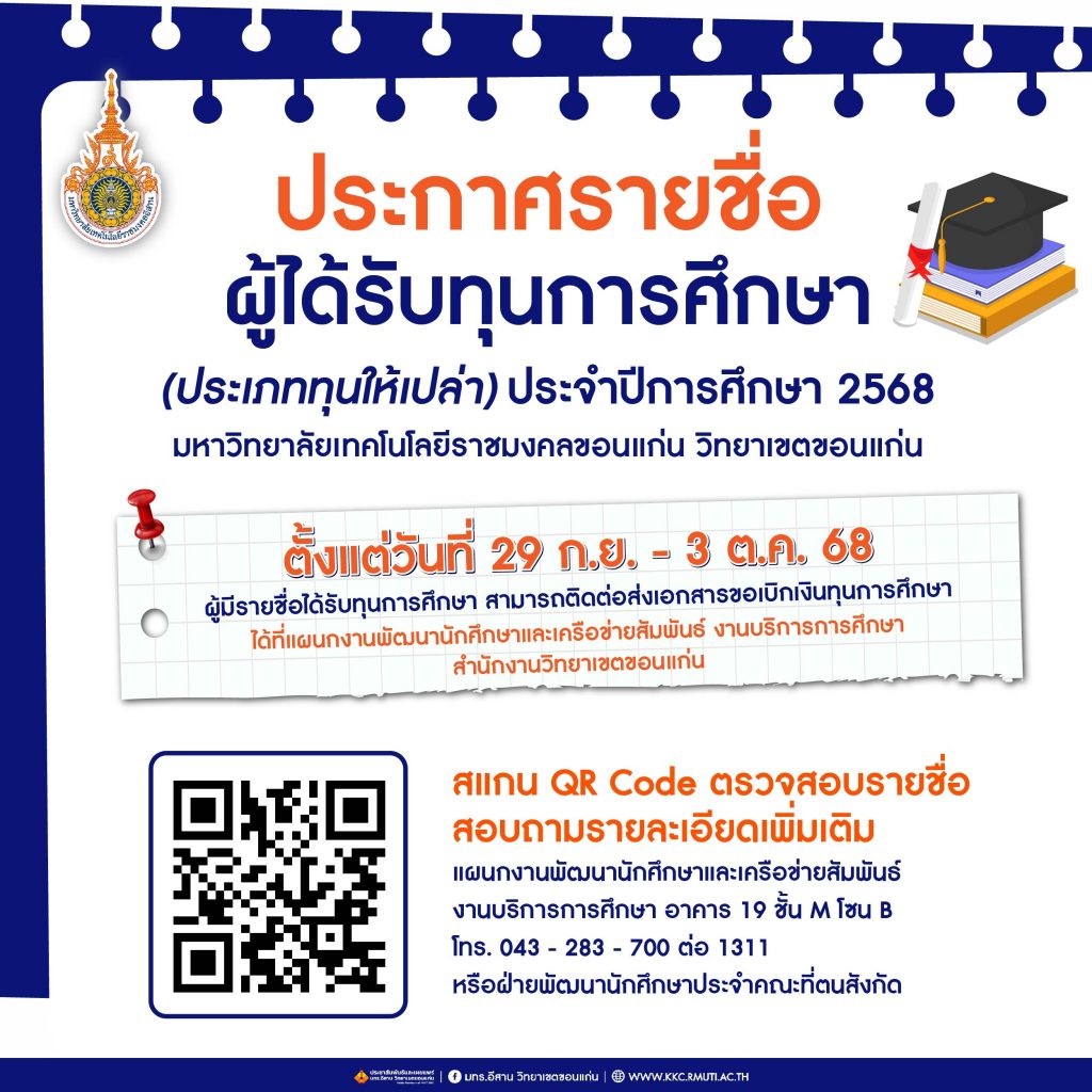 ประกาศรายชื่อผู้ได้รับทุนการศึกษา (ประเภททุนให้เปล่า) ประจำปีการศึกษา 2568 กันยายน 25, 2025ประชาสัมพันธ์ประกาศ, ประชาสัมพันธ์ Facebook iconFacebookTwitter iconTwitterLINE iconLine