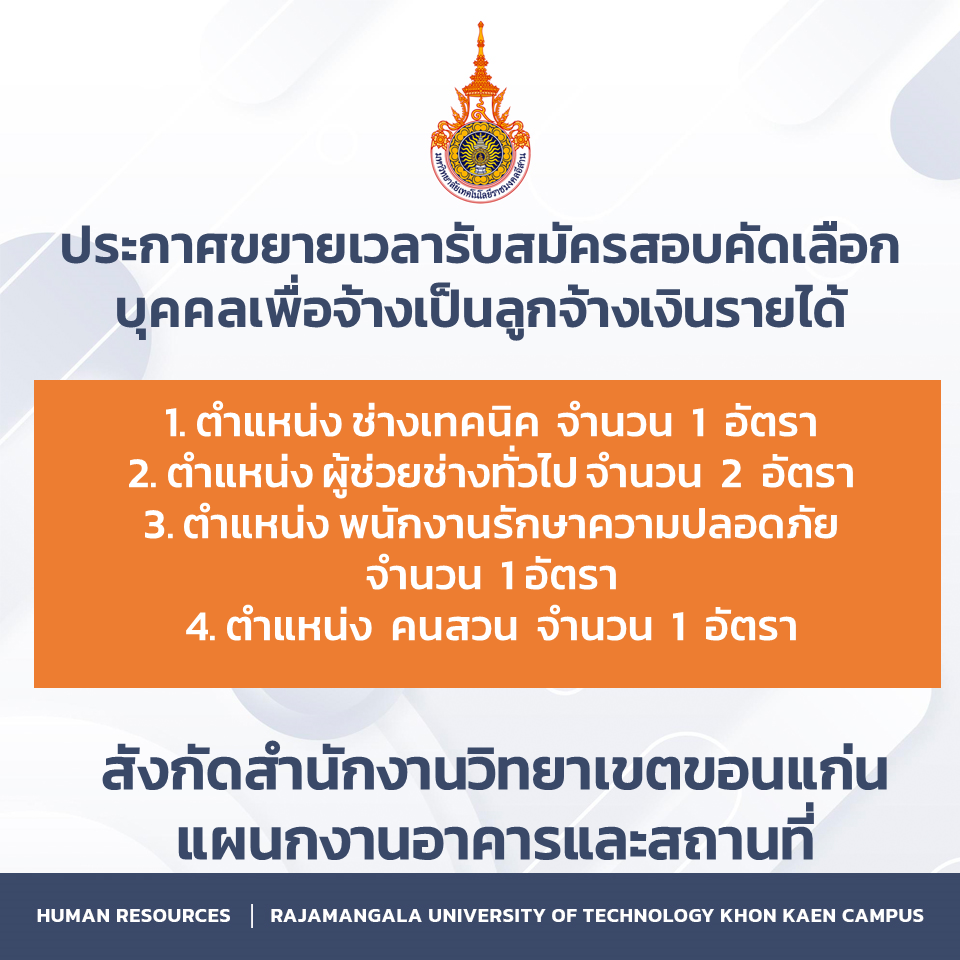 ประกาศขยายเวลารับสมัครสอบคัดเลือกบุคคลเพื่อจ้างเป็นลูกจ้างเงินรายได้ ตำแหน่ง ช่างเทคนิค จำนวน ๑ อัตรา ตำแหน่ง ผู้ช่วยช่างทั่วไป จำนวน ๒ อัตรา ตำแหน่ง พนักงานรักษาความปลอดภัย จำนวน ๑ อัตรา ตำแหน่ง คนสวน จำนวน ๑ อัตรา สังกัดสำนักงานวิทยาเขตขอนแก่น แผนกงานอาคารและสถานที่