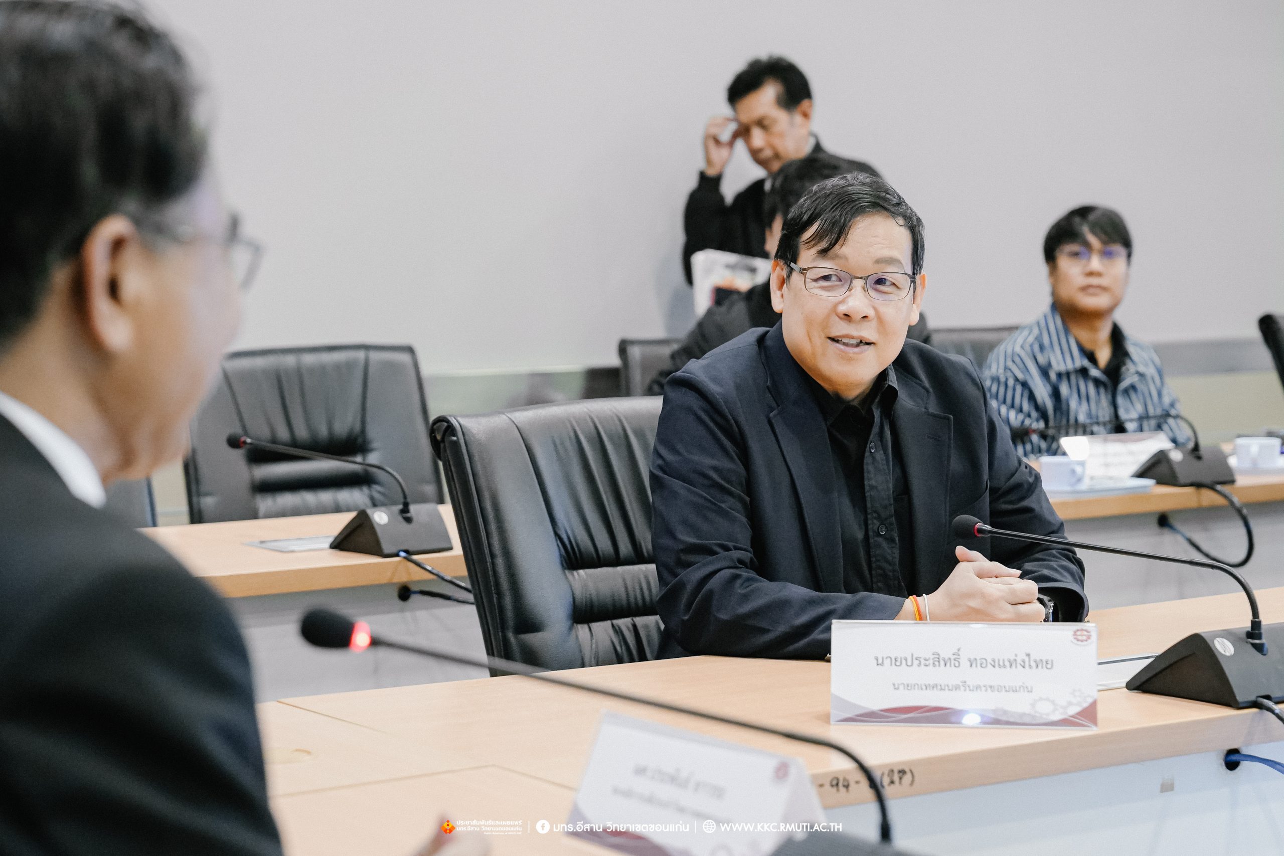 โอกาสนี้ นายกเทศมนตรีนครขอนแก่น ได้สอบถามและแลกเปลี่ยนความคิดเห็นเกี่ยวกับรายละเอียดแผนงาน โครงการ งบประมาณเกี่ยวกับการพัฒนาระบบขนส่งมวลชน รายละเอียดความคืบหน้าในการดำเนินการ สถานะปัจจุบันของแผนงานโครงการ รวมถึงปัญหา อุปสรรค และแนวทางการแก้ไข เพื่อการพัฒนาระบบขนส่งมวลชนรถไฟฟ้า รางเบา ขอนแก่นโมเดล และการขับเคลื่อนเมืองจากความร่วมมือทุกภาคส่วน ในหัวข้อต่าง ๆ ดังนี้ ข้อมูลนโยบายการพัฒนามหาวิทยาลัยเทคโนโลยีราชมงคลอีสานด้านยุทธศาสตร์ ระบบราง โดย ผศ.ประพันธ์ ยาวระ รองอธิการบดีประจำวิทยาเขตขอนแก่น รายงานความเกี่ยวเนื่องด้านการศึกษา หลักสูตรที่เกี่ยวข้องและการเชื่อมโยงข้อมูลการทำงานระหว่างหน่วยงาน โดย ผศ.ดร.ศุภฤกษ์ ชามงคลประดิษฐ์ คณบดีคณะวิศวกรรมศาสตร์ รายงานผลการดำเนินการโครงการพัฒนาระบบขนส่งทางราง มทร.อีสาน วิทยาเขตขอนแก่น โดย อาจารย์ ดร.ไพวรรณ เกิดตรวจ หัวหน้าโครงการวิจัยและพัฒนาระบบขนส่งทางราง