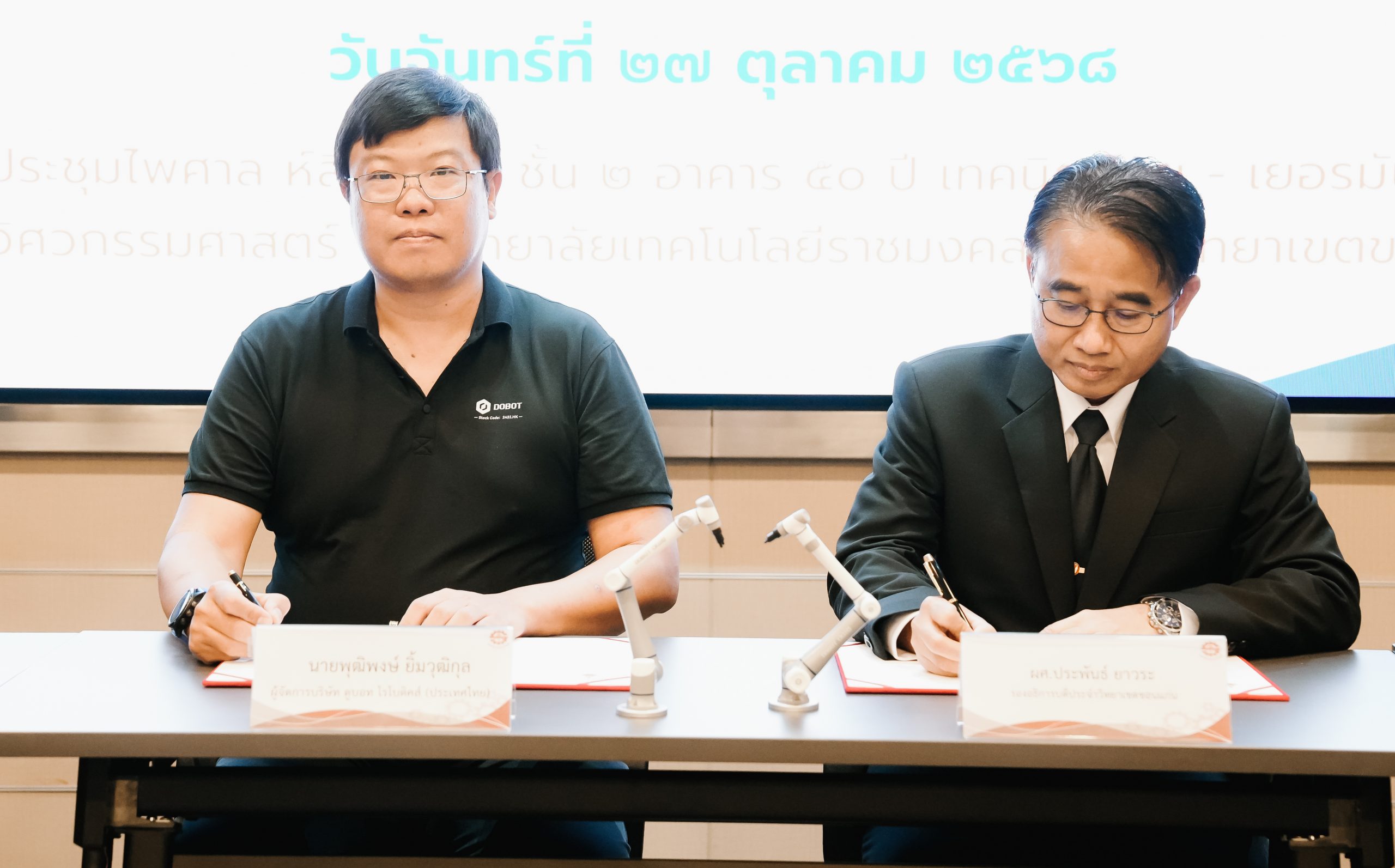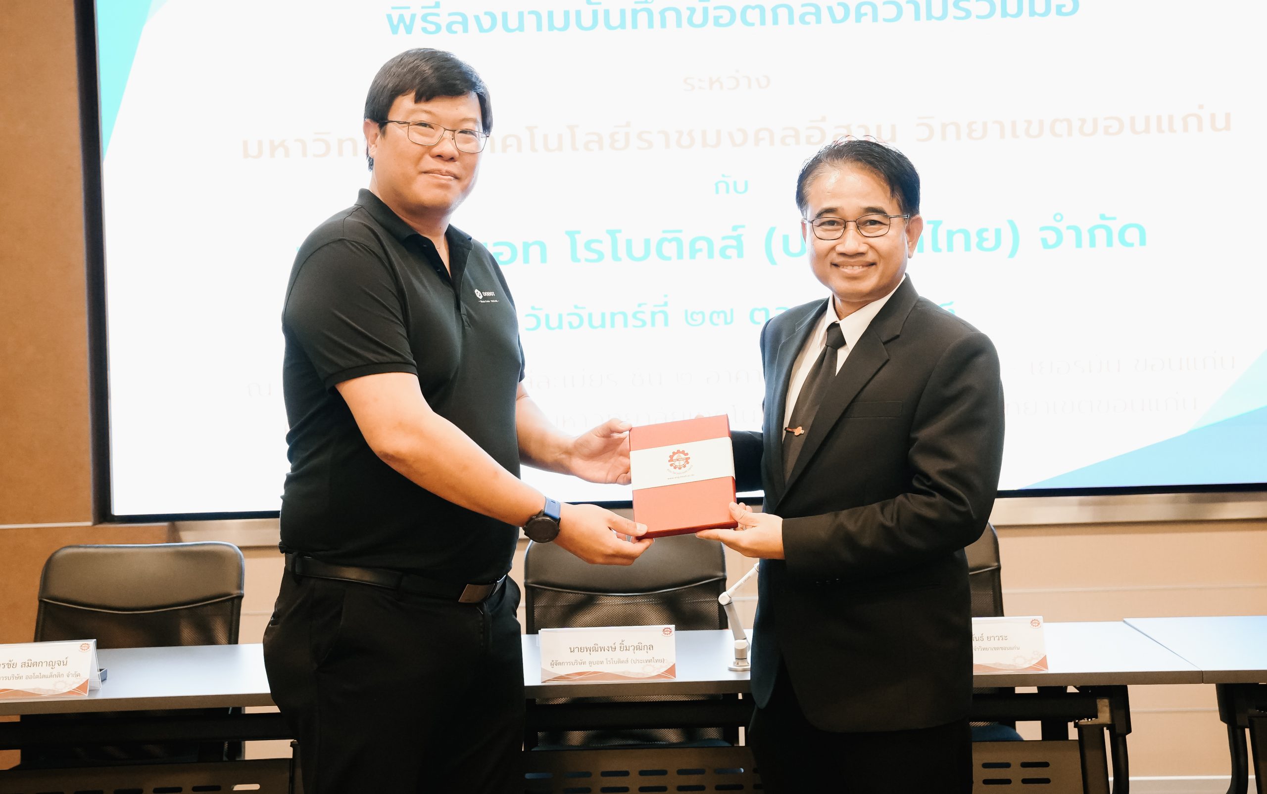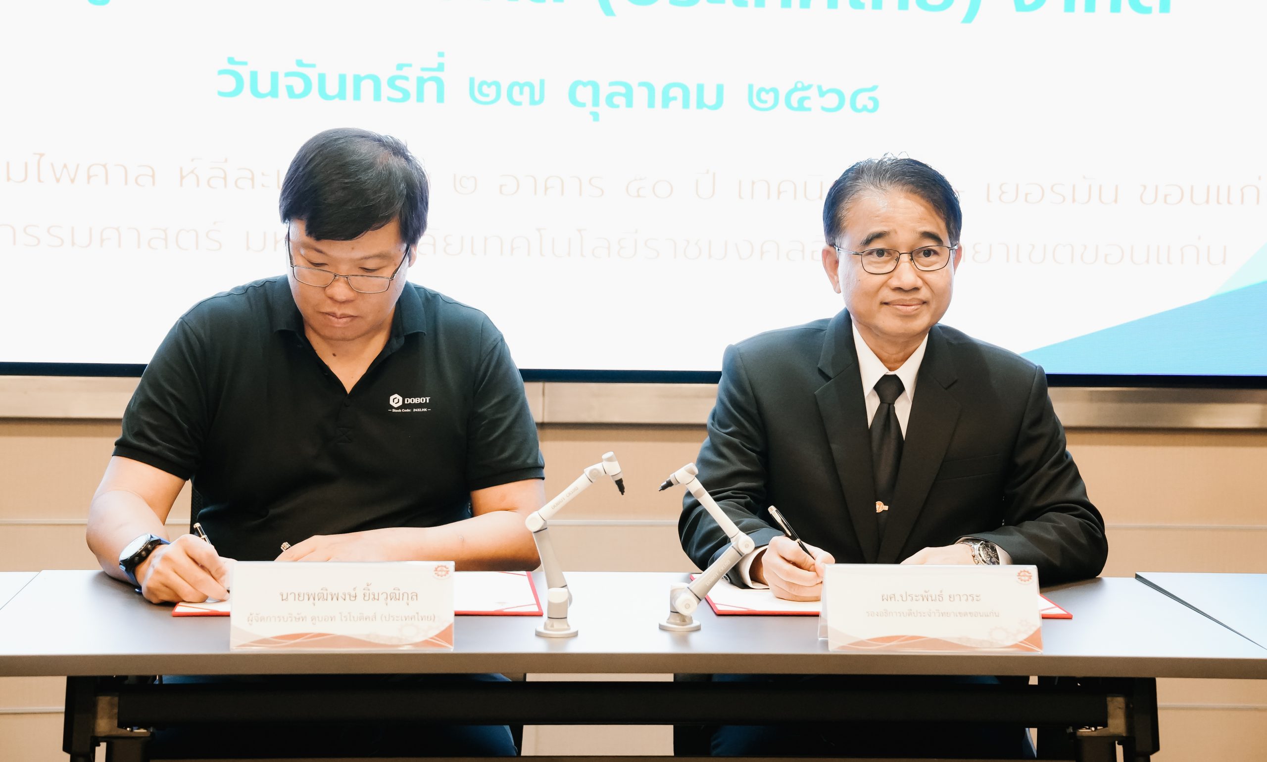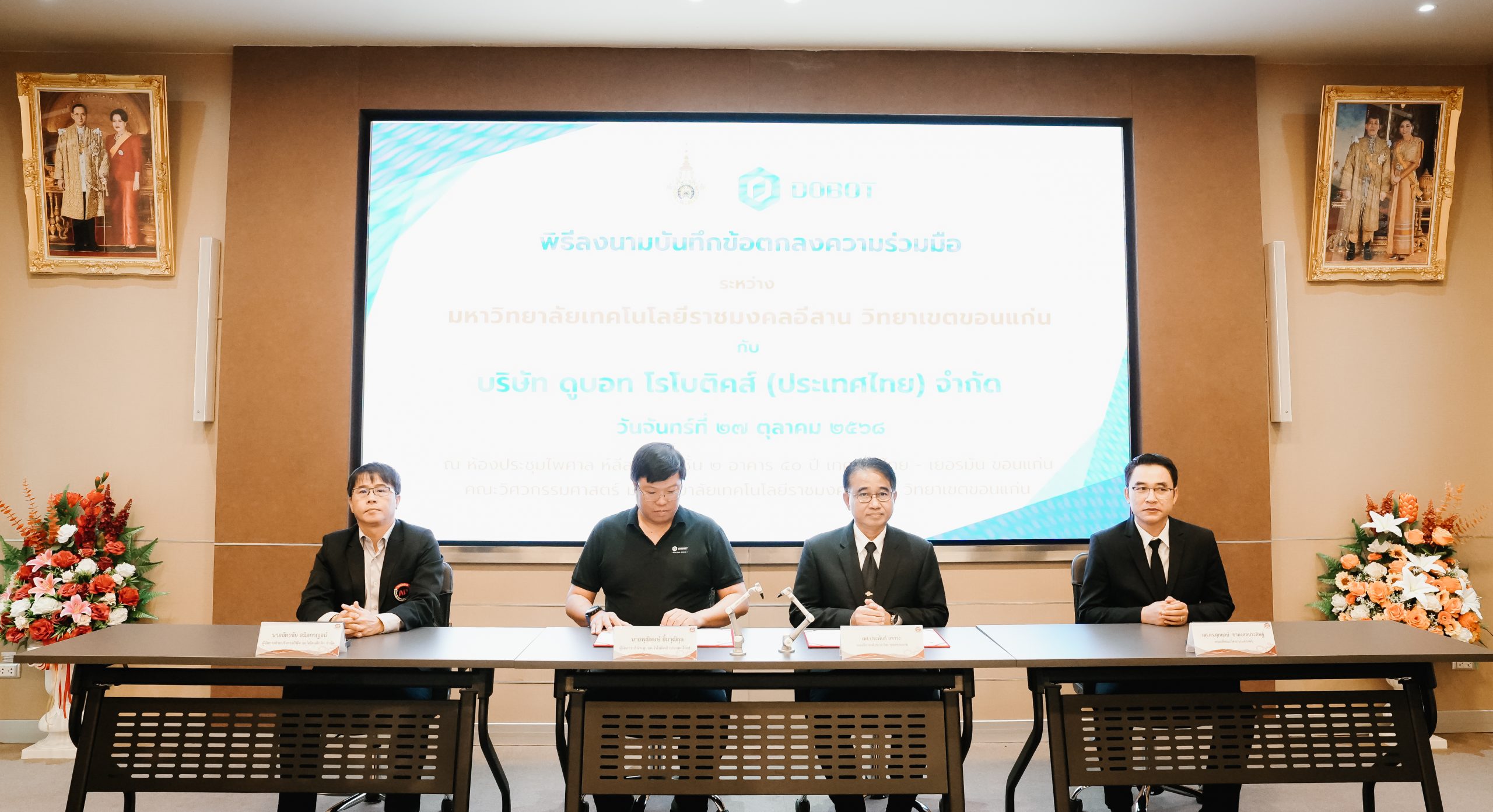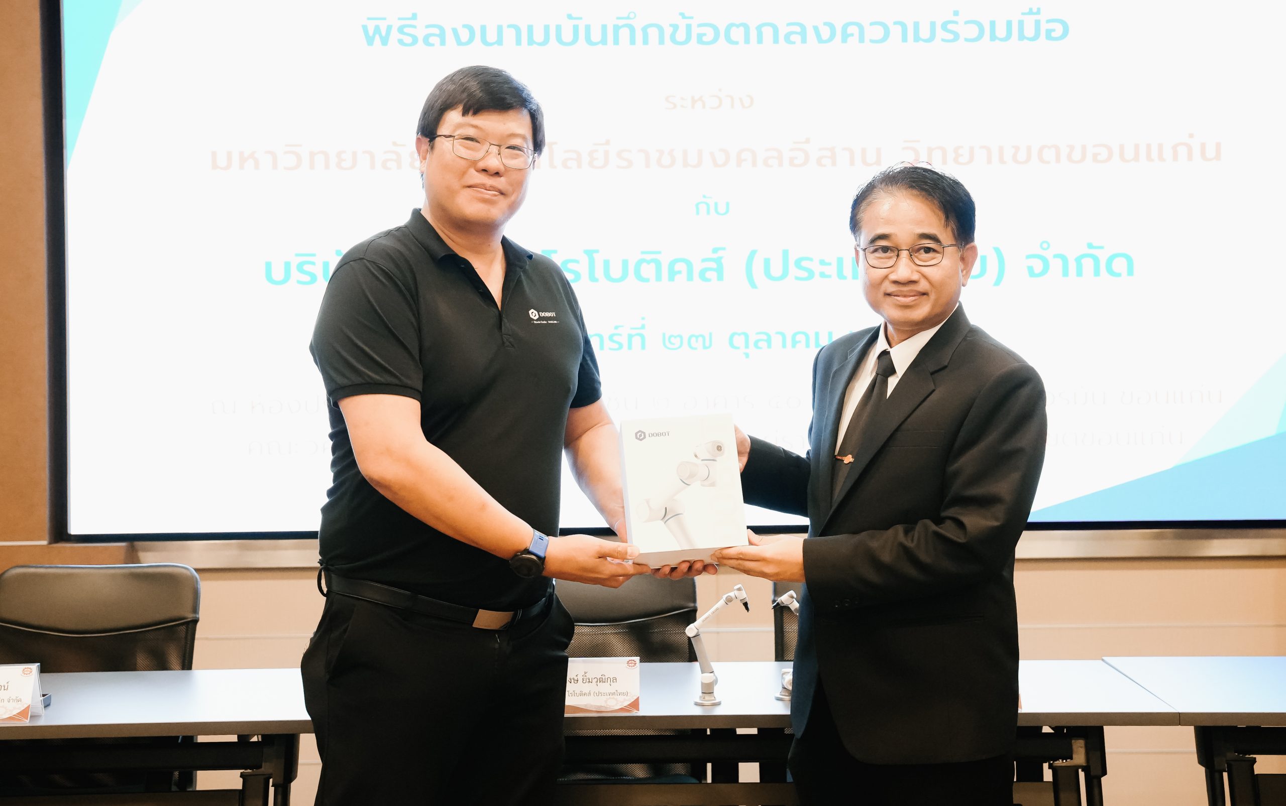 วันจันทร์ที่ 27 ตุลาคม 2568 ผศ.ประพันธ์ ยาวระ รองอธิการบดีประจำวิทยาเขตขอนแก่น เป็นประธานการลงนาม ระหว่างมหาวิทยาลัยเทคโนโลยีราชมงคลอีสาน วิทยาเขตขอนแก่น กับ บริษัท ดูบอท โรโบติคส์ (ประเทศไทย) จำกัด โดยคุณพุฒิพงษ์ ยิ้มวุฒิกุล ผู้จัดการประจำประเทศไทย ได้รับเกียรติจาก ผศ.ดร.ศุภฤกษ์ ชามงคลประดิษฐ์ คณบดีคณะวิศวกรรมศาสตร์ ผศ.ดร.วิรัช ชินพลอย คณบดีคณะครุศาสตร์อุตสาหกรรม ผศ.ดร.อดิเรก จันตะคุณ รองคณบดีฝ่ายบริหาร อาจารย์ขุนแผน ปฏิมาประกร รองคณบดีฝ่ายพัฒนานักศึกษา อาจารย์ปริญ นาชัยสิทธิ์ ที่ปรึกษาคณะวิศวกรรมศาสตร์ ร่วมเป็นสักขีพยานในพิธีลงนาม ณ ห้องประชุมเคิร์ต ชโรยเดอร์ อาคาร 50 ปี เทคนิค ไทย – เยอรมัน ขอนแก่น