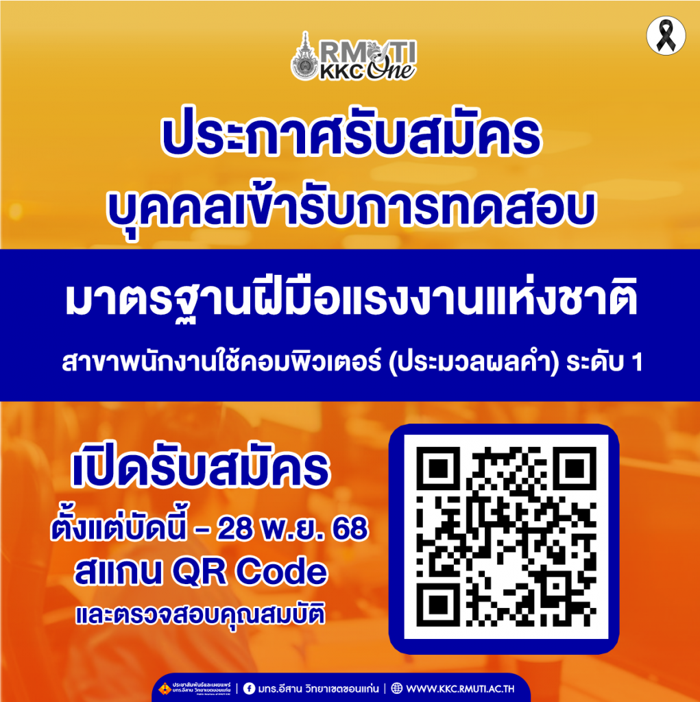 ประกาศรับสมัคร ผู้การทดสอบมาตรฐานฝีมือแรงงานแห่งชาติ สาขาพนักงานใช้คอมพิวเตอร์ (ประมวลผลคำ) ระดับ 1 พฤศจิกายน 7, 2025ประชาสัมพันธ์ประชาสัมพันธ์ Facebook iconFacebookTwitter iconTwitterLINE iconLine