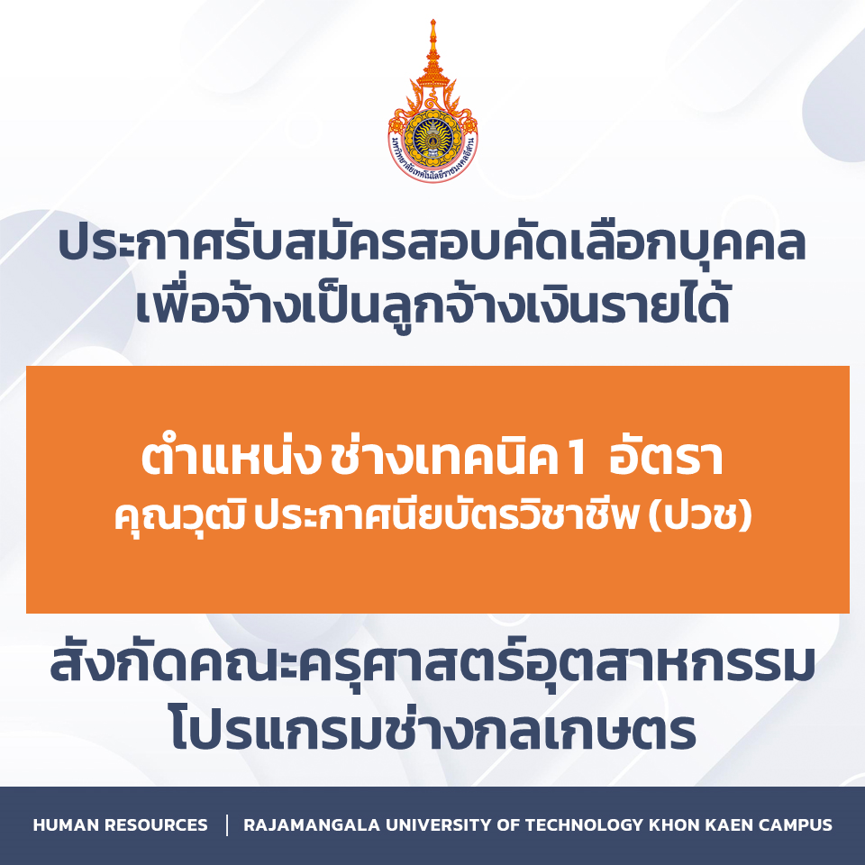ประกาศรับสมัครสอบคัดเลือกบุคคลเพื่อจ้างเป็นลูกจ้างเงินรายได้ ตำแหน่ง ช่างเทคนิค จำนวน ๑ อัตรา คุณวุฒิ ประกาศนียบัตรวิชาชีพชั้น (ปวช.) สังกัดคณะครุศาสตร์อุตสาหกรรม โปรแกรมช่างกลเกษตร พฤศจิกายน 14, 2025พฤศจิกายน 14, 2025ประชาสัมพันธ์ประชาสัมพันธ์, รับสมัครงาน ประกาศรับสมัครสอบคัดเลือกบุคคลเพื่อจ้างเป็นลูกจ้างเงินรายได้ตำแหน่ง ช่างเทคนิค จำนวน ๑ อัตราคุณวุฒิ ประกาศนียบัตรวิชาชีพชั้น (ปวช.)สังกัดคณะครุศาสตร์อุตสาหกรรมโปรแกรมช่างกลเกษตรดาวน์โหลด Facebook iconFacebookTwitter iconTwitterLINE iconLine