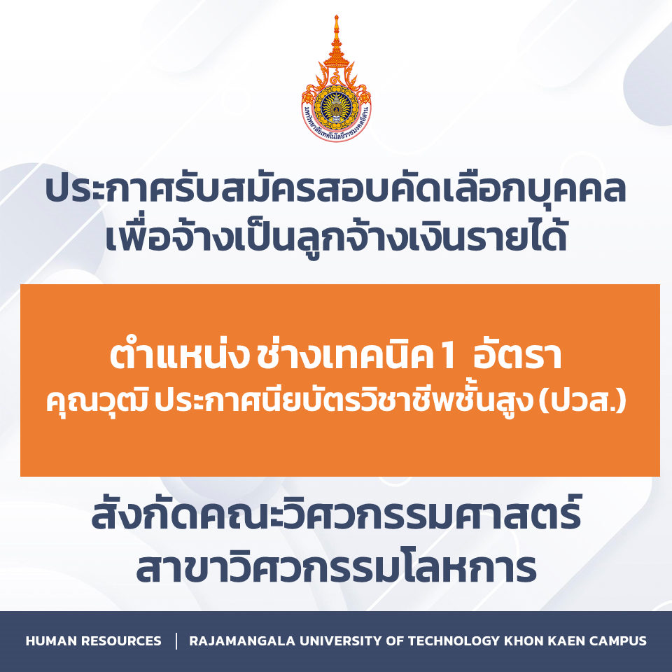 ประกาศรับสมัครสอบคัดเลือกบุคคลเพื่อจ้างเป็นลูกจ้างเงินรายได้ ตำแหน่ง ช่างเทคนิค จำนวน ๑ อัตรา คุณวุฒิ ประกาศนียบัตรวิชาชีพชั้นสูง(ปวส.) สังกัดคณะวิศวกรรมศาสตร์สาขาวิศวกรรมโลหการ พฤศจิกายน 18, 2025พฤศจิกายน 18, 2025ประชาสัมพันธ์ประชาสัมพันธ์, รับสมัครงาน ประกาศรับสมัครสอบคัดเลือกบุคคลเพื่อจ้างเป็นลูกจ้างเงินรายได้ตำแหน่ง ช่างเทคนิค จำนวน ๑ อัตราคุณวุฒิ ประกาศนียบัตรวิชาชีพชั้นสูง(ปวส.)สังกัดคณะวิศวกรรมศาสตร์สาขาวิศวกรรมโลหการดาวน์โหลด Facebook iconFacebookTwitter iconTwitterLINE iconLine