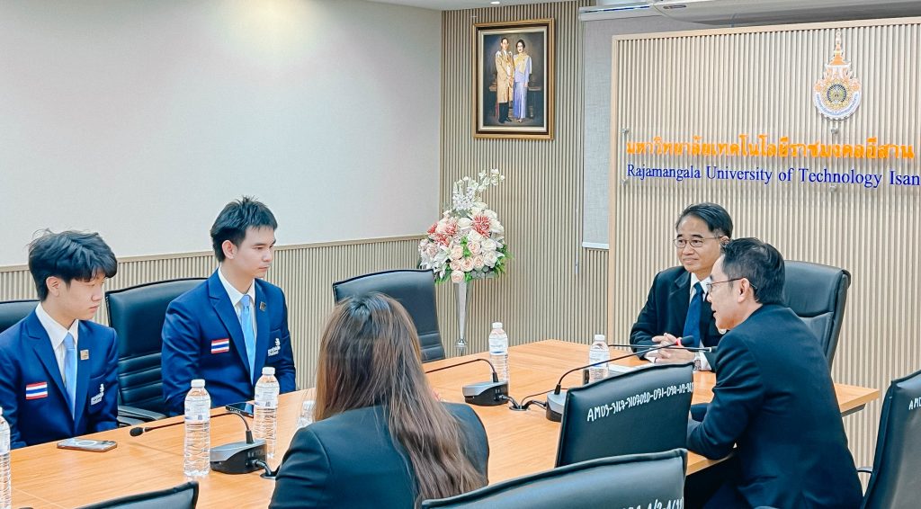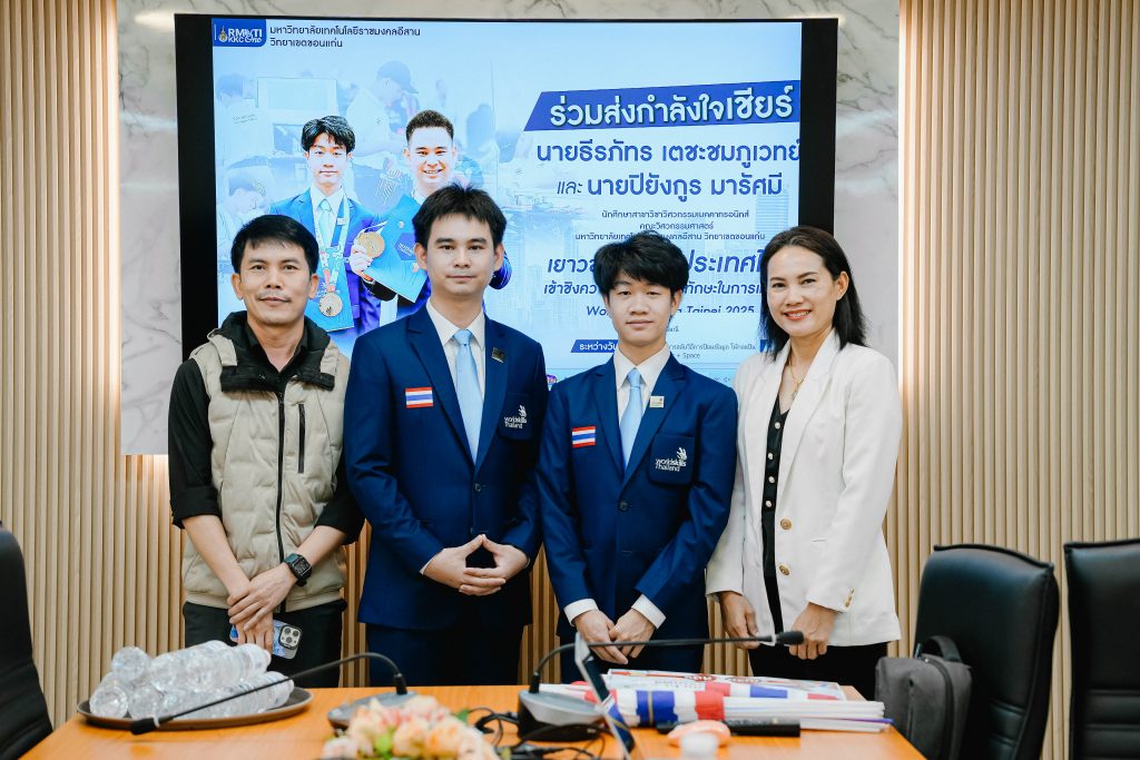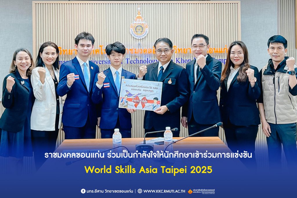 วันพุธที่ 19 พฤศจิกายน พ.ศ. 2568 เวลา 13.00 น. ณ ห้องประชุมประดู่ 1 ชั้น M อาคารเฉลิมพระเกียรติ 72 พรรษา มหาวิทยาลัยเทคโนโลยีราชมงคลอีสาน วิทยาเขตขอนแก่น โดย ผศ.ประพันธ์ ยาวระ รองอธิการบดีประจำวิทยาเขตขอนแก่น พร้อมด้วย ผศ.ดร.ศุภฤกษ์ ชามงคลประดิษฐ์ คณบดีคณะวิศวกรรมศาสตร์ อาจารย์ฐิติพร จันทร์ดา รองคณบดีฝ่ายพัฒนานักศึกษา คณะครุศาสตร์อุตสาหกรรม ร่วมกล่าวอวยพรให้กำลังใจ พร้อมสนับสนุนค่าใช้จ่ายบัตรโดยสารการเดินทางไปกลับ ขอนแก่น – สุวรรณภูมิ ให้แก่นายธีรภัทร เตชะชมภูเวทย์ และนายปิยังกูร มารัศมี นักศึกษาสาขาวิชาวิศวกรรมเมคคาทรอนิกส์ คณะวิศวกรรมศาสตร์ ตัวแทนนักศึกษาทีมชาติไทย สาขาเมคคาทรอนิกส์ (ประเภททีม) (Mechatronics) ก่อนเดินทางไปร่วมการเเข่งขันฝีมือเเรงงานเอเชีย ครั้งที่ 3 (WorldSkills Asia Taipei 2025) ซึ่งจัดขึ้นระหว่างวันที่ 25 พฤศจิกายน – 1 ธันวาคม 2568 ณ ศูนย์นิทรรศการไทเปหนานกัง (TaiNEX) (Taipei Nangang Exhibition Center) เขตหนานกัง ไทเป ไต้หวัน