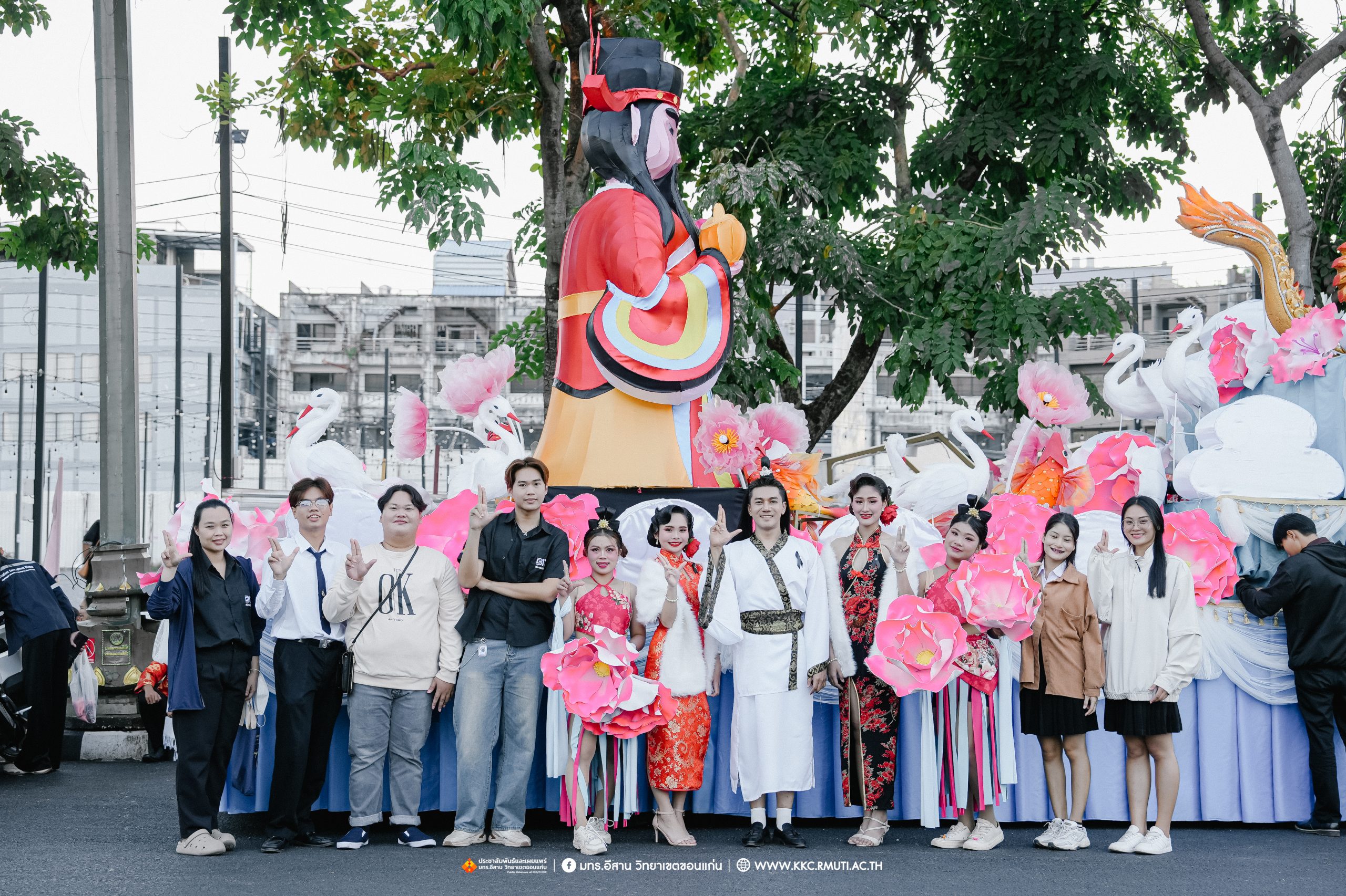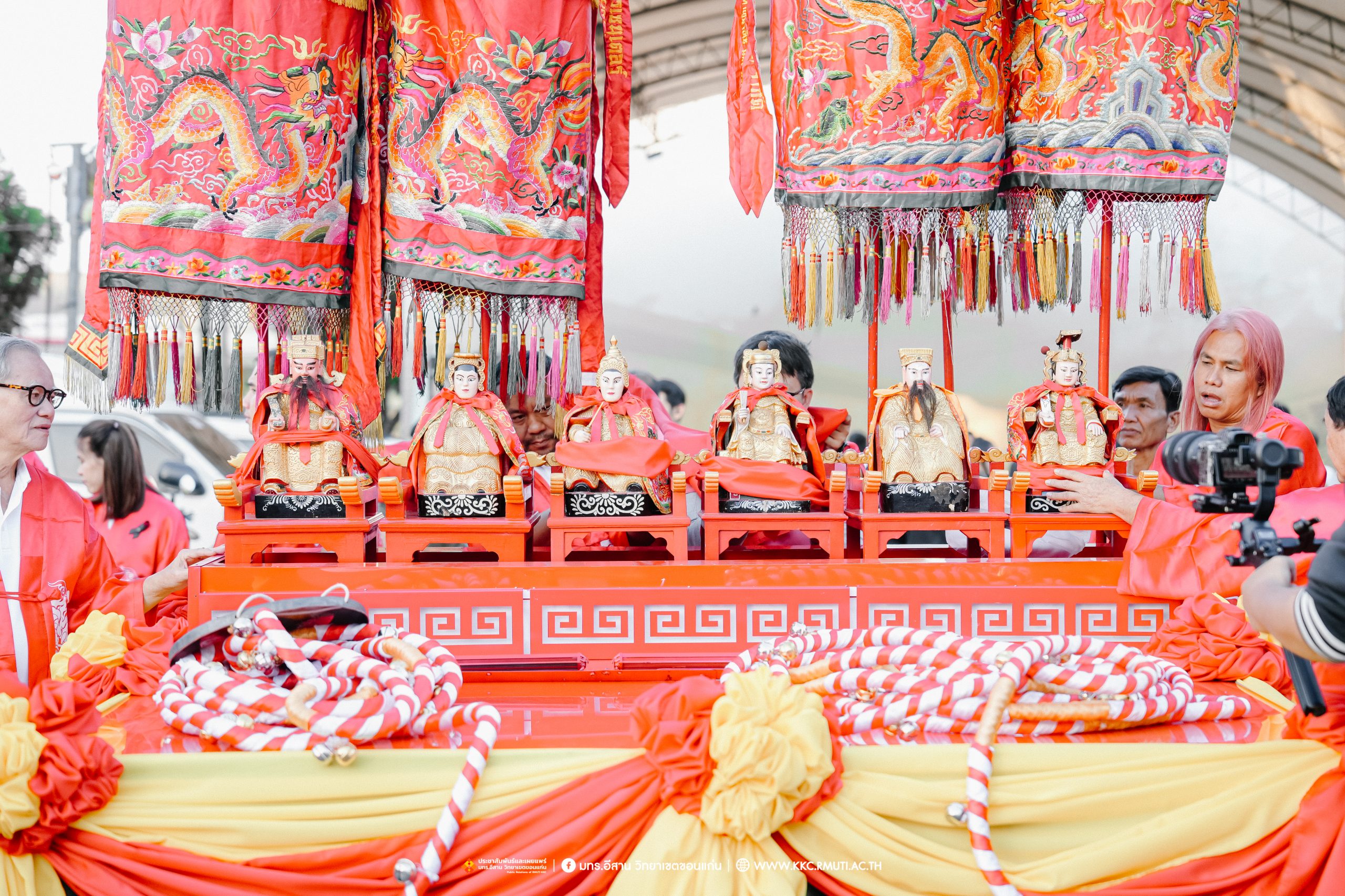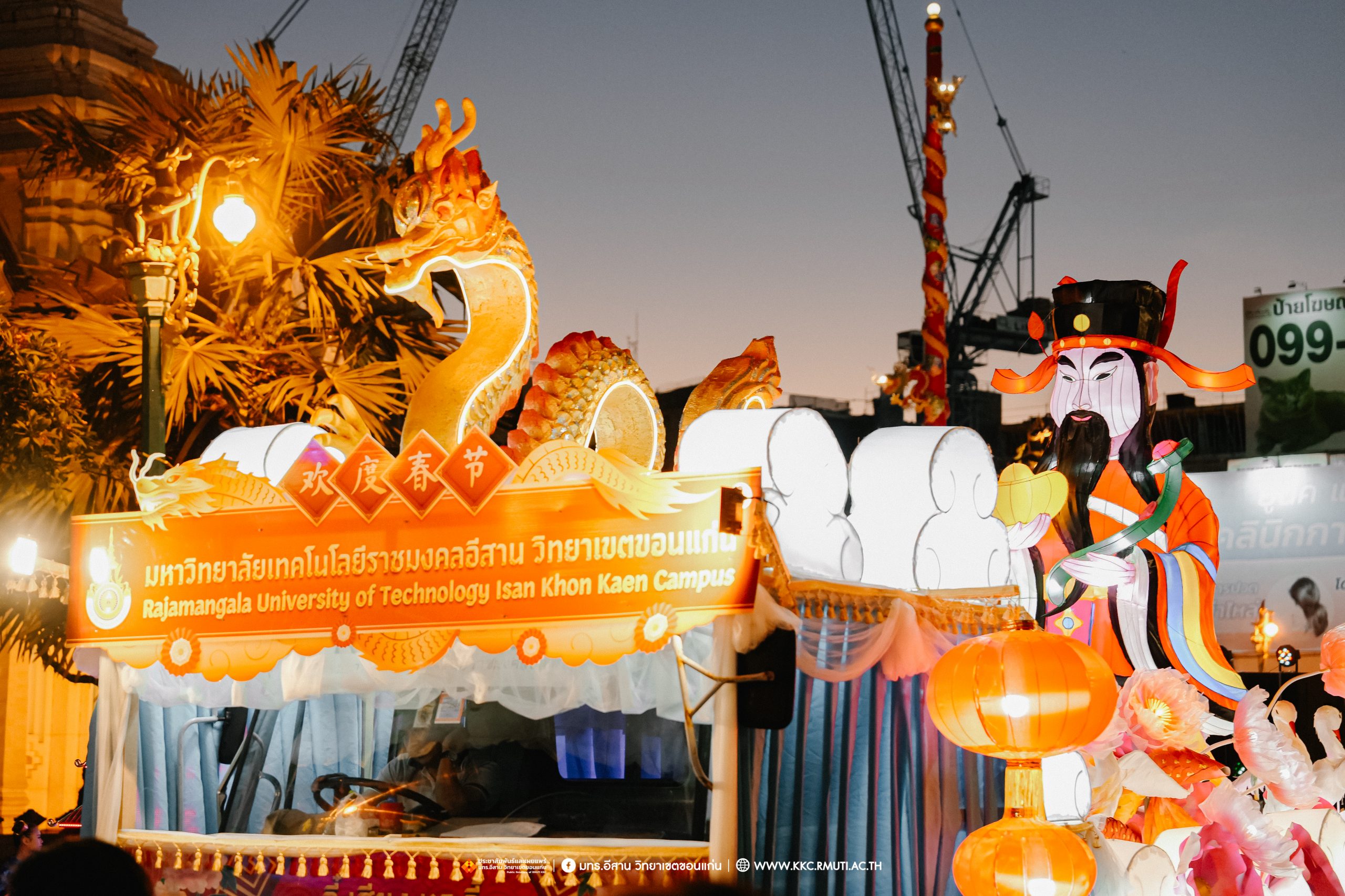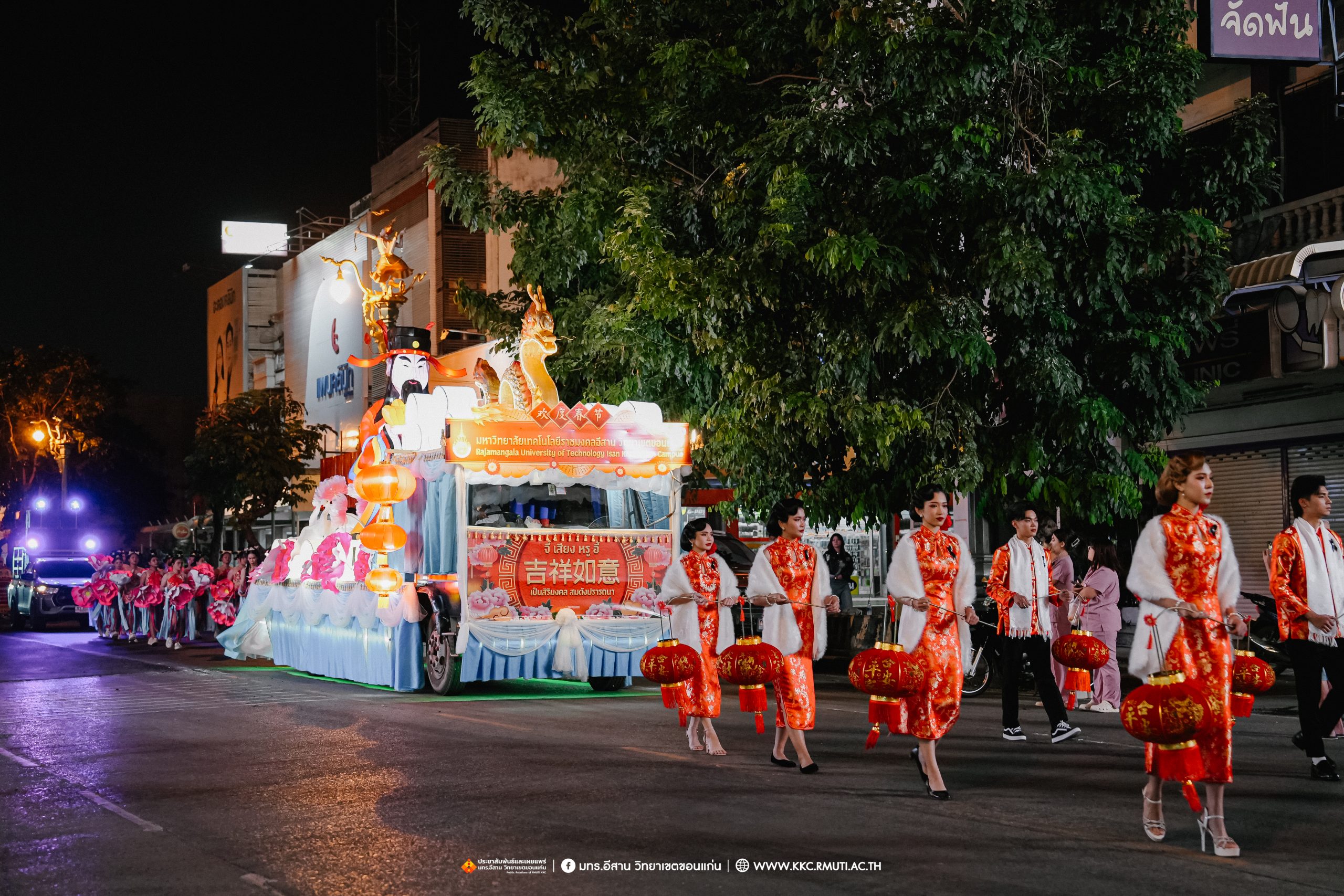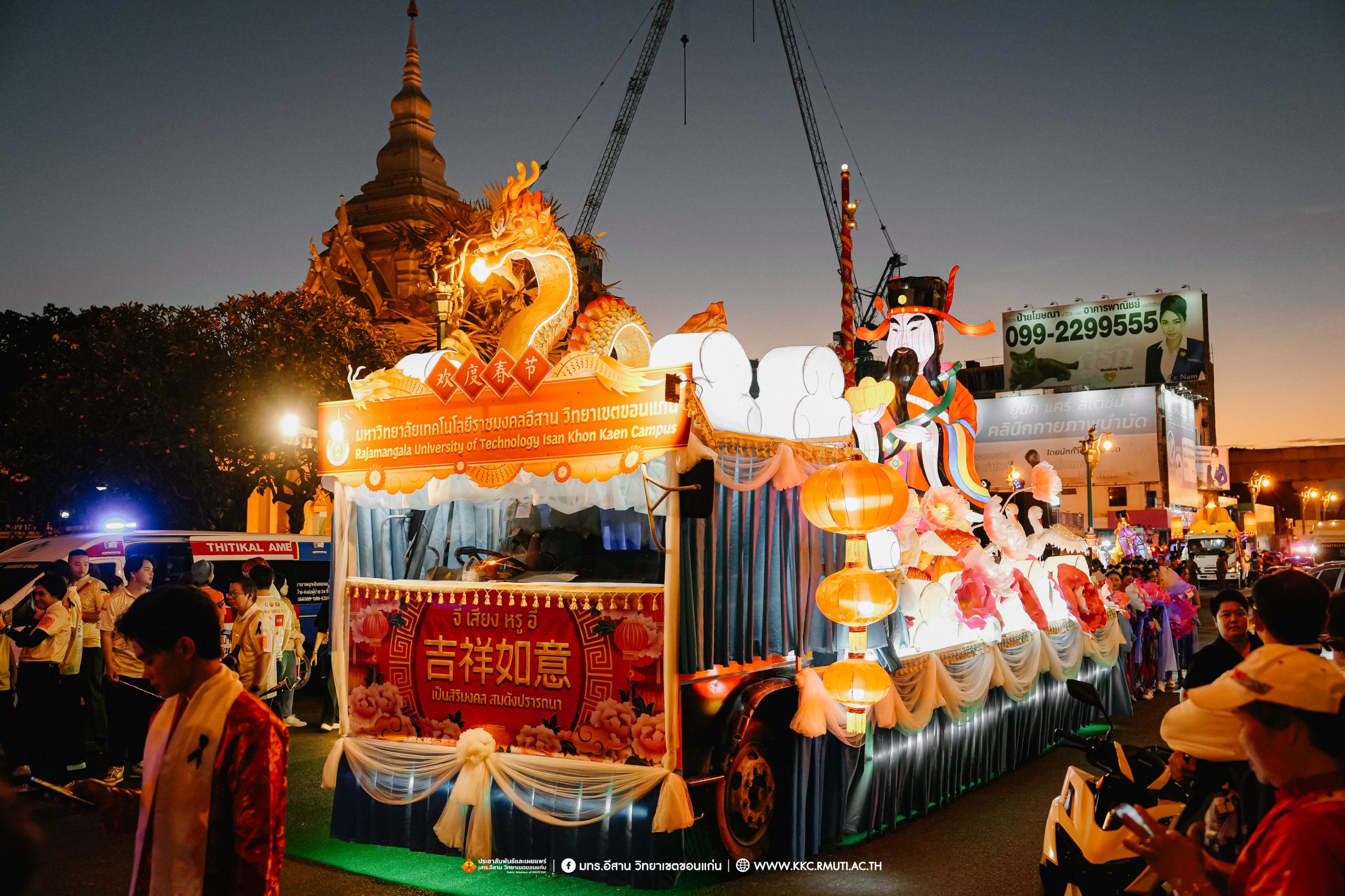 การร่วมขบวนแห่งานสมโภชฯ ในครั้งนี้ มทร.อีสาน วิทยาเขตขอนแก่น เป็นขบวนลำดับที่ 3 ได้ตกแต่งขบวนรถโดยมีกรอบแนวคิดมุ่งเน้นในเรื่องของความเป็นสิริมงคลให้แก่ประชาชนทุกที่ได้ร่วมชมขบวนแห่ จึงได้อัญเชิญสิ่งศักดิ์สิทธิ์ต่าง ๆ มาร่วมอวยพรแด่ชาวขอนแก่นทุกท่านให้คิดหวังสิ่งใด ขอให้สมดังปรารถนา ร่ำรวยเป็นเศรษฐี มีสมบัติก้อนโต ประกอบไปด้วย องค์เทพเจ้าไฉ่ซิงเอี้ย ซึ่งเป็นเทพเจ้าแห่งความร่ำรวย มั่งคั่งและการได้รับโชคลาภด้านเงินทอง กิจการงานรุ่งเรือง พร้อมด้วยมังกรทอง สัตว์เทพเจ้าที่ทรงพลังและศักดิ์สิทธิ์ที่สุดแห่งฟ้าและดิน สัญลักษณ์แห่งความเป็นสิริมงคล อำนาจ ความยิ่งใหญ่ ความอุดมสมบูรณ์ และโชคลาภ นกกระเรียน ซึ่งตามความเชื่อของจีน นกกระเรียนเป็นอีกหนึ่งสัญลักษณ์ของการมีอายุยืน ความเป็นอมตะ สุขภาพแข็งแรง รวมถึงการมีความรักที่ยืนยาวมั่นคง ดอกโบตั๋น ดอกไม้ที่ได้รับการยกย่องว่าเป็นดอกไม้แห่งความสง่างาม และความโชคดีมาตั้งแต่อดีต ซึ่งในวัฒนธรรมจีนดอกโบตั๋นยังถูกขนานนามว่าเป็นดอกไม้แห่งจักรพรรดิ โคมเต็งลั้ง สื่อถึงความเป็นสิริมงคล ความเจริญรุ่งเรือง และความสุข เดิมมีความเชื่อความโคมไฟจะช่วยนำพาโชคลาภสู่บ้านเรือน และเป็นสัญลักษณ์ชี้นำให้สิ่งศักดิ์สิทธ์มองเห็นเพื่อประทานพรให้แก่ชาวขอนแก่น