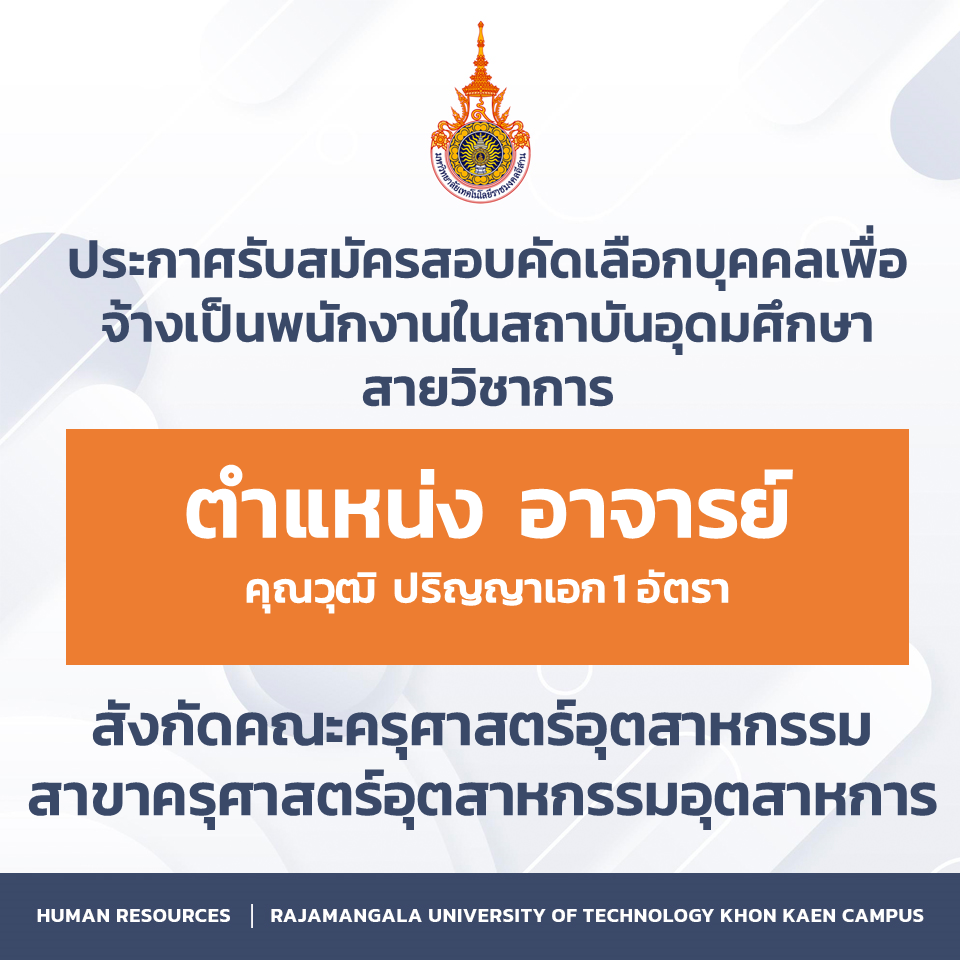 ประกาศรับสมัครสอบคัดเลือกบุคคลเพื่อจ้างเป็นพนักงานในสถาบันอุดมศึกษา สายวิชาการ ตำแหน่ง อาจารย์ จำนวน ๑ อัตรา คุณวุฒิ ปริญญาเอก สังกัดคณะครุศาสตร์อุตสาหกรรม สาขาครุศาสตร์อุตสาหกรรมอุตสาหการ พฤศจิกายน 27, 2025พฤศจิกายน 27, 2025ประชาสัมพันธ์ประชาสัมพันธ์, รับสมัครงาน ประกาศรับสมัครสอบคัดเลือกบุคคลเพื่อจ้างเป็นพนักงานในสถาบันอุดมศึกษา สายวิชาการตำแหน่ง อาจารย์จำนวน ๑ อัตราคุณวุฒิ ปริญญาเอกสังกัดคณะครุศาสตร์อุตสาหกรรมสาขาครุศาสตร์อุตสาหกรรมอุตสาหการดาวน์โหลด Facebook iconFacebookTwitter iconTwitterLINE iconLine