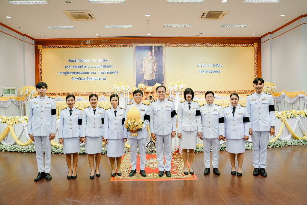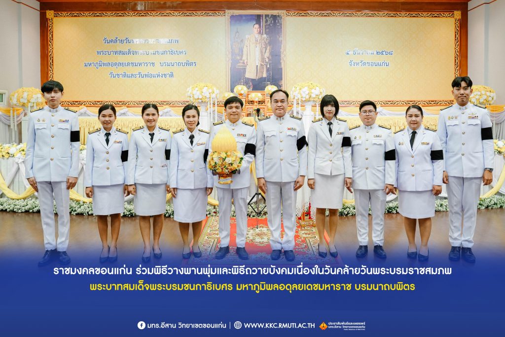 รองอธิการบดีประจำวิทยาเขตขอนแก่นและอาจารย์ ดร.อารีรัตน์ เชื้อบุญเกิด โนท คณบดีคณะบริหารธุรกิจและเทคโนโลยีสารสนเทศ มอบ อาจารย์พัลลภ พรมสาเพ็ชร ผู้ช่วยคณบดีฝ่ายพัฒนานักศึกษา พร้อมด้วย อาจารย์ ดร.ฉัตรชัย สุตีกษณะ ผู้ช่วยคณบดีฝ่ายบริหาร คณะบริหารธุรกิจและเทคโนโลยีสารสนเทศ นำคณะผู้บริหาร คณาจารย์ และบุคลากร ร่วมในพิธีวางพานพุ่มและพิธีถวายบังคม เนื่องในวันพระบรมราชสมภพ พระบาทสมเด็จพระบรมชนกาธิเบศร มหาภูมิพลอดุลยเดชมหาราช บรมนาถบพิตร วันที่ 5 ธันวาคม 2568 โดยมี นายขจรเกียรติ รักพานิชมณี ผู้ว่าราชการจังหวัดขอนแก่น เป็นประธานในพิธี ณ ห้องประชุมแก่นเมือง ศาลากลางจังหวัดขอนแก่น