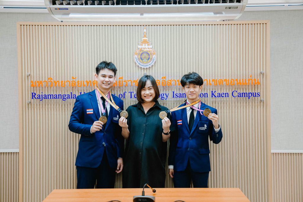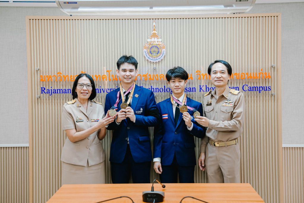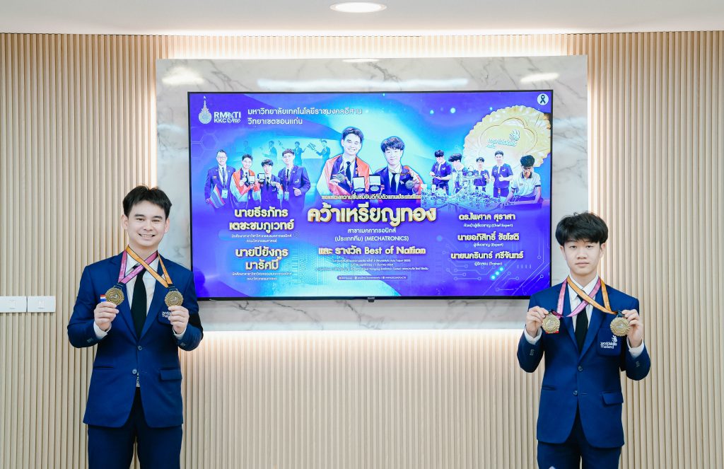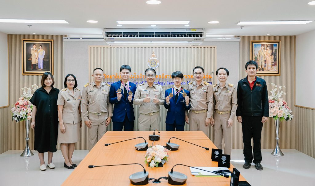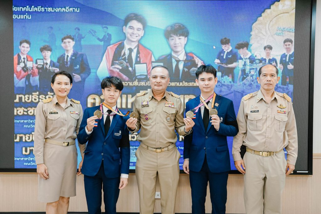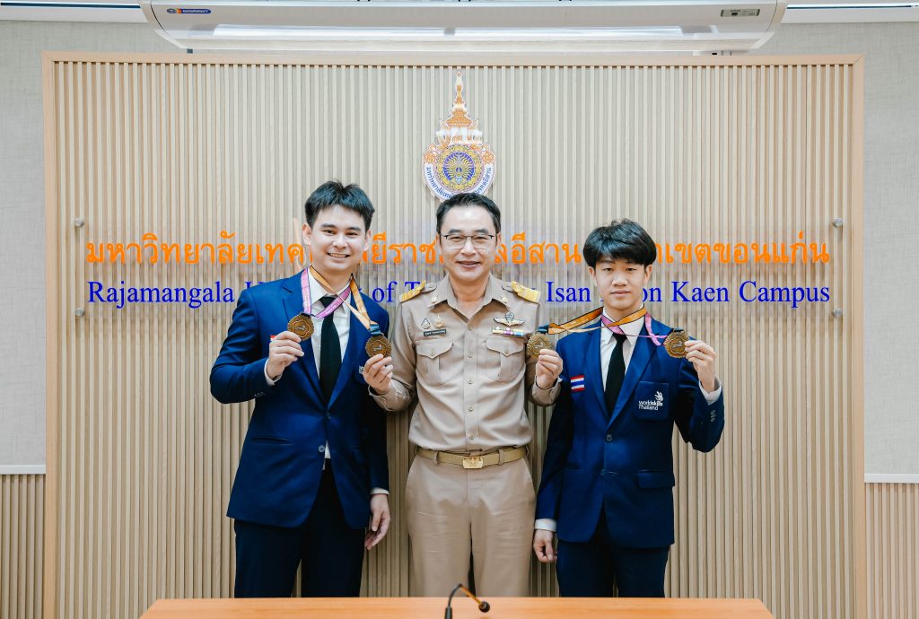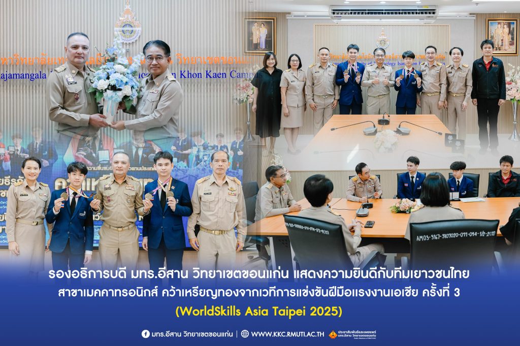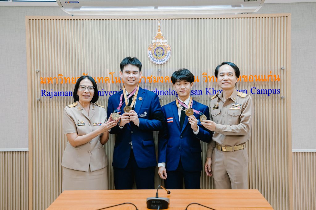วันจันทร์ที่ 8 ธันวาคม พ.ศ. 2568 เวลา 09.30 น. ณ ห้องประชุมประดู่ 1 อาคารเฉลิมพระเกียรติ 72 พรรษา (อาคาร 19) มหาวิทยาลัยเทคโนโลยีราชมงคลอีสาน วิทยาเขตขอนแก่น โดย ผศ.ประพันธ์ ยาวระ รองอธิการบดีประจำวิทยาเขตขอนแก่น พร้อมด้วย อาจารย์บุญกิจ อุ่นพิกุล ผู้ช่วยอธิการบดี ผศ.ดร.นทยา กัมพลานนท์ ผู้ช่วยอธิการบดี ผศ.ดร.ศุภฤกษ์ ชามงคลประดิษฐ์ คณบดีคณะวิศวกรรมศาสตร์ ผศ.ดร.วิรัช ชินพลอย คณบดีคณะครุศาสตร์อุตสาหกรรม ผศ.ดร.วนิตา บุญโฉม รองคณบดีฝ่ายแผนและประกันคุณภาพการศึกษา คณบดีคณะบริหารธุรกิจและเทคโนโลยีสารสนเทศ ให้การต้อนรับ นายยอดเมือง ศิริประธาน ผู้อำนวยการสถาบันพัฒนาฝีมือแรงงาน 6 ขอนแก่น พร้อมด้วย นายจรินทร์ พรมสวัสดิ์ ผู้อำนวยการกลุ่มงานมาตรฐานฝีมือแรงงานและรับรองความรู้ความสามารถ สถาบันพัฒนาฝีมือแรงงาน ในโอกาสมอบช่อดอกไม้เพื่อร่วมแสดงความยินดีในความสำเร็จของ นายธีรภัทร เตชะชมภูเวทย์ นายปิยังกูร มารัศมี ผู้ชนะการแข่งขันและได้รับเหรียญทอง สาขาเมคคาทรอนิกส์ (ประเภททีม) และเหรียญ Best Of Nation ระดับเอเชีย จากการแข่งขันฝีมือเเรงงานเอเชีย ครั้งที่ 3 (WorldSkills Asia Taipei 2025) ระหว่างวันที่ 25 พฤศจิกายน – 1 ธันวาคม 2568 ณ ศูนย์นิทรรศการไทเปหนานกัง (TaiNEX) (Taipei Nangang Exhibition Center) เขตหนานกัง ไทเป ไต้หวัน ที่ผ่านมา โดยทีมเยาวชนสาขาเมคคาทรอนิกส์ เป็นนักศึกษาสาขาวิชาเมคคาทรอนิกส์ คณะวิศวกรรมศาสตร์ ภายใต้การดูแลของ อาจารย์ ดร.ปรมัตถ์ จันทรโคตร อาจารย์ประจำสาขาวิศวกรรมเมคคาทรอนิกส์ คณะวิศวกรรมศาสตร์ อาจารย์ที่ปรึกษา ดร.ไพศาล สุราสา นักวิชาการพัฒนาฝีมือแรงงานชำนาญการพิเศษสถาบันฝีมือแรงงาน 6 ขอนแก่น นายอภิสิทธิ์ ชัยโชติ ผู้ควบคุมทีม และนายนครินทร์ ศรีจันทร์ ผู้ฝึกซ้อม