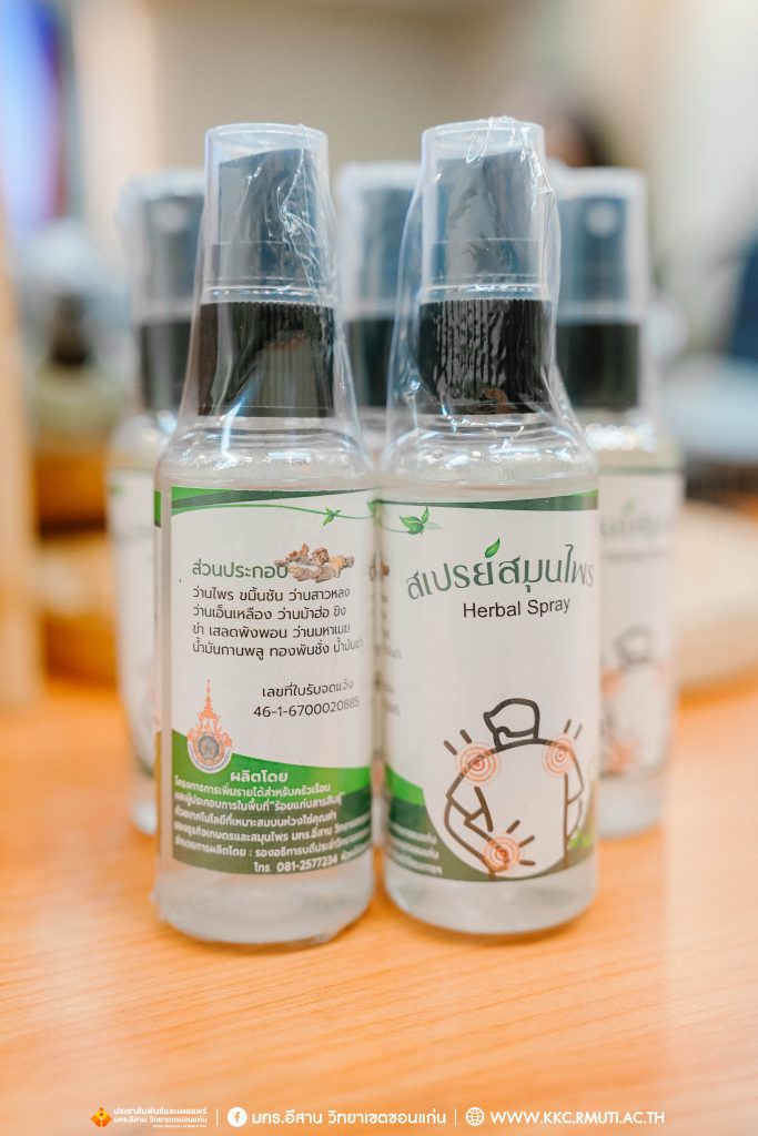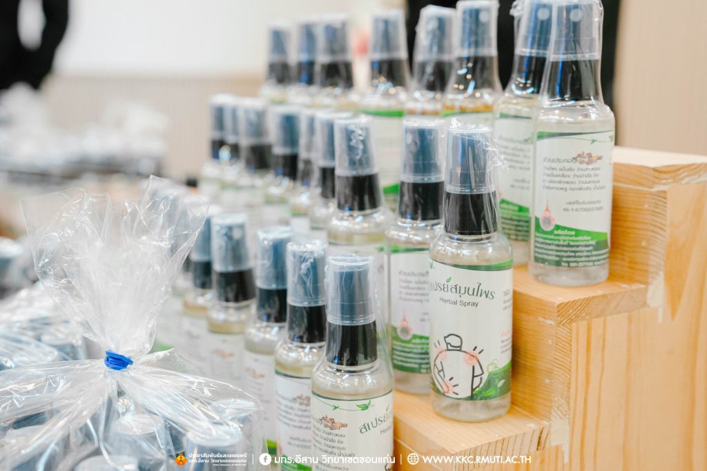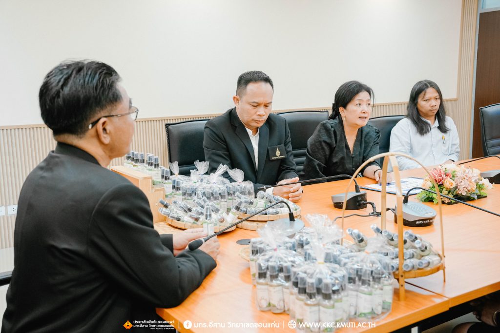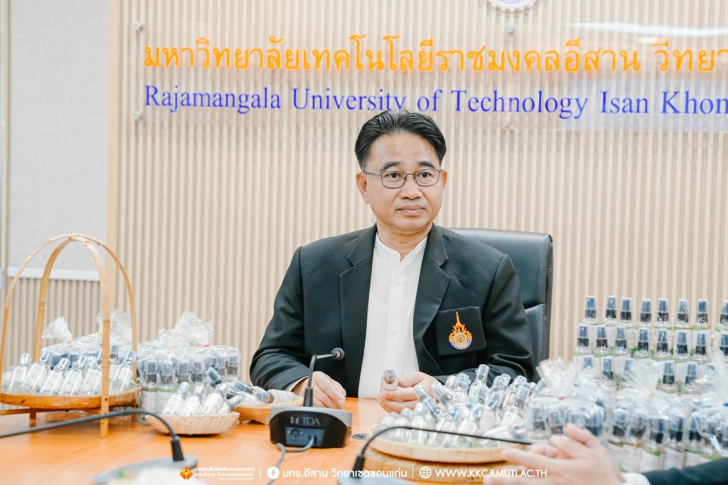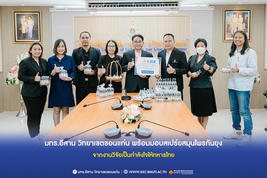 วันพฤหัสบดีที่ 18 ธันวาคม พ.ศ. 2568 ผศ.ประพันธ์ ยาวระ รองอธิการบดีประจำวิทยาเขตขอนแก่น ให้เกียรติรับมอบ ผลิตภัณฑ์สเปรย์สมุนไพร จาก ผศ.ดร.เครือวัลย์ มาลาศรี ผู้ช่วยผู้อำนวยการสถาบันวิจัยและพัฒนา มทร.อีสาน หัวหน้าโครงการอบรมและถ่ายทอดเทคโนโลยีการผลิตและแปรรูปสมุนไพร ซึ่งได้ดำเนินการอบรมในระหว่างวันที่ 12 – 14 ธันวาคม 2568 ณ ศูนย์การเรียนรู้ โคกหนองนาอารยเกษตร ตำบลนาโก อำเภอกุฉินารายณ์ จังหวัดกาฬสินธุ์ พร้อมด้วยเครือข่าย หจก.ดีเอสเฮิร์บ ออแกนิค หจก.แก่นสยาม อินเตอร์เทรด ได้นำผลิตภัณฑ์สเปรย์สมุนไพรกันยุงที่ผลิตจากพืชพรรณตามธรรมชาติ เช่น ตะไคร้หอม, มะกรูด, ยูคาลิปตัส, โหระพา, สะระแหน่ ซึ่งเป็นสมุนไพรพื้นบ้านที่หาได้ง่ายในพื้นที่ มีสรรพคุณหลักคือ “ไล่ยุงและแมลง” มีความปลอดภัยและสะดวกในการใช้งาน จำนวน 1,500 ขวด มูลค่า 225,000.-บาท (-สองแสนสองหมื่นห้าพันบาทถ้วน-) ร่วมสมทบกับสถาบันวิจัยและพัฒนา มหาวิทยาลัยเทคโนโลยีราชมงคลอีสาน ซึ่งได้ระดมผลงานวิจัยที่สามารถยกระดับคุณภาพชีวิตความเป็นอยู่ของทหาร และผู้อพยพลี้ภัยจากเหตุการณ์ความไม่สงบในพื้นที่ชายแดนติดกับประเทศกัมพูชา โดยมี ผศ.ดร.นทยา กัมพลานนท์ ผู้ช่วยอธิการบดี ผศ.ดร.วิรัช ชินพลอย คณบดีคณะครุศาสตร์อุตสาหกรรม ผศ.ดร.วนิตา บุญโฉม รองคณบดีฝ่ายแผนและประกันคุณภาพการศึกษา คณะบริหารธุรกิจและเทคโนโลยีสารสนเทศ อาจารย์ ดร.ทศพล แจ้งน้อย รองคณบดีฝ่ายบริหาร คณะวิศวกรรมศาสตร์ และนางสาวคนึงนิจ กลิ่นขจร ผู้อำนวยการสำนักงานวิทยาเขตขอนแก่น ร่วมเป็นเกียรติในพิธี