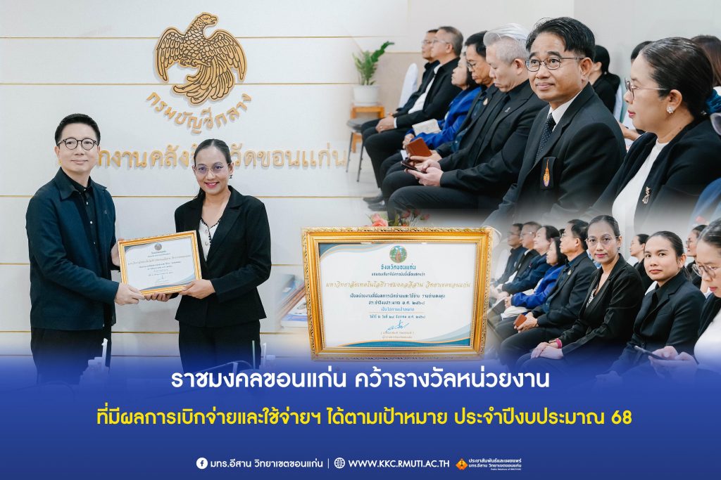 วันพุธที่ 24 ธันวาคม พ.ศ. 2568 เวลา 13.30 น. ณ ห้องประชุมสำนักงานคลังจังหวัดขอนแก่น ศาลากลางจังหวัดขอนแก่น ผศ.ประพันธ์ ยาวระ รองอธิการบดีประจำวิทยาเขตขอนแก่น พร้อมด้วยนางสาวหนึ่งฤทัย แจ่มใส นักวิชาการเงินและบัญชี หัวหน้าแผนกงานเบิกจ่าย มหาวิทยาลัยเทคโนโลยีราชมงคลอีสาน วิทยาเขตขอนแก่น เข้ารับมอบเกียรติบัตรหน่วยงานที่มีผลการเบิกจ่ายและใช้จ่ายรายจ่ายลงทุนเป็นไปตามเป้าหมายการเบิกจ่ายและการการใช้จ่ายภาครัฐ ประจำปีงบประมาณ พ.ศ.2568 จาก นายยุทธพร พิรุณสาร รองผู้ว่าราชการจังหวัดขอนแก่น ซึ่ง มทร.อีสาน วิทยาเขตขอนแก่น ได้รับประกาศเกียรติคุณในมิติด้านการเบิกจ่ายงบลงทุน เป็นไปตามเป้าหมาย โดยมีผลการเบิกจ่ายงบประมาณในปี 2568 ร้อยละ 94.00 โอกาสนี้ รองผู้ว่าราชการจังหวัดขอนแก่น ได้กล่าวชื่นชมหน่วยงานที่มีผลการเบิกจ่ายดีเด่น และสนับสนุนเร่งรัดการเบิกจ่ายและใช้จ่ายงบประมาณสำหรับหน่วยงานที่ผลการเบิกจ่ายยังไม่ถึงเป้าหมาย การมอบรางวัลในครั้งนี้ จังหวัดขอนแก่นมีหน่วยงานที่ได้รับรางวัล จำนวน 25 หน่วยงาน จัดขึ้นโดยมีวัตถุประสงค์เพื่อส่งเสริมการปฏิบัติงานด้านการเงินการคลังในภาพรวมของหน่วยงานให้มีประสิทธิภาพ ถือเป็นรางวัลอันทรงเกียรติและเป็นความภาคภูมิใจของหน่วยงานที่สามารถใช้จ่ายเงินงบประมาณอย่างคุ้มค่า มีประสิทธิภาพ โปร่งใสเป็นการส่งเสริมให้การปฏิบัติงาน ประสบความสำเร็จตามที่ตั้งไว้ เพื่อกำกับดูแลและบริหารการใช้จ่ายเงินของแผ่นดินให้เกิดประโยชน์สูงสุดต่อไป