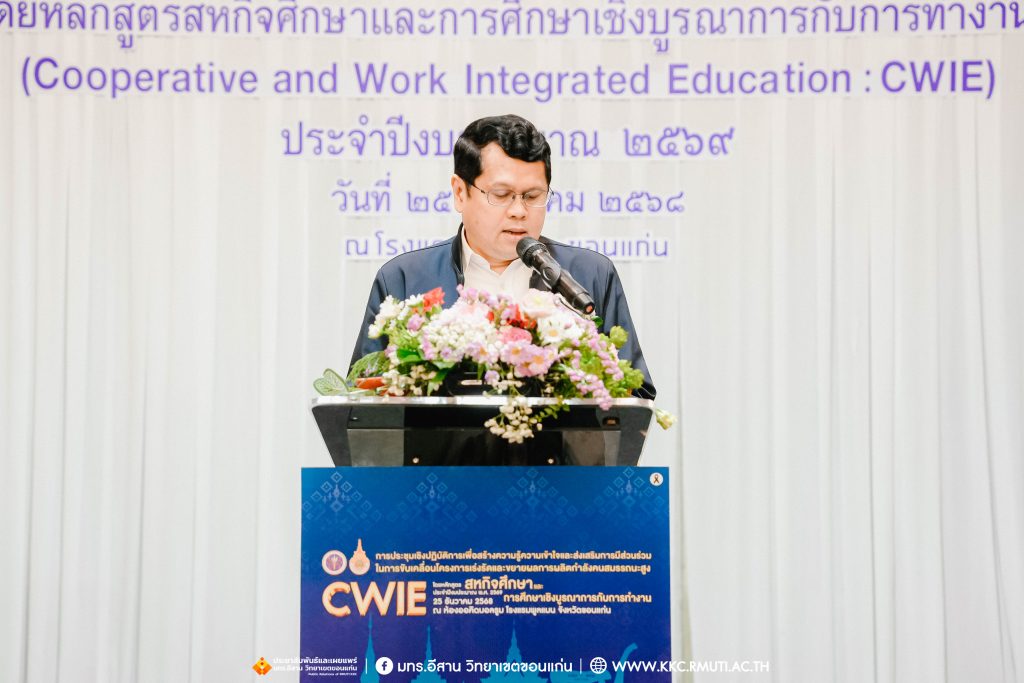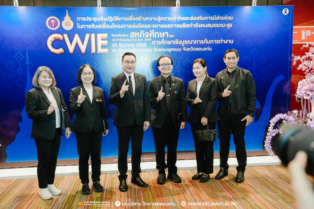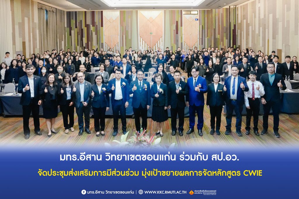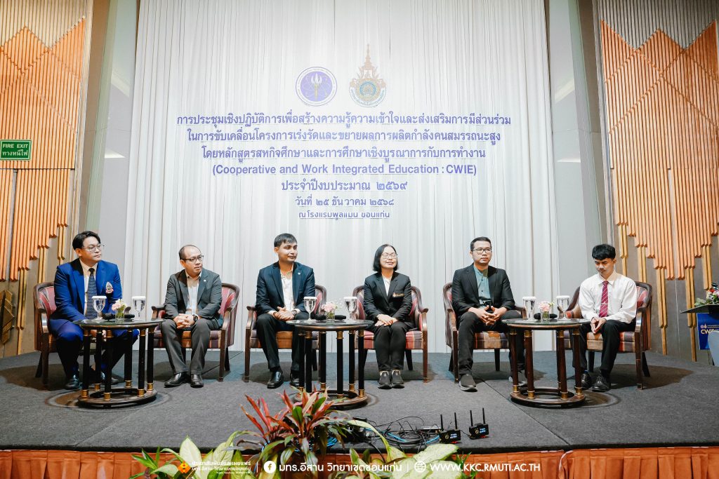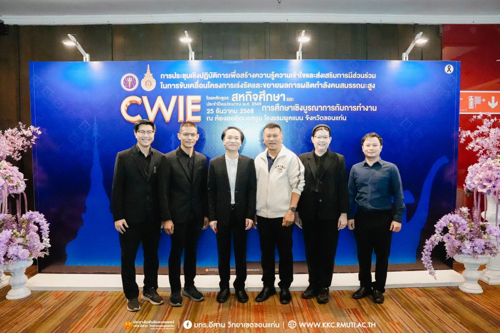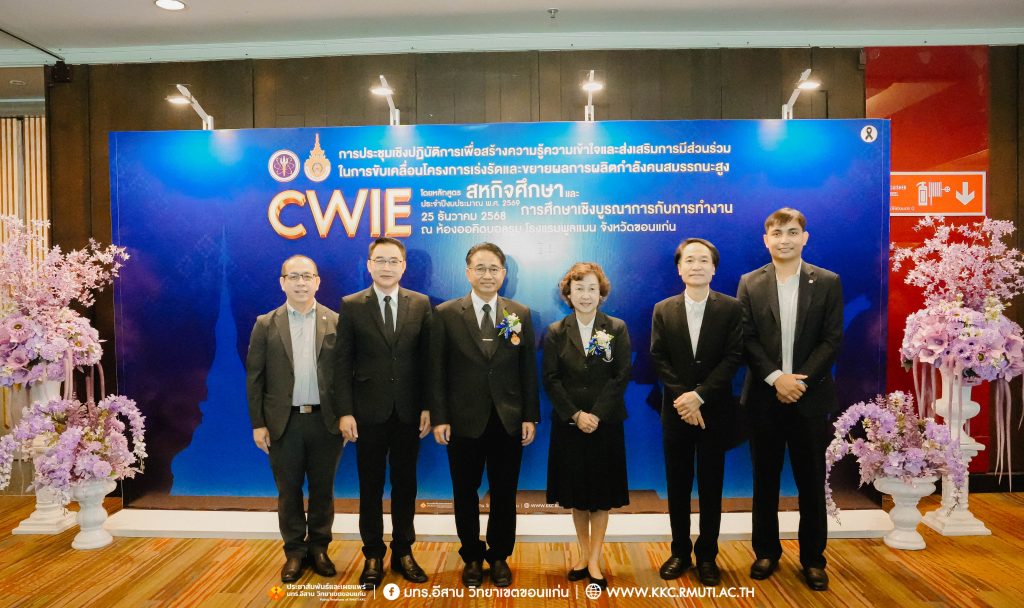 วันพฤหัสบดีที่ 25 ธันวาคม 2568 มหาวิทยาลัยเทคโนโลยีราชมงคลอีสาน วิทยาเขตขอนแก่น ร่วมกับ สำนักงานปลัดกระทรวงการอุดมศึกษา วิทยาศาสตร์ วิจัยและนวัตกรรม (สป.อว.) จัดการประชุมเชิงปฏิบัติการเพื่อสร้างความรู้ความเข้าใจและส่งเสริมการมีส่วนร่วมในการขับเคลื่อนโครงการเร่งรัดและขยายผลการผลิตกำลังคนสมรรถนะสูง โดยหลักสูตรสหกิจศึกษาและการศึกษาเชิงบูรณาการกับการทำงาน (CWIE) ประจำปีงบประมาณ พ.ศ. 2569 ได้รับเกียรติจาก นายสมบัติรุ่งรัศมี ผู้อำนวยการกองยกระดับคุณภาพการจัดการศึกษาระดับอุดมศึกษา และรักษาการที่ปรึกษาด้านพัฒนาการอุดมศึกษา วิทยาศาสตร์ วิจัยและนวัตกรรม เป็นประธานและกล่าวเปิดการประชุม พร้อมด้วย ดร.อรสา ภาววิมล ประธานคณะอนุกรรมการขับเคลื่อนและยกระดับการจัดการศึกษาเชิงประสบการณ์ ให้เกียรติบรรยายพิเศษ ผศ.ประพันธ์ ยาวระ รองอธิการบดีประจำวิทยาเขตขอนแก่น กล่าวต้อนรับคณะวิทยากรและผู้เข้าร่วมการประชุมกว่า 200 คน จากหน่วยงานภาครัฐ เอกชน และสถาบันอุดมศึกษาในภูมิภาคตะวันออกเฉียงเหนือ โดยมี อาจารย์บุญกิจ อุ่นพิกุล ผู้ช่วยอธิการบดี ผศ.ดร.นทยา กัมพลานนท์ ผู้ช่วยอธิการบดี ผศ.ดร.ศุภฤกษ์ ชามงคลประดิษฐ์ คณบดีคณะวิศวกรรมศาสตร์ ผศ.ดร.วิรัช ชินพลอย คณบดีคณะครุศาสตร์อุตสาหกรรม คณะผู้บริหาร คณาจารย์ ร่วมเป็นเกียรติในพิธีและได้รับเกียรติจาก อาจารย์ ดร.อารีรัตน์ เชื้อบุญเกิด โนท คณบดีคณะบริหารธุรกิจและเทคโนโลยีสารสนเทศ เป็นพิธีกร ณ ห้องออคิดบอลรูม ชั้น 2 โรงแรมพูลแมน ขอนแก่น ราชา ออคิด จังหวัดขอนแก่น