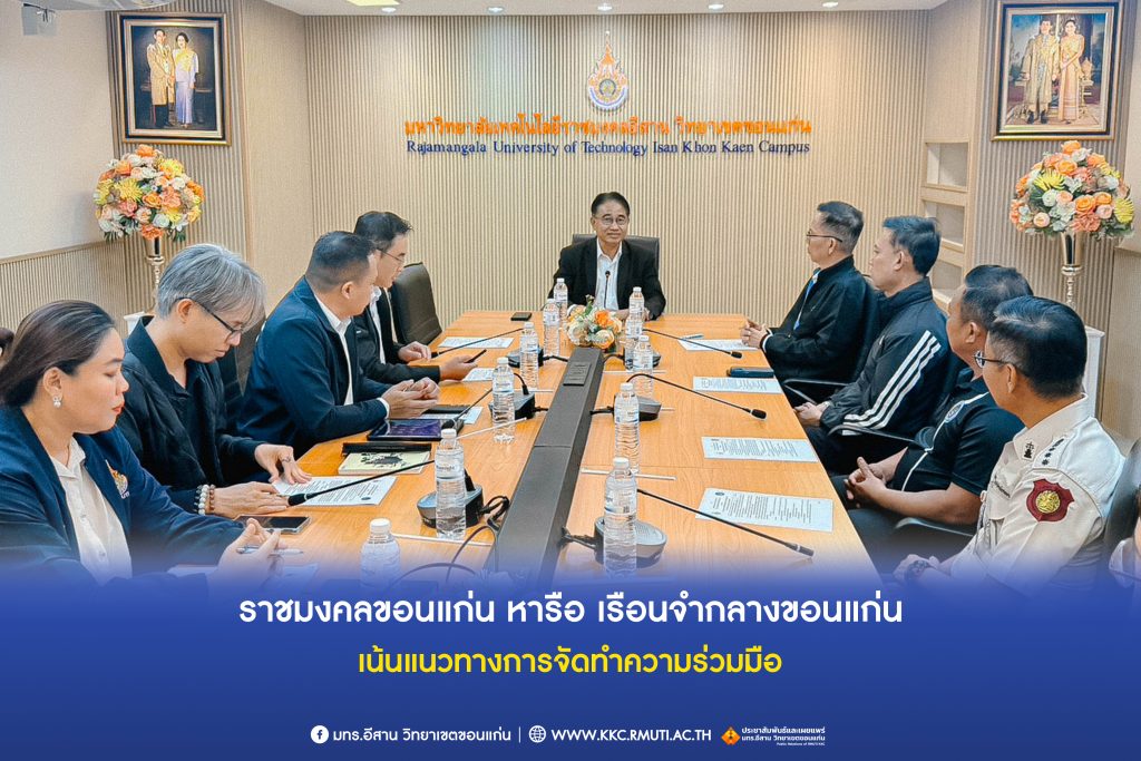 วันอังคารที่ 13 มกราคม พ.ศ. 2569 มหาวิทยาลัยเทคโนโลยีราชมงคลอีสาน วิทยาเขตขอนแก่น โดย ผศ.ประพันธ์ ยาวระ รองอธิการบดีประจำวิทยาเขตขอนแก่น พร้อมด้วย ผศ.ดร.ศุภฤกษ์ ชามงคลประดิษฐ์ คณบดีคณะวิศวกรรมศาสตร์ ผศ.ดร.วิรัช ชินพลอย คณบดีคณะครุศาสตร์อุตสาหกรรม ผศ.ฐนดม ราศรีรัตนะ รองคณบดีฝ่ายวิชาการและวิจัย คณะบริหารธุรกิจและเทคโนโลยีสารสนเทศ อาจารย์ฐิติพร จันทร์ดา รองคณบดีฝ่ายพัฒนานักศึกษา คณะครุศาสตร์อุตสาหกรรม ให้การต้อนรับ นายไพรัตน์ ขมินทกูล หัวหน้าผู้ตรวจราชการกรมราชทัณฑ์ รักษาราชการแทน ผู้บัญชาการเรือนจำกลางขอนแก่น พร้อมด้วย นายภิญโญศักดิ์ เอี่ยมศรี ผู้อำนวยการส่วนพัฒนาผู้ต้องขัง นายสิริชัย ยมเกิด ผู้อำนวยการทัณฑสถานบำบัดพิเศษขอนแก่น นายระพิน พุทธแก้ว ผู้อำนวยการส่วนสวัสดิการ ฑัณฑสถานบำบัดพิเศษขอนแก่น นางพิศ แสนสมบัติ หัวหน้าฝ่ายฝึกวิชาชีพผู้ต้องขัง และคณะ ในโอกาสเข้าพบเพื่อหารือแนวทางการจัดทำความร่วมมือระหว่างมหาวิทยาลัยฯ และเรือนจำกลางขอนแก่น กรมราชทัณฑ์ ณ ห้องประชุมประดู่ 2 อาคารเฉลิมพระเกียรติ 72 พรรษา