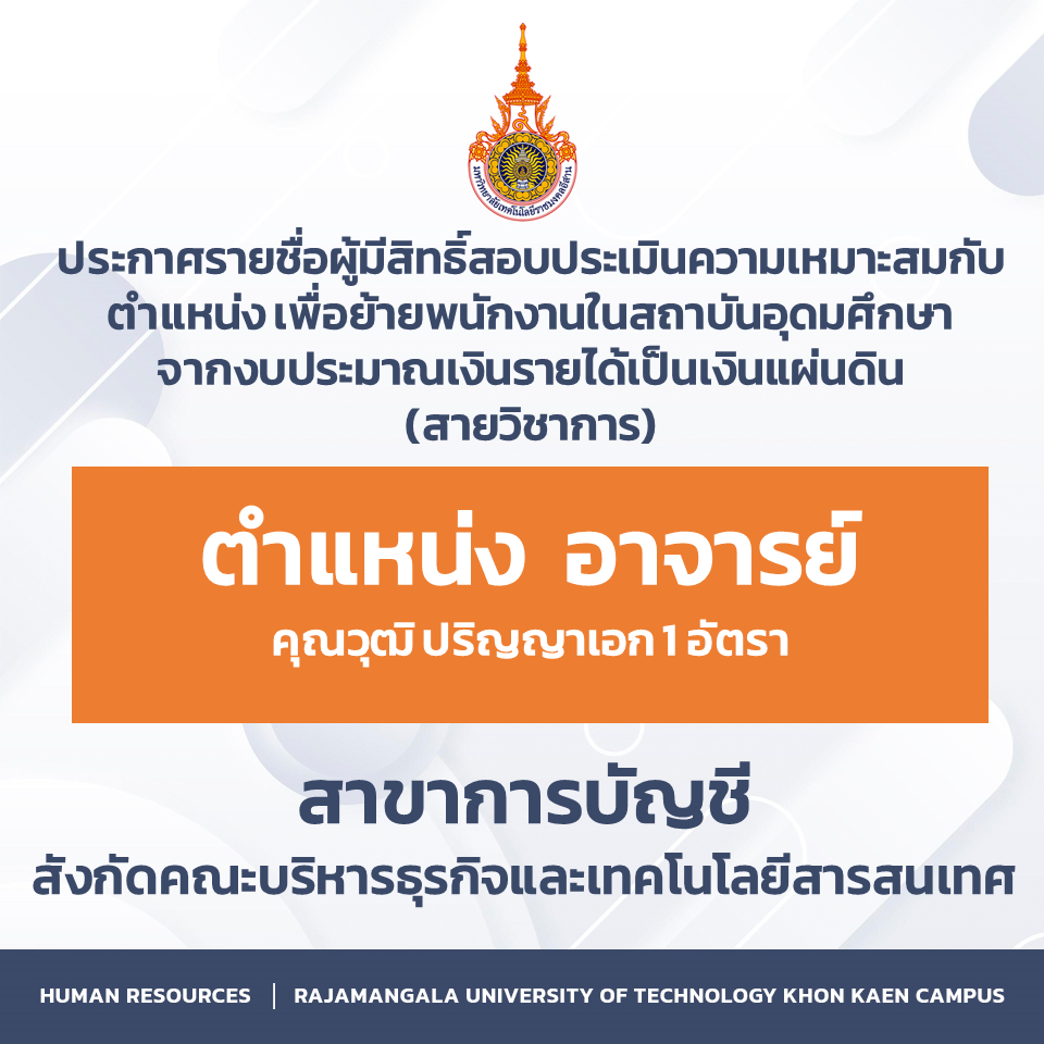 ประกาศรายชื่อผู้มีสิทธิ์สอบประเมินความเหมาะสมกับตำแหน่ง เพื่อย้ายพนักงานในสถาบันอุดมศึกษาจากงบประมาณเงินรายได้เป็นเงินแผ่นดิน สายวิชาการ ตำแหน่ง อาจารย์ คุณวุฒิ ปริญญาาเอก 1 อัตรา สาขาการบัญชี สังกัดคณะบริหารธุรกิจและเทคโนโลยีสารสนเทศ มกราคม 21, 2026มกราคม 21, 2026ประชาสัมพันธ์ประชาสัมพันธ์, รับสมัครงาน ประกาศรายชื่อผู้มีสิทธิ์สอบประเมินความเหมาะสมกับตำแหน่ง เพื่อย้ายพนักงานในสถาบันอุดมศึกษาจากงบประมาณเงินรายได้เป็นเงินแผ่นดิน สายวิชาการตำแหน่ง อาจารย์คุณวุฒิ ปริญญาาเอก 1 อัตราสาขาการบัญชีสังกัดคณะบริหารธุรกิจและเทคโนโลยีสารสนเทศดาวน์โหลด Facebook iconFacebookTwitter iconTwitterLINE iconLine