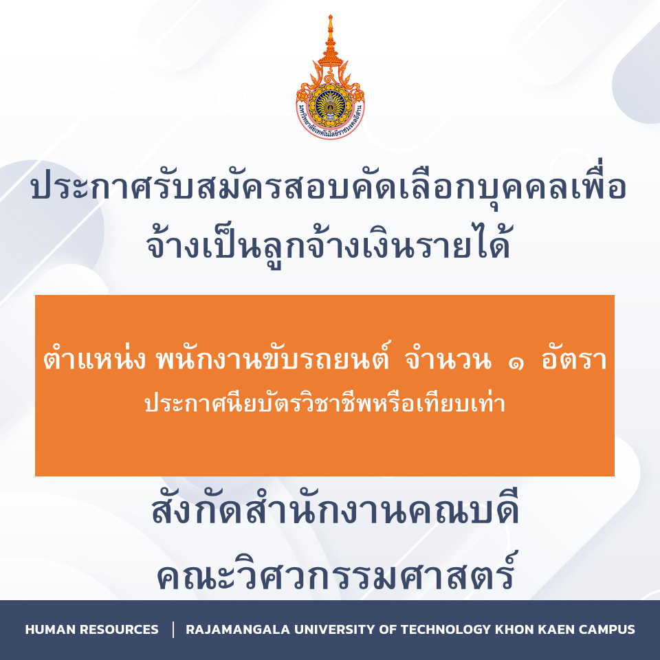 ประกาศรับสมัครสอบคัดเลือกบุคคลเพื่อจ้างเป็นลูกจ้างเงินรายได้ ตำแหน่ง พนักงานขับรถยนต์ จำนวน ๑ อัตรา คุณวุฒิ ประกาศนียบัตรวิชาชีพหรือเทียบเท่า สังกัดสำนักงานคณบดีคณะวิศวกรรมศาสตร์ กุมภาพันธ์ 2, 2026กุมภาพันธ์ 2, 2026ประชาสัมพันธ์ประชาสัมพันธ์, รับสมัครงาน ประกาศรับสมัครสอบคัดเลือกบุคคลเพื่อจ้างเป็นลูกจ้างเงินรายได้ตำแหน่ง พนักงานขับรถยนต์ จำนวน ๑ อัตราคุณวุฒิ ประกาศนียบัตรวิชาชีพหรือเทียบเท่าสังกัดสำนักงานคณบดีคณะวิศวกรรมศาสตร์ดาวน์โหลด Facebook iconFacebookTwitter iconTwitterLINE iconLine
