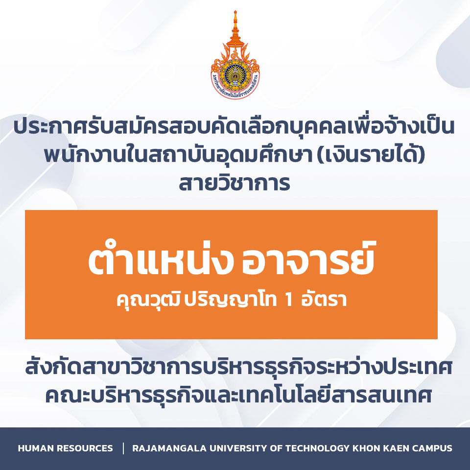 ประกาศรับสมัครสอบคัดเลือกบุคคลเพื่อจ้างเป็น พนักงานในสถาบันอุดมศึกษา (เงินรายได้) สายวิชาการ ตำแหน่ง อาจารย์ คุณวุฒิ ปริญญาโท สังกัดสาขาวิชาการบริหารธุรกิจระหว่างประเทศ คณะบริหารธุรกิจและเทคโนโลยีสารสนเทศ กุมภาพันธ์ 2, 2026กุมภาพันธ์ 2, 2026ประชาสัมพันธ์ประชาสัมพันธ์, รับสมัครงาน อ.ประกาศรับสมัครสอบคัดเลือกบุคคลเพื่อจ้างเป็นพนักงานในสถาบันอุดมศึกษา (เงินรายได้) สายวิชาการตำแหน่ง อาจารย์คุณวุฒิ ปริญญาโทสังกัดสาขาวิชาการบริหารธุรกิจระหว่างประเทศคณะบริหารธุรกิจและเทคโนโลยีสารสนเทศดาวน์โหลด Facebook iconFacebookTwitter iconTwitterLINE iconLine