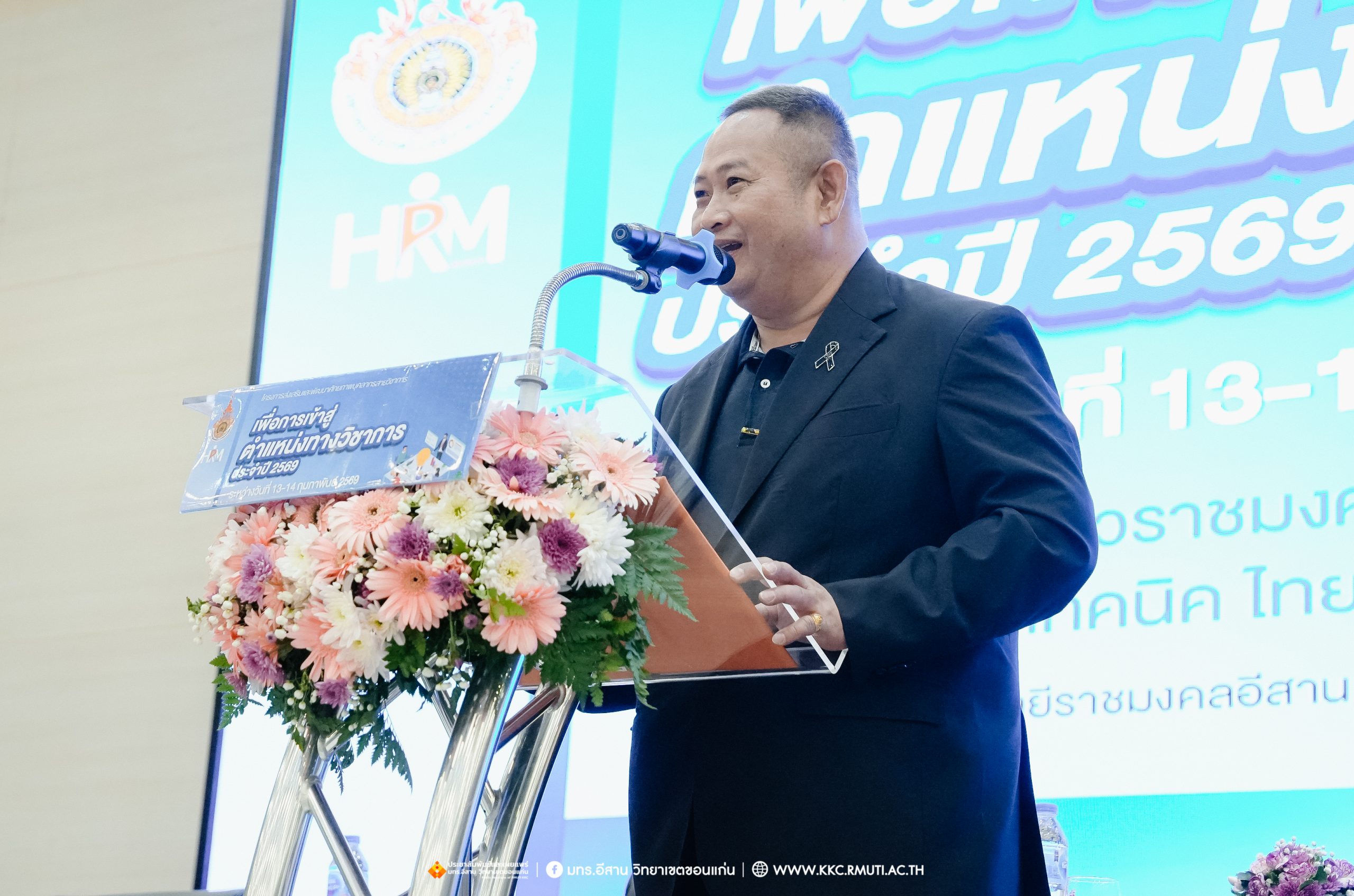 วันศุกร์ที่ 13 กุมภาพันธ์ 2569 เวลา 9.00 น. กองบริหารงานบุคคล มหาวิทยาลัยเทคโนโลยีราชมงคลอีสาน จัดโครงการ “ส่งเสริมและพัฒนาศักยภาพบุคลากรสายสายวิชาการ เพื่อการแต่งตั้งให้ดำรงตำแหน่งทางวิชาการ ประจำปี 2569 ได้รับเกียรติจาก รศ.ดร.โฆษิต ศรีภูธร อธิการบดี มทร.อีสาน เป็นประธานกล่าวเปิดโครงการ ผศ.สุรพจน์ วัชโรภากุล รองอธิการบดีฝ่ายบริหารและพัฒนาทรัพยากรมนุษย์ เป็นผู้กล่าวรายงาน โดยประธานในพิธีได้เน้นย้ำความสำคัญของการพัฒนาศักยภาพบุคลากรสายวิชาการเพื่อเพิ่มความรู้ ทักษะ และเทคนิคในการจัดทำผลงานวิชาการให้มีคุณภาพตามเกณฑ์มาตรฐาน เสริมสร้างความเข้าใจเกี่ยวกับหลักเกณฑ์ ก.พ.อ. สร้างแรงจูงใจและพัฒนาบุคลากรให้มีความพร้อมในการเสนอขอกำหนดตำแหน่งทางวิชาการสูงขึ้น เพื่อยกระดับคุณภาพการศึกษาและคุณภาพของสถาบัน โดยมี ผศ.ประพันธ์ ยาวระ รองอธิการบดีประจำวิทยาเขตขอนแก่น อาจารย์บุญกิจ อุ่นพิกุล ผู้ช่วยอธิการบดี ผศ.ดร.นทยา กัมพลานนท์ ผู้ช่วยอธิการ ผศ.ดร.วิรัช
