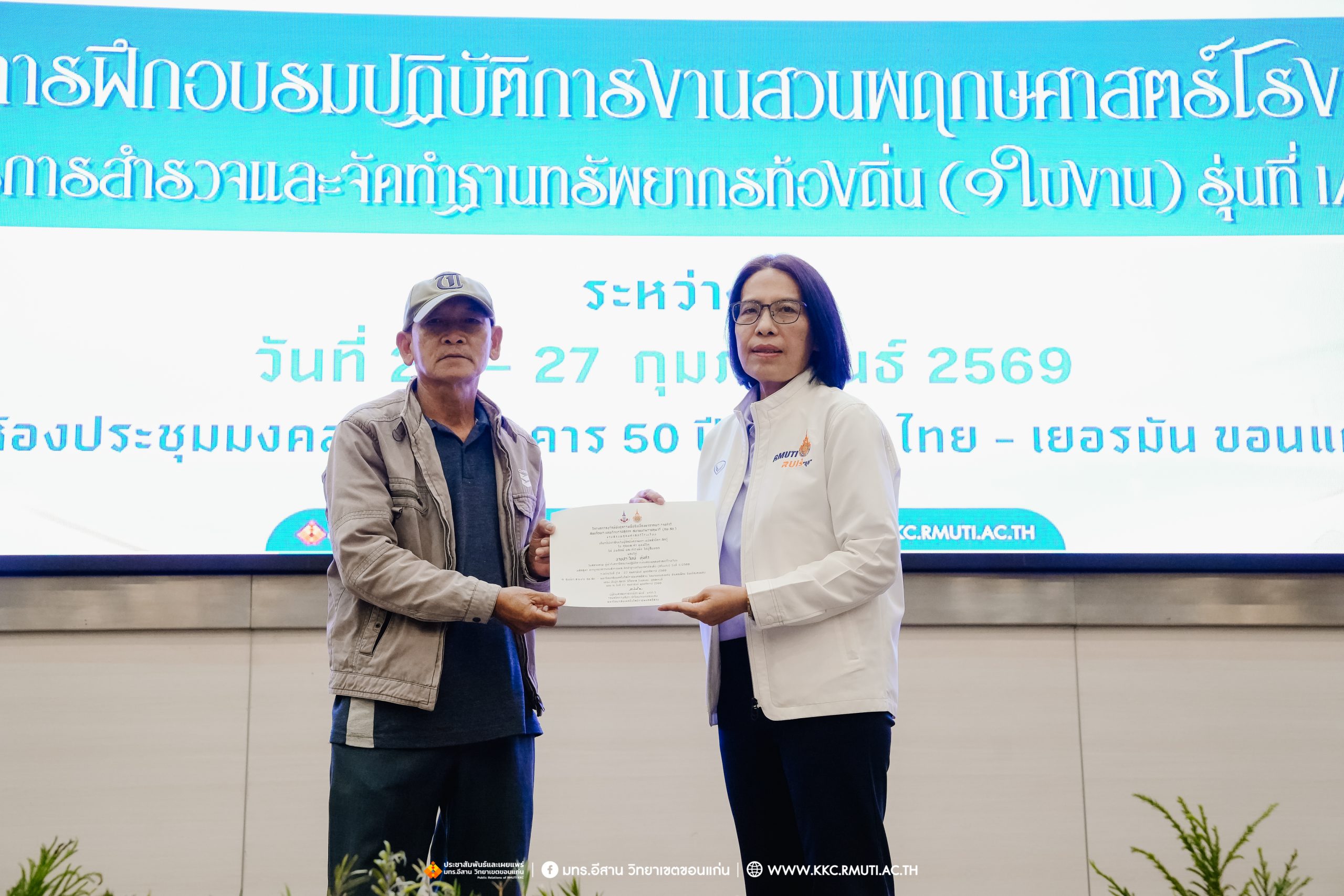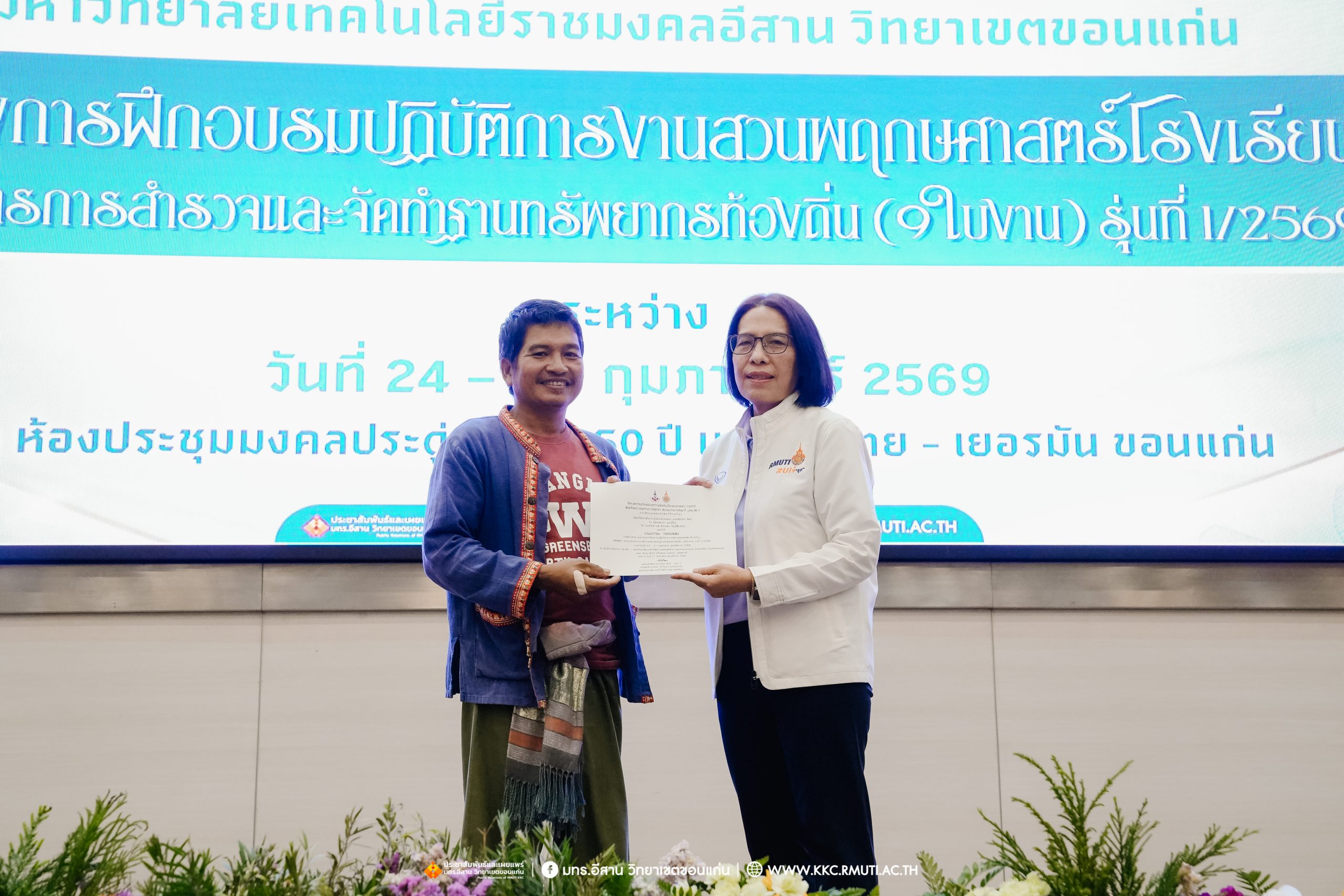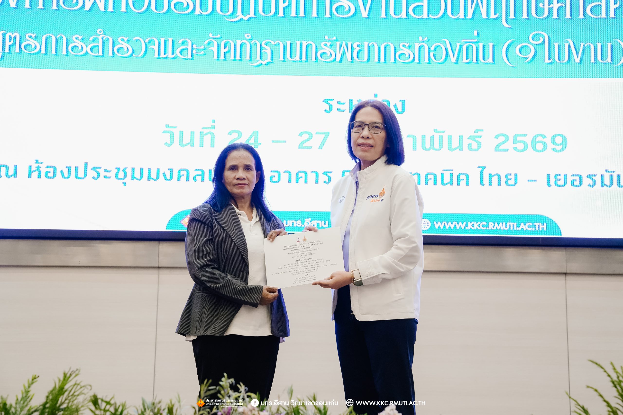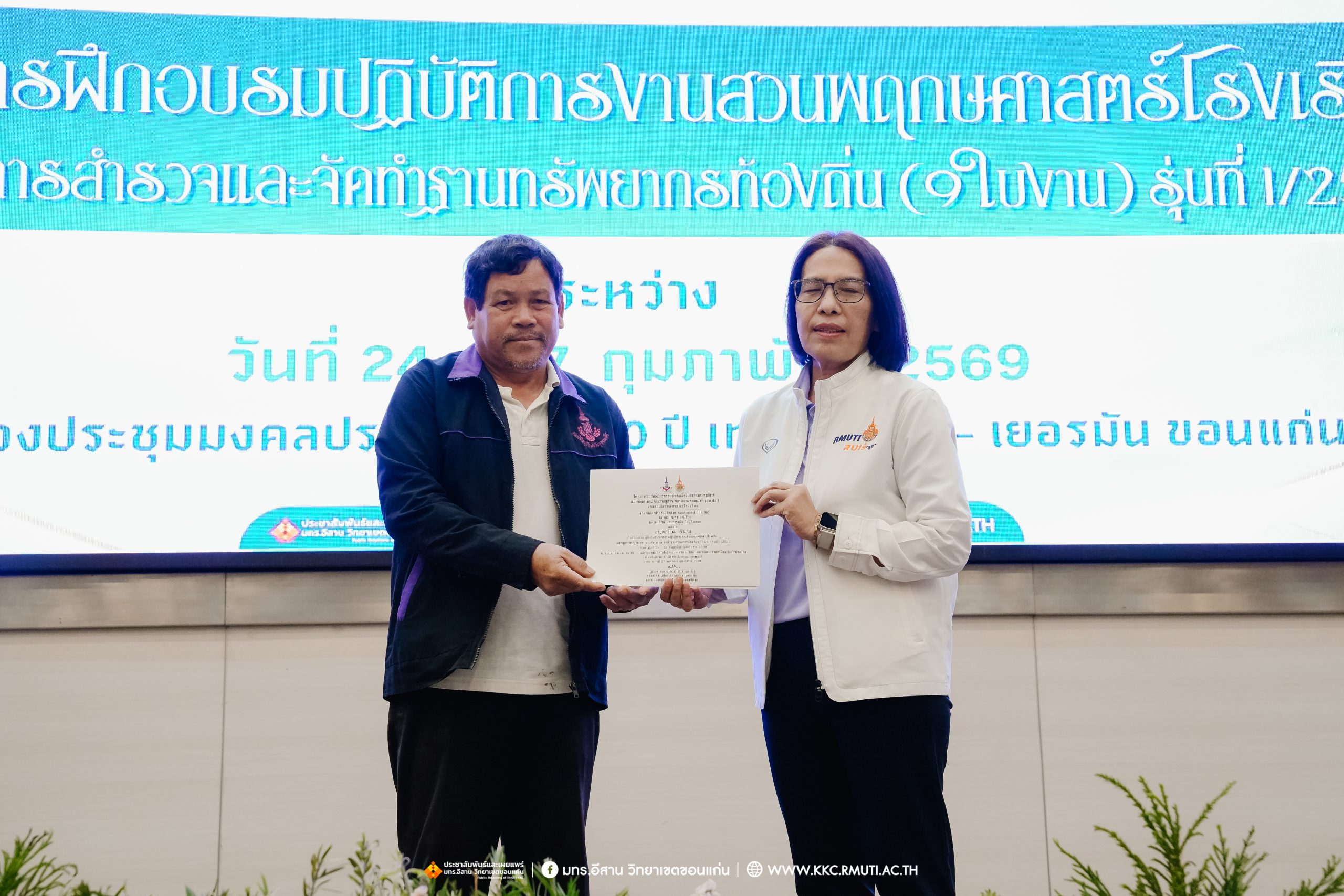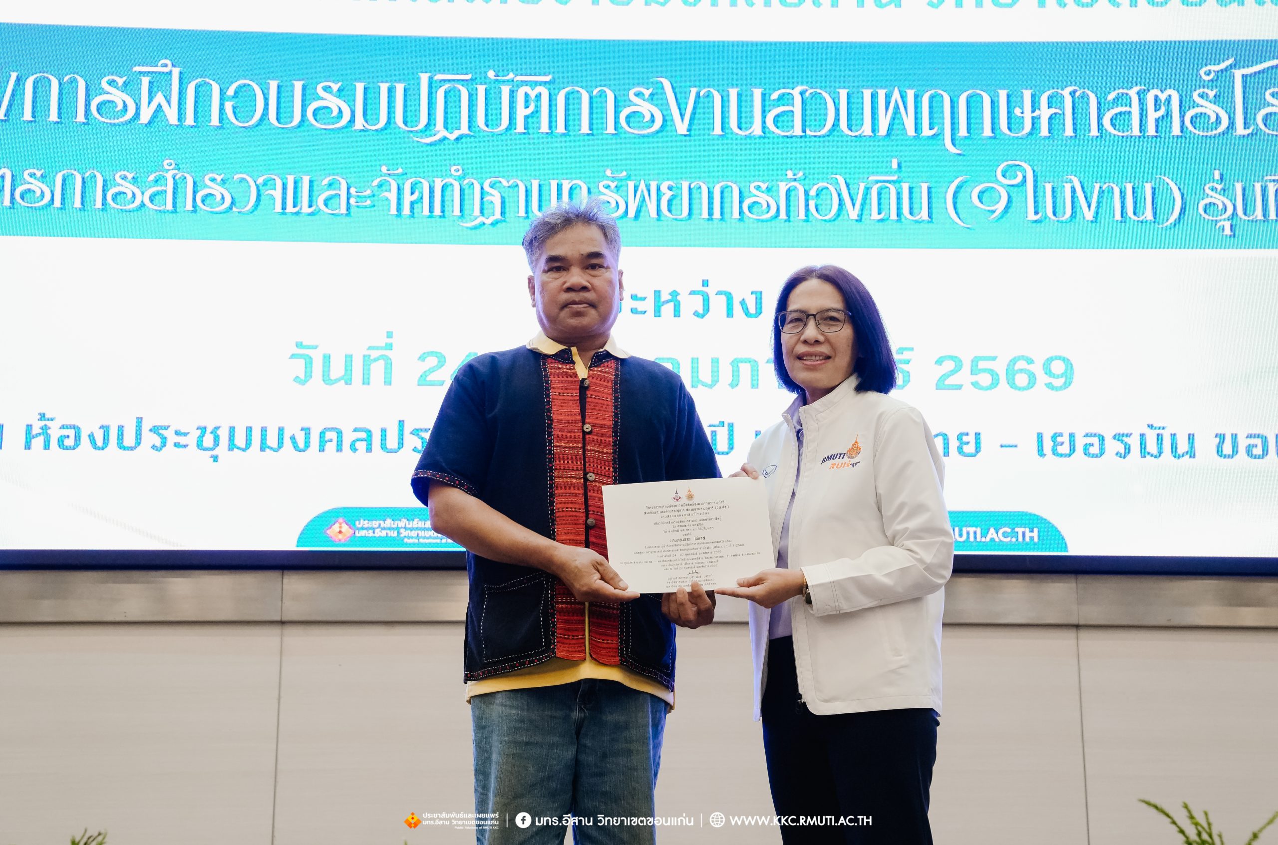 วันศุกร์ที่ 27 กุมภาพันธ์ พ.ศ. 2569 ศูนย์ประสานงานโครงการ อพ.สธ. มหาวิทยาลัยเทคโนโลยีราชมงคลอีสาน วิทยาเขตขอนแก่น โดย รศ.ดร.โฆษิต ศรีภูธร อธิการบดี และผศ.ประพันธ์ ยาวระ รองอธิการบดีประจำวิทยาเขตขอนแก่น มอบ ผศ.ดร.นทยา กัมพลานนท์ ผู้ช่วยอธิการบดี ให้เกียรติมอบเกียรติบัตรแก่ผู้เข้ารับการอบรมปฏิบัติการงานสวนพฤกษศาสตร์โรงเรียน หลักสูตรการบูรณาการงานสำรวจและจัดทำฐานทรัพยากรท้องถิ่น (9 ใบงาน) รุ่นที่ 1/2569 ณ ห้องประชุมมงคลประดู่ ชั้น 3 อาคาร 50 ปี เทคนิค ไทย – เยอรมัน ขอนแก่น โดยโครงการฯ ดำเนินการอบรมในระหว่างวันที่ 24 – 27 กุมภาพันธ์ 2569 ได้รับความสนใจจากสำนักงานการปฏิรูปที่ดินเพื่อการเกษตรส่งบุคลากรพร้อมทั้งเครือข่ายเกษตรกรที่ประสบความสำเร็จในการทำเกษตรยั่งยืน 19 จังหวัด ทั่วทุกภาคของประเทศไทย รวมทั้งสิ้นจำนวน 41 คน และเครือข่ายผู้บริหารและบุคลากรทางการศึกษา 10 แห่ง จำนวน 19 คน