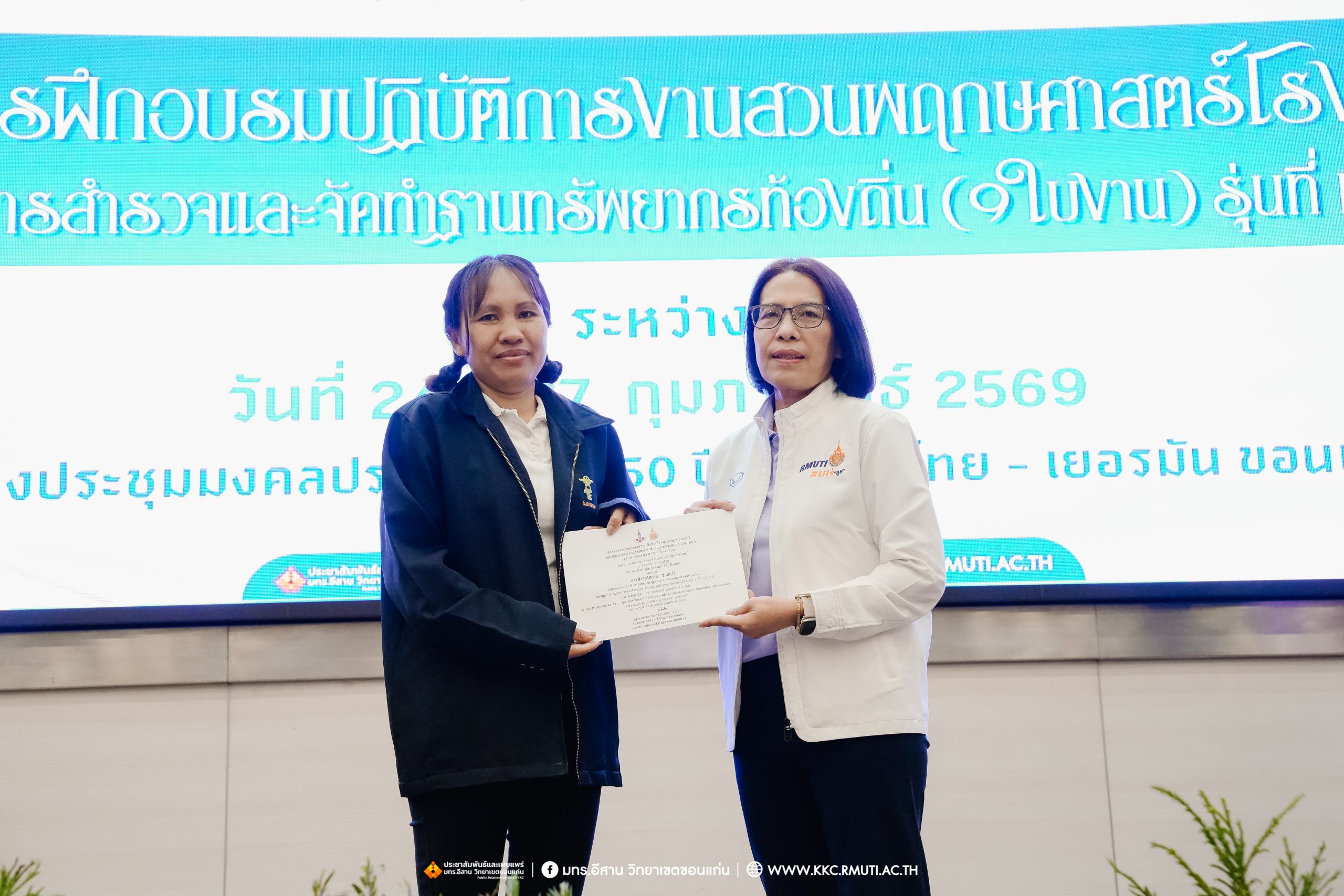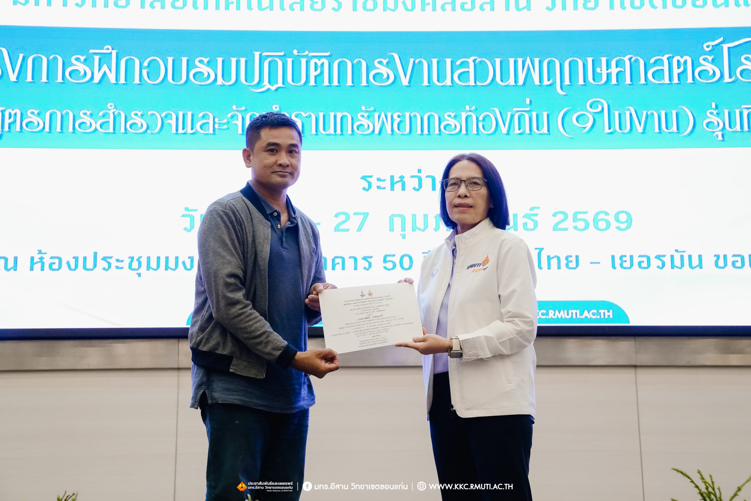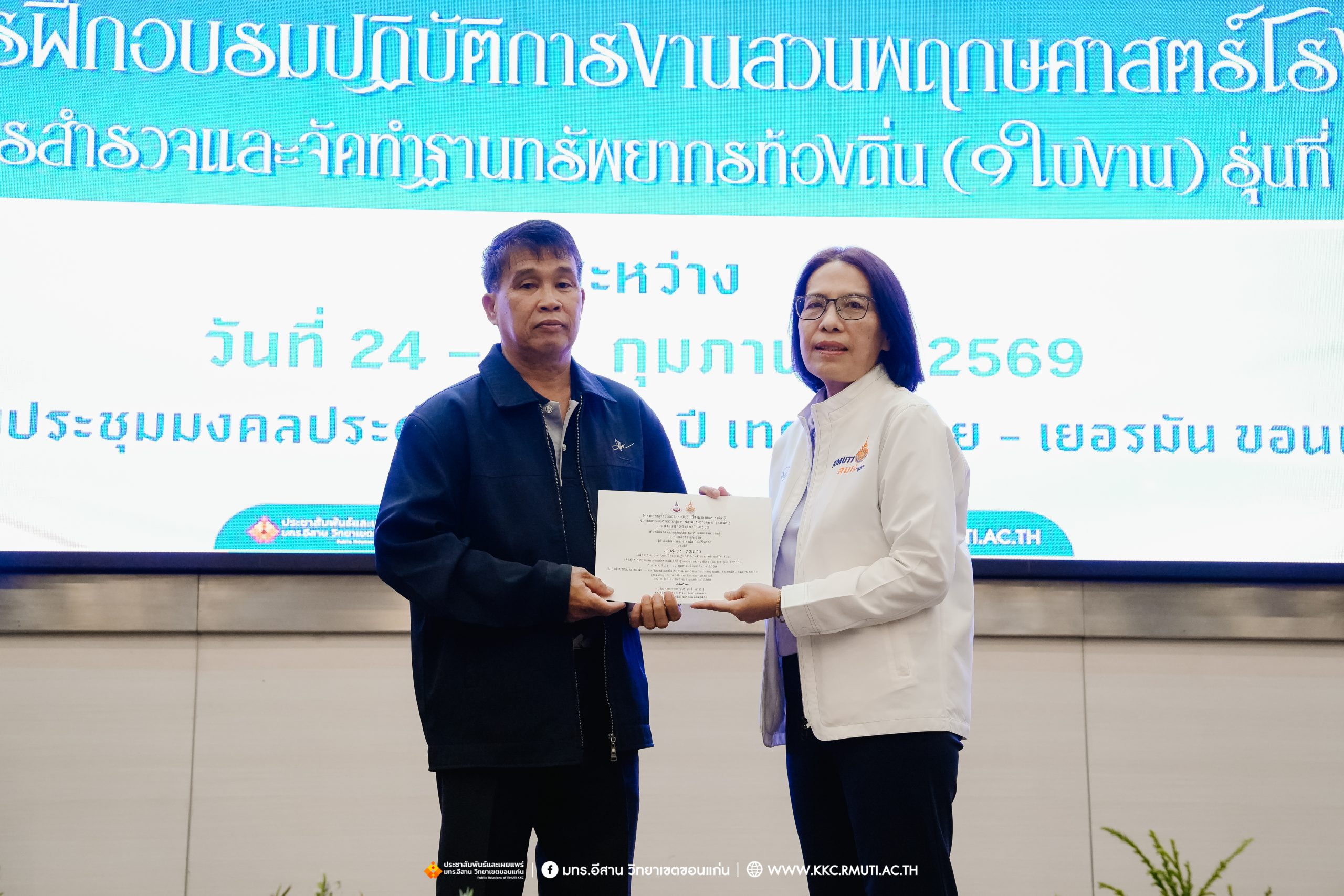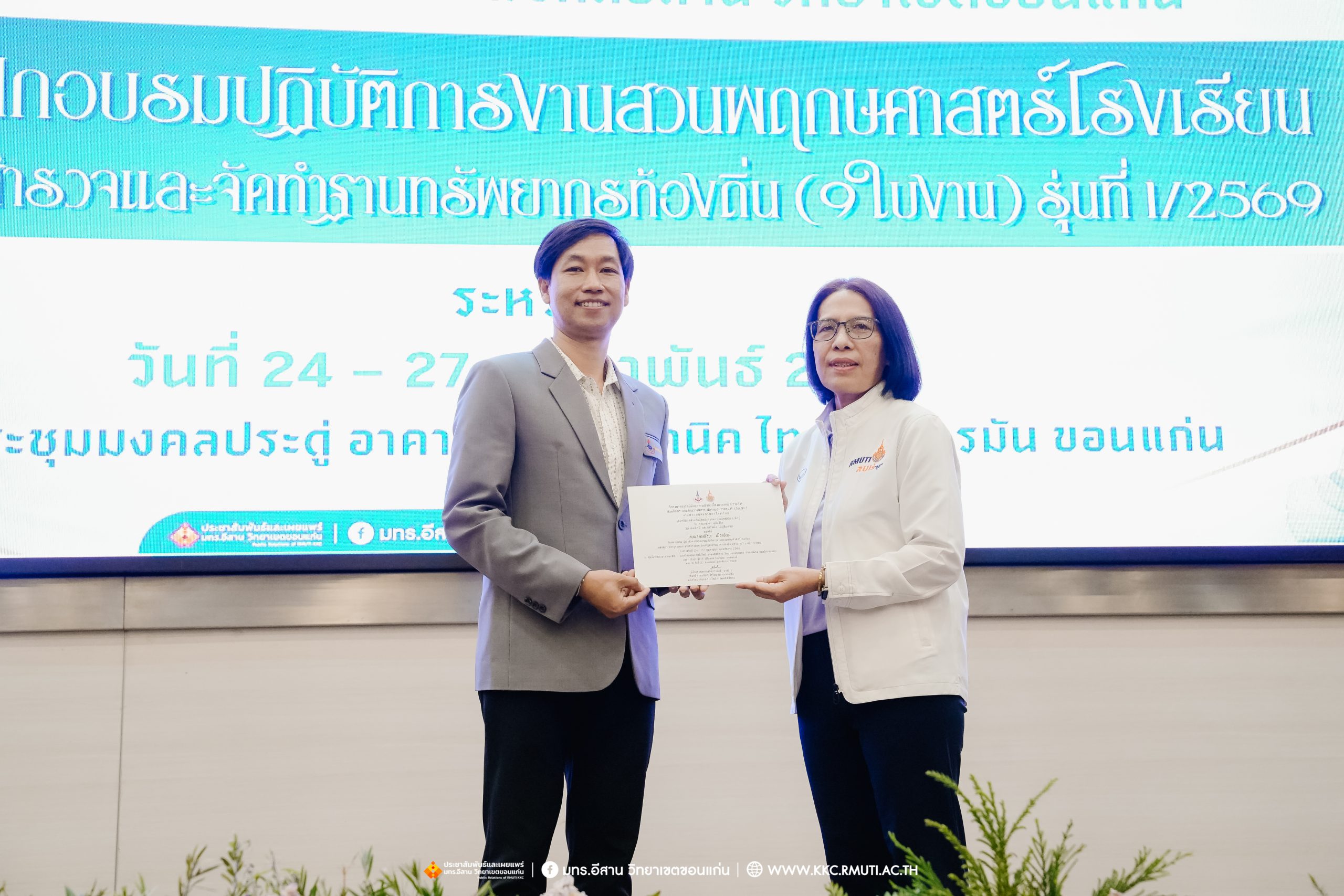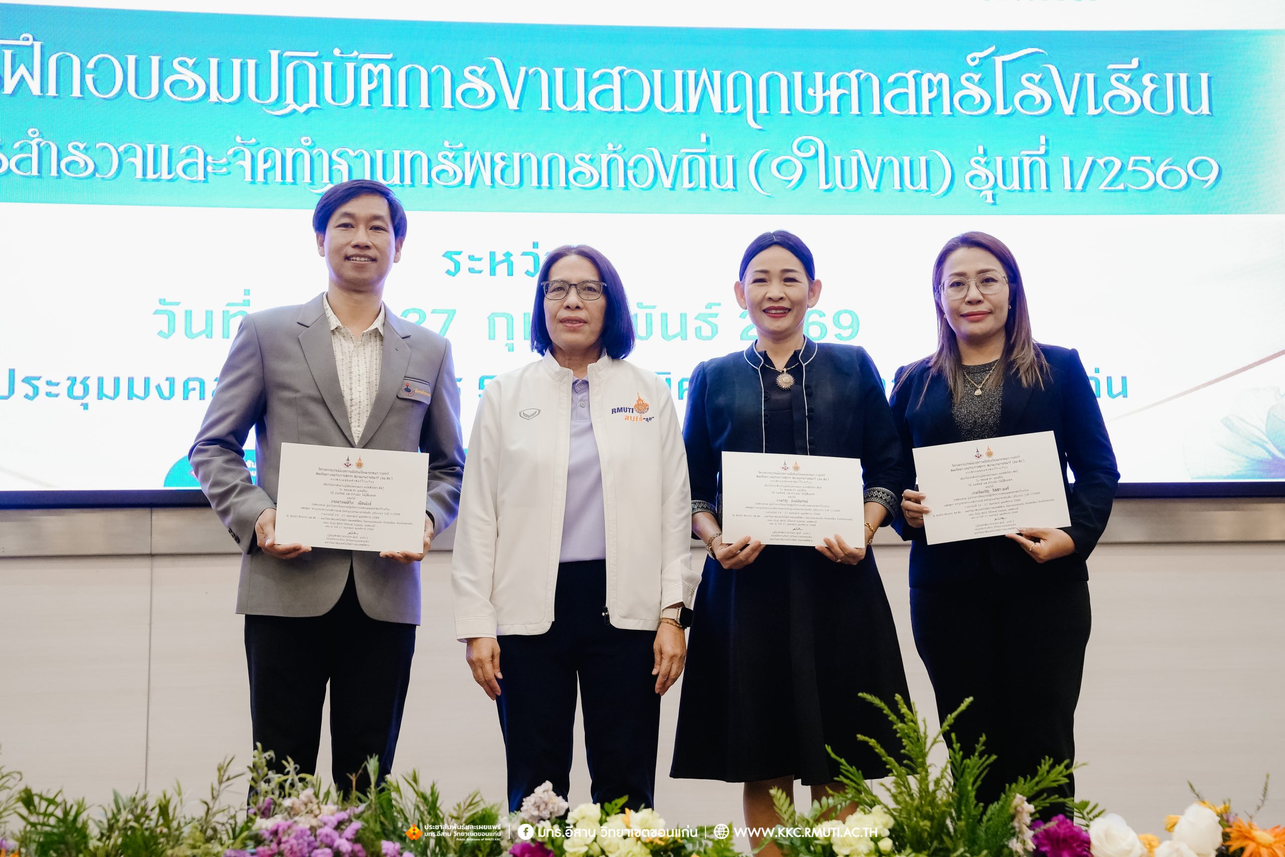 วันศุกร์ที่ 27 กุมภาพันธ์ พ.ศ. 2569 ศูนย์ประสานงานโครงการ อพ.สธ. มหาวิทยาลัยเทคโนโลยีราชมงคลอีสาน วิทยาเขตขอนแก่น โดย รศ.ดร.โฆษิต ศรีภูธร อธิการบดี และผศ.ประพันธ์ ยาวระ รองอธิการบดีประจำวิทยาเขตขอนแก่น มอบ ผศ.ดร.นทยา กัมพลานนท์ ผู้ช่วยอธิการบดี ให้เกียรติมอบเกียรติบัตรแก่ผู้เข้ารับการอบรมปฏิบัติการงานสวนพฤกษศาสตร์โรงเรียน หลักสูตรการบูรณาการงานสำรวจและจัดทำฐานทรัพยากรท้องถิ่น (9 ใบงาน) รุ่นที่ 1/2569 ณ ห้องประชุมมงคลประดู่ ชั้น 3 อาคาร 50 ปี เทคนิค ไทย – เยอรมัน ขอนแก่น โดยโครงการฯ ดำเนินการอบรมในระหว่างวันที่ 24 – 27 กุมภาพันธ์ 2569 ได้รับความสนใจจากสำนักงานการปฏิรูปที่ดินเพื่อการเกษตรส่งบุคลากรพร้อมทั้งเครือข่ายเกษตรกรที่ประสบความสำเร็จในการทำเกษตรยั่งยืน 19 จังหวัด ทั่วทุกภาคของประเทศไทย รวมทั้งสิ้นจำนวน 41 คน และเครือข่ายผู้บริหารและบุคลากรทางการศึกษา 10 แห่ง จำนวน 19 คน