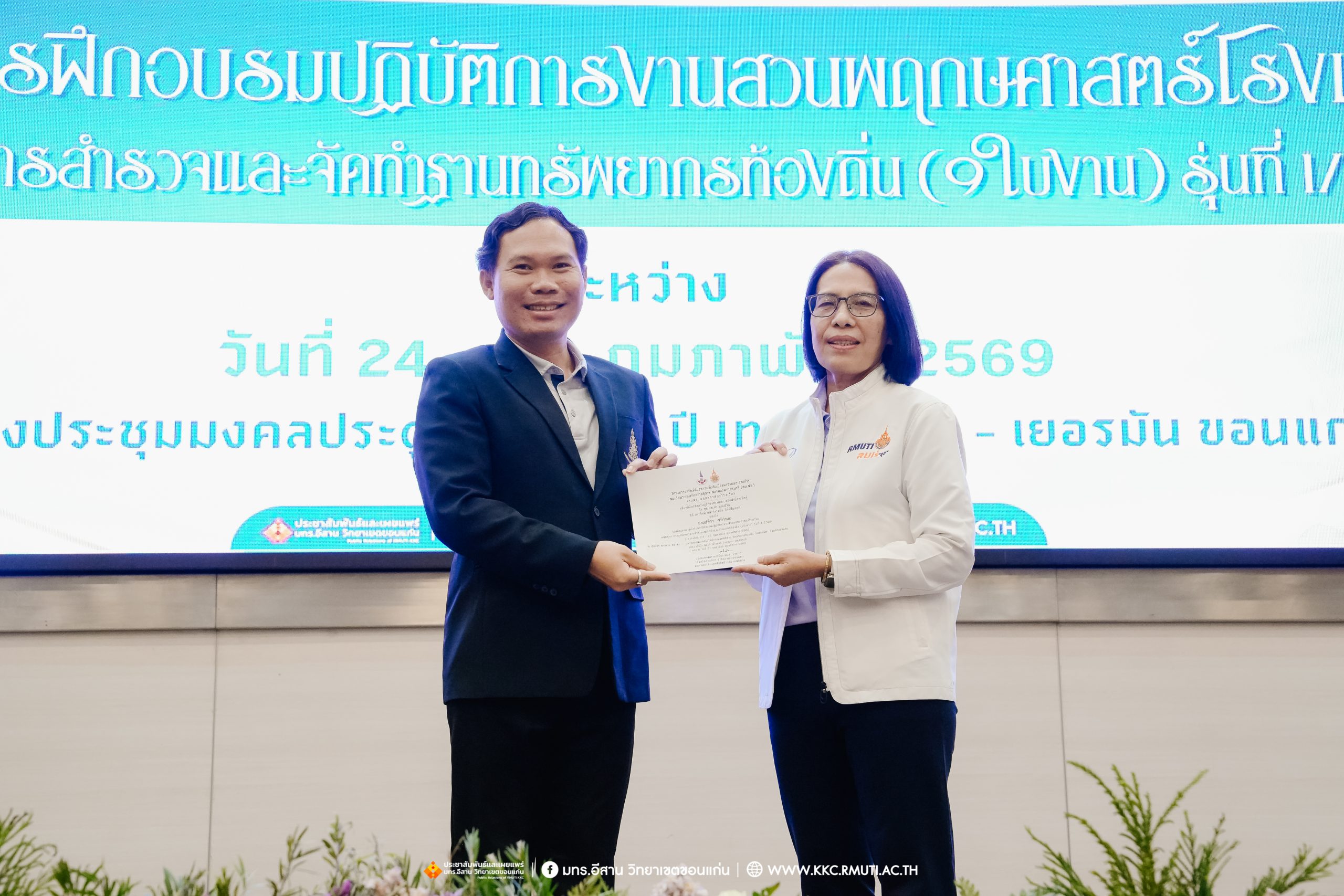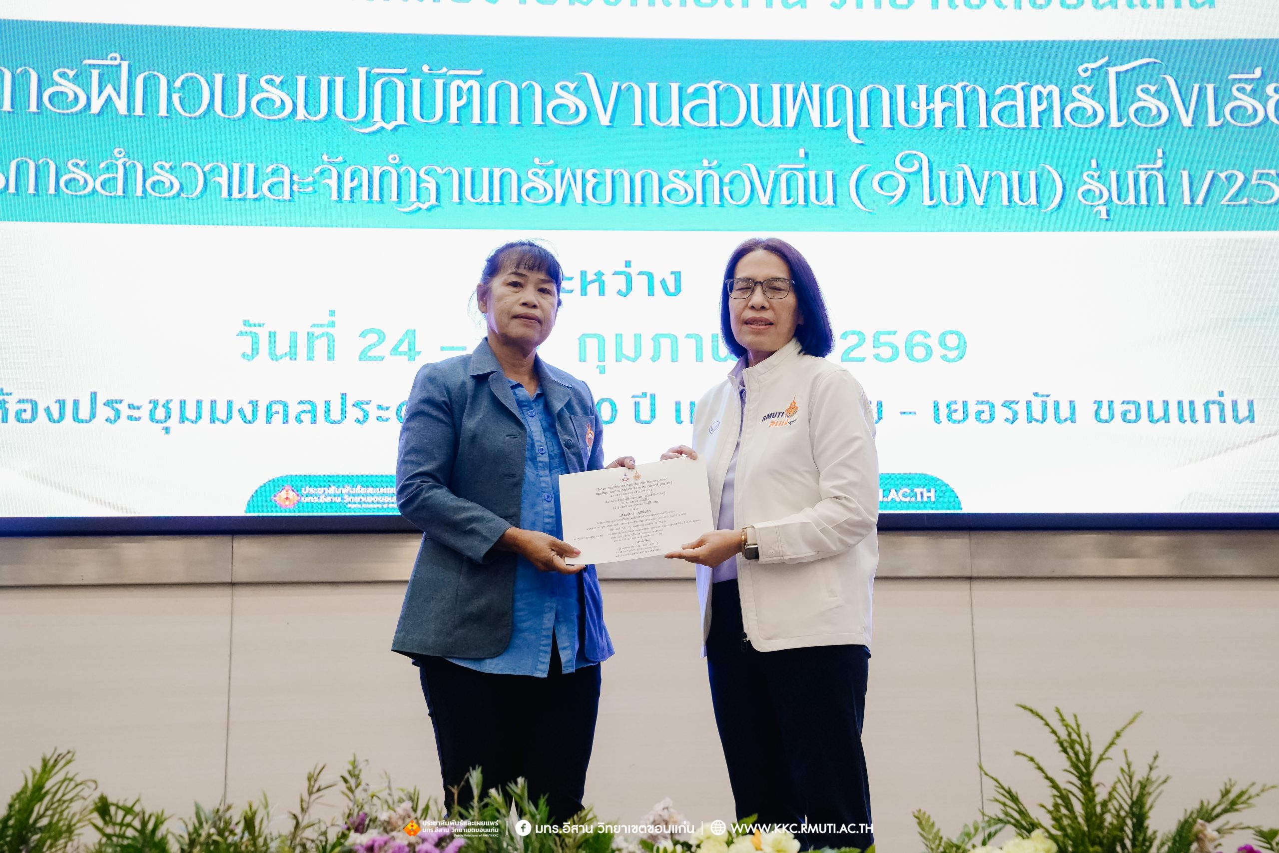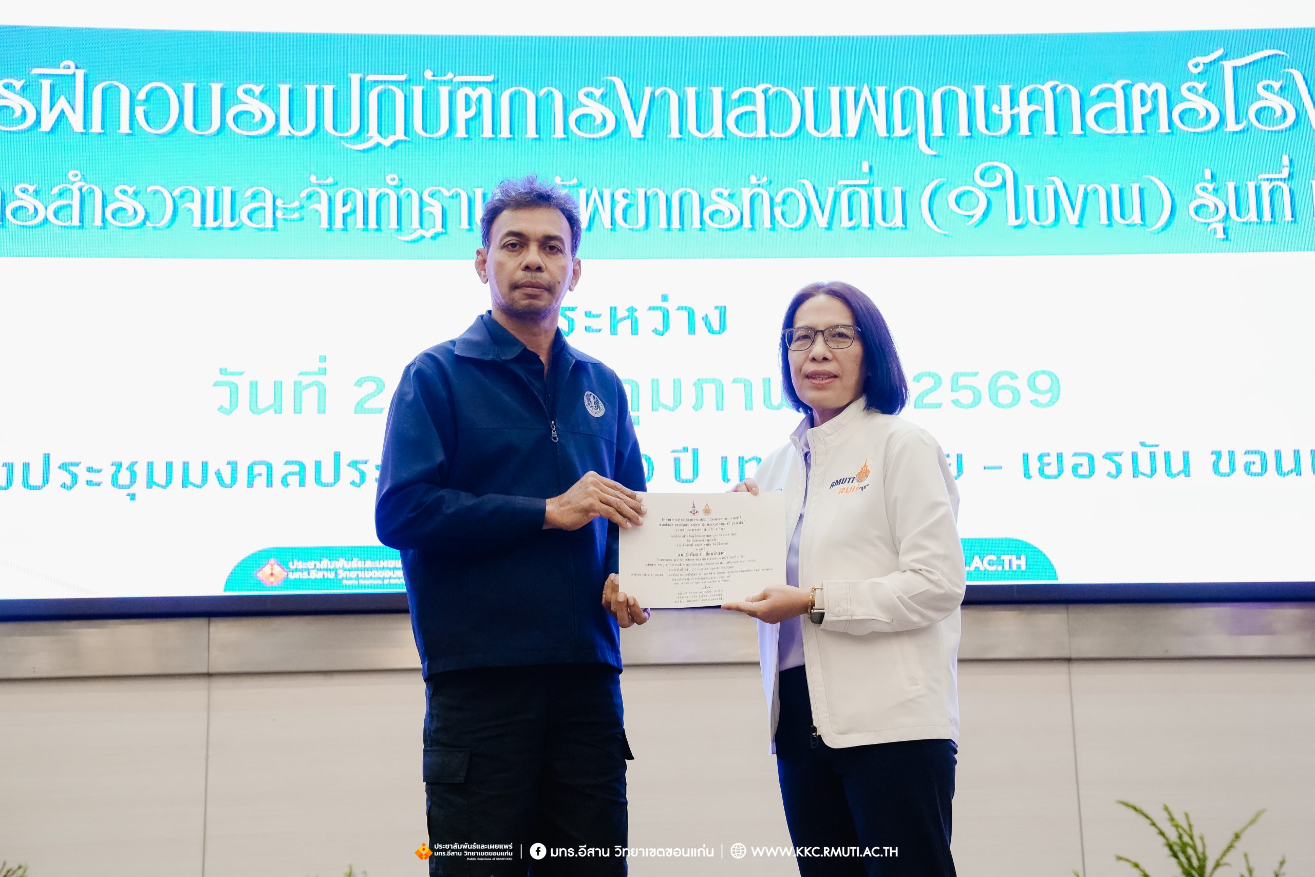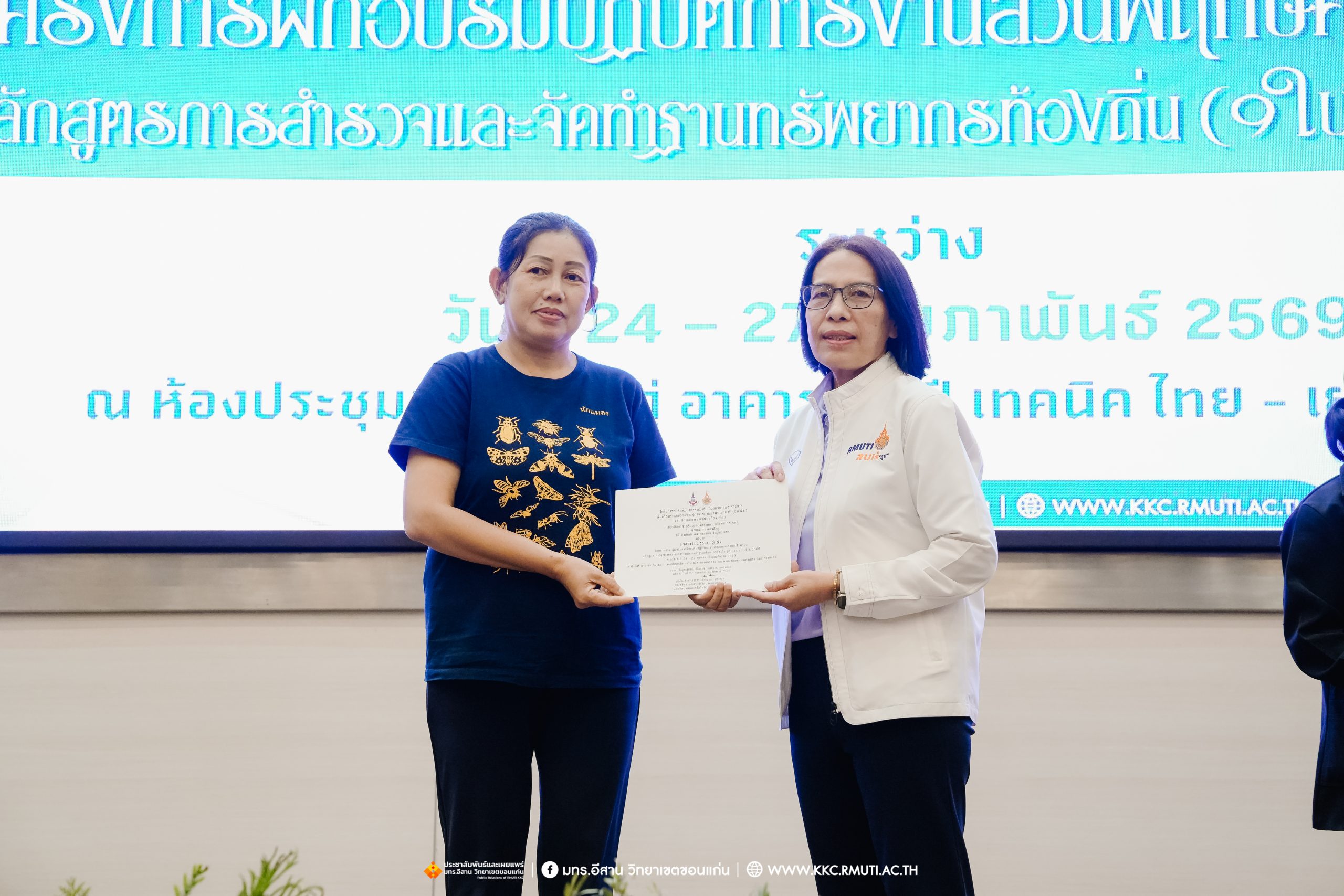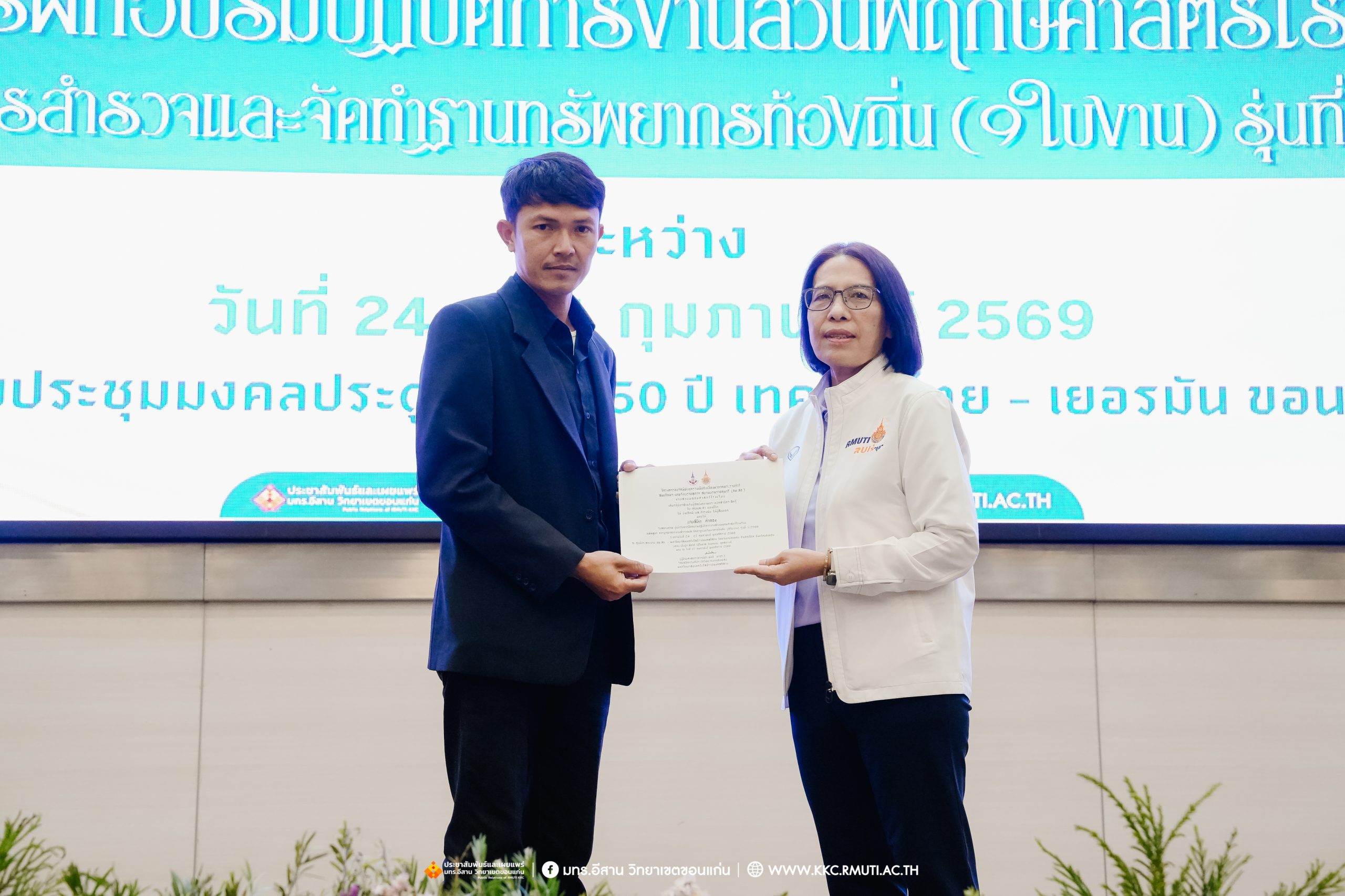 วันศุกร์ที่ 27 กุมภาพันธ์ พ.ศ. 2569 ศูนย์ประสานงานโครงการ อพ.สธ. มหาวิทยาลัยเทคโนโลยีราชมงคลอีสาน วิทยาเขตขอนแก่น โดย รศ.ดร.โฆษิต ศรีภูธร อธิการบดี และผศ.ประพันธ์ ยาวระ รองอธิการบดีประจำวิทยาเขตขอนแก่น มอบ ผศ.ดร.นทยา กัมพลานนท์ ผู้ช่วยอธิการบดี ให้เกียรติมอบเกียรติบัตรแก่ผู้เข้ารับการอบรมปฏิบัติการงานสวนพฤกษศาสตร์โรงเรียน หลักสูตรการบูรณาการงานสำรวจและจัดทำฐานทรัพยากรท้องถิ่น (9 ใบงาน) รุ่นที่ 1/2569 ณ ห้องประชุมมงคลประดู่ ชั้น 3 อาคาร 50 ปี เทคนิค ไทย – เยอรมัน ขอนแก่น โดยโครงการฯ ดำเนินการอบรมในระหว่างวันที่ 24 – 27 กุมภาพันธ์ 2569 ได้รับความสนใจจากสำนักงานการปฏิรูปที่ดินเพื่อการเกษตรส่งบุคลากรพร้อมทั้งเครือข่ายเกษตรกรที่ประสบความสำเร็จในการทำเกษตรยั่งยืน 19 จังหวัด ทั่วทุกภาคของประเทศไทย รวมทั้งสิ้นจำนวน 41 คน และเครือข่ายผู้บริหารและบุคลากรทางการศึกษา 10 แห่ง จำนวน 19 คน