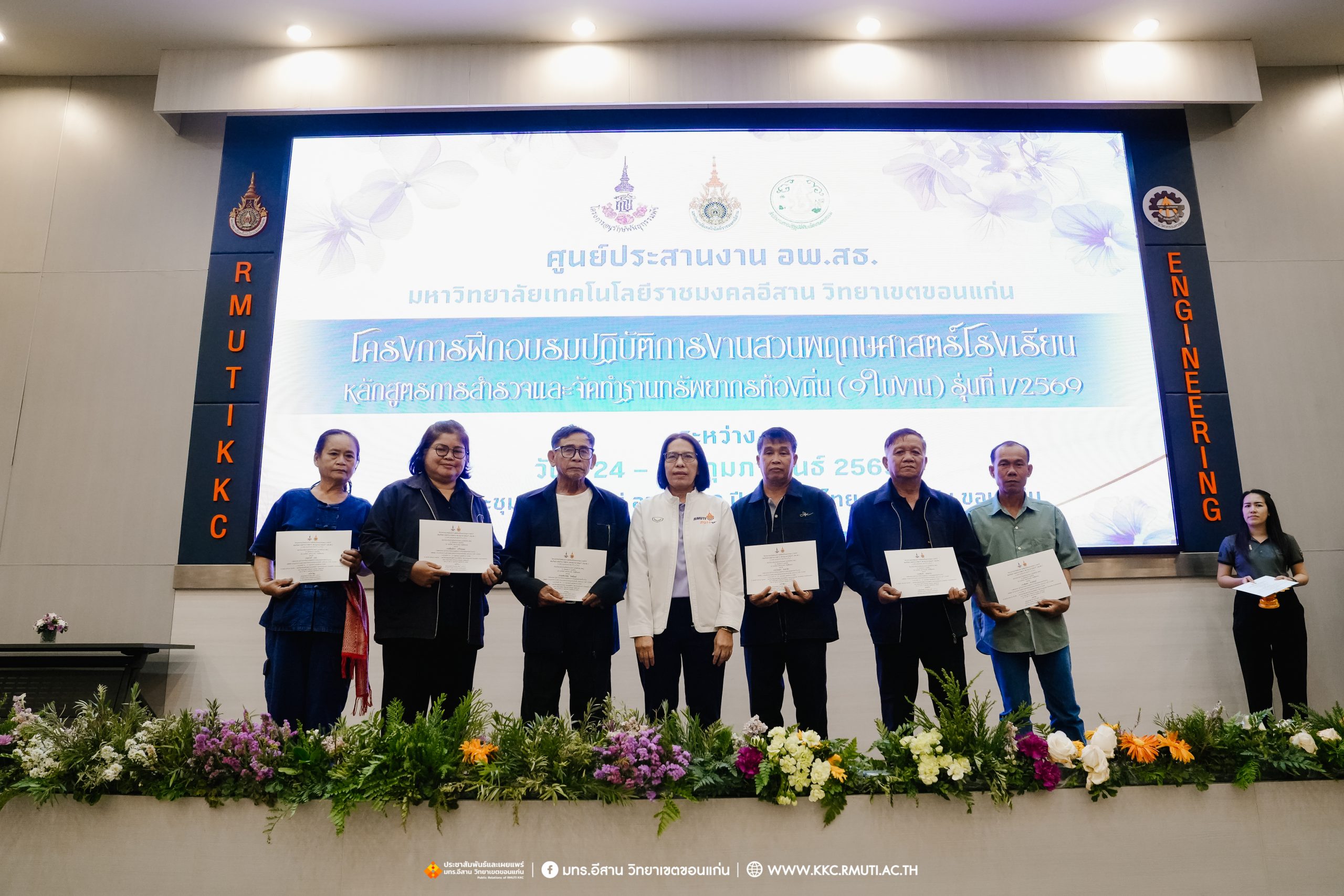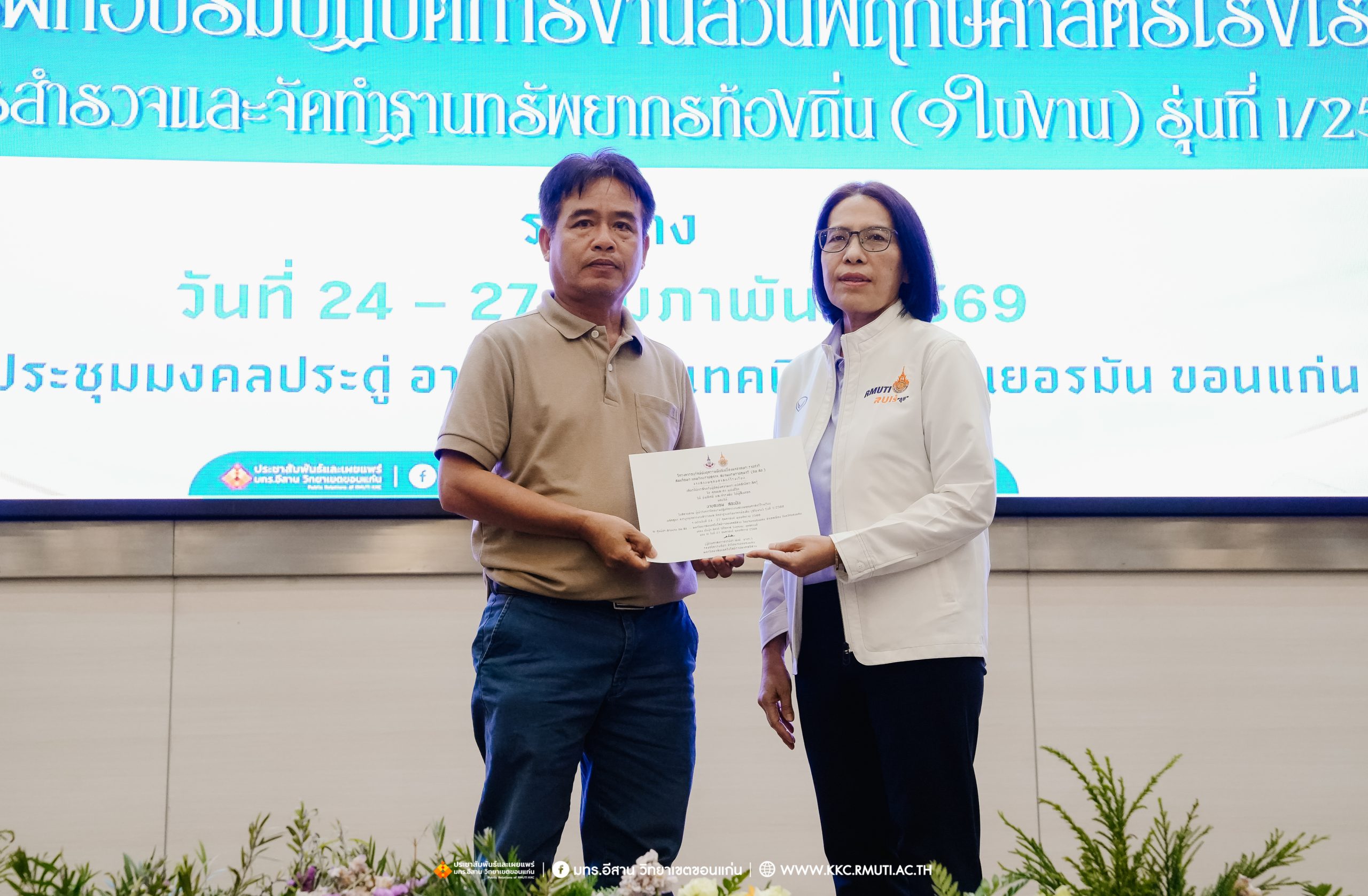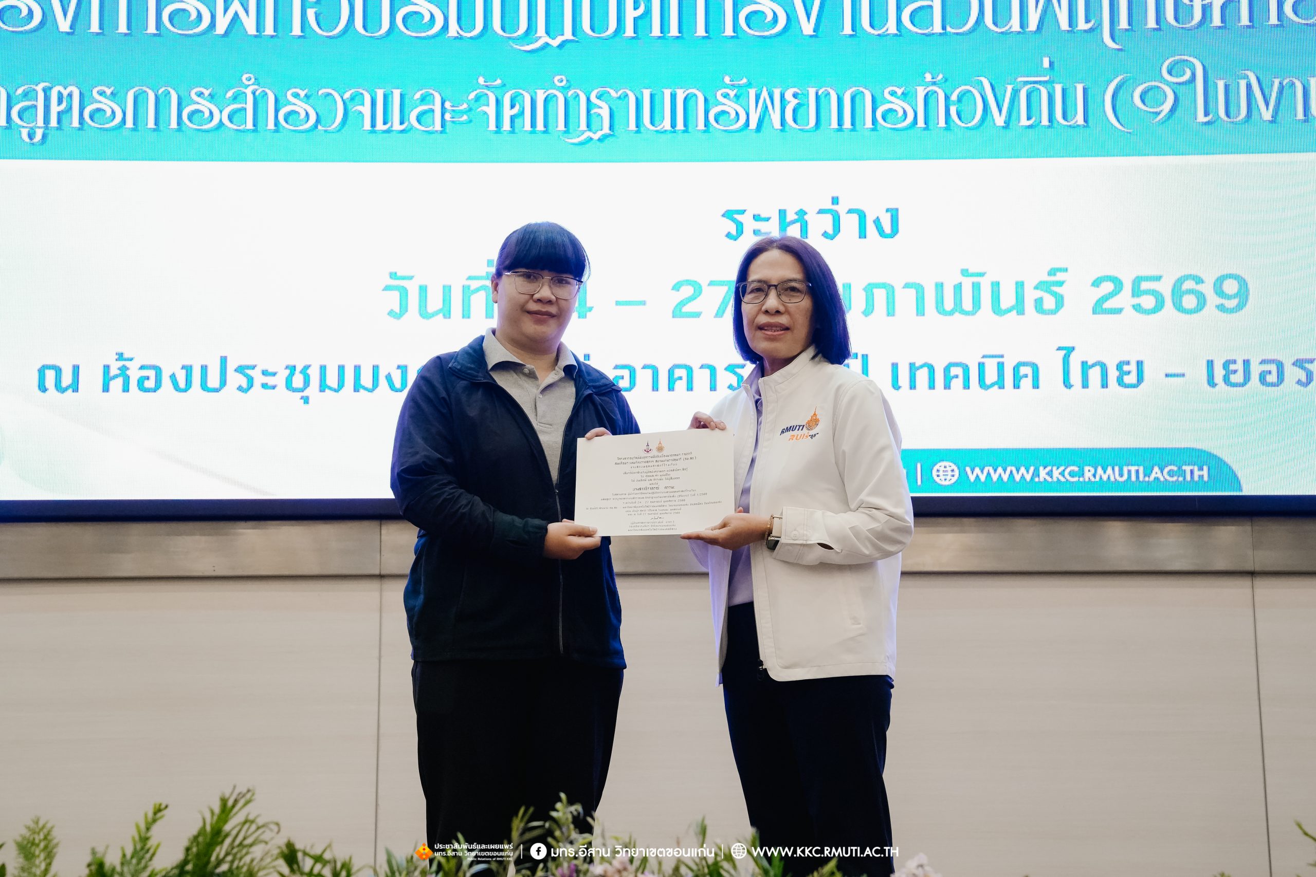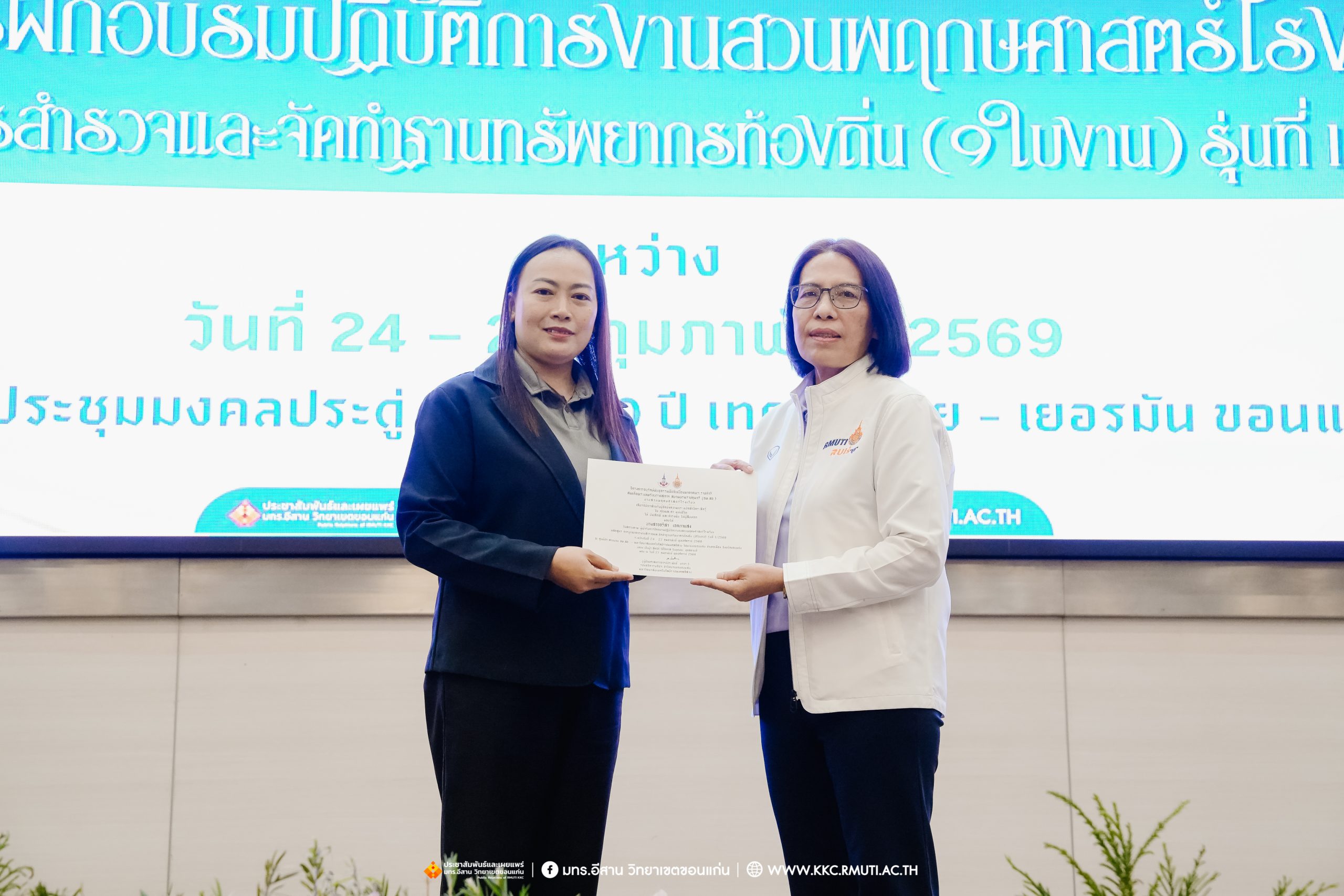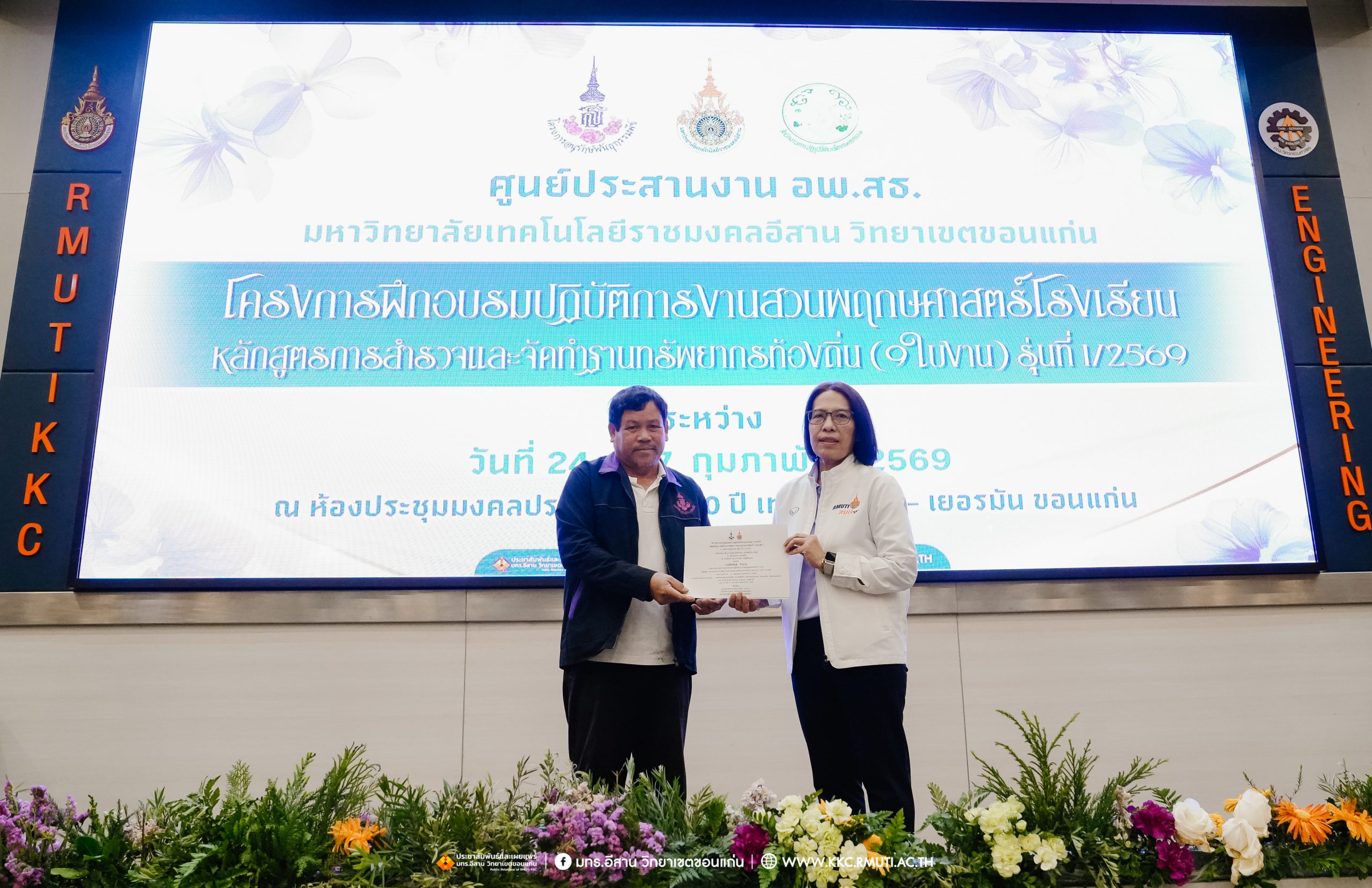 วันศุกร์ที่ 27 กุมภาพันธ์ พ.ศ. 2569 ศูนย์ประสานงานโครงการ อพ.สธ. มหาวิทยาลัยเทคโนโลยีราชมงคลอีสาน วิทยาเขตขอนแก่น โดย รศ.ดร.โฆษิต ศรีภูธร อธิการบดี และผศ.ประพันธ์ ยาวระ รองอธิการบดีประจำวิทยาเขตขอนแก่น มอบ ผศ.ดร.นทยา กัมพลานนท์ ผู้ช่วยอธิการบดี ให้เกียรติมอบเกียรติบัตรแก่ผู้เข้ารับการอบรมปฏิบัติการงานสวนพฤกษศาสตร์โรงเรียน หลักสูตรการบูรณาการงานสำรวจและจัดทำฐานทรัพยากรท้องถิ่น (9 ใบงาน) รุ่นที่ 1/2569 ณ ห้องประชุมมงคลประดู่ ชั้น 3 อาคาร 50 ปี เทคนิค ไทย – เยอรมัน ขอนแก่น โดยโครงการฯ ดำเนินการอบรมในระหว่างวันที่ 24 – 27 กุมภาพันธ์ 2569 ได้รับความสนใจจากสำนักงานการปฏิรูปที่ดินเพื่อการเกษตรส่งบุคลากรพร้อมทั้งเครือข่ายเกษตรกรที่ประสบความสำเร็จในการทำเกษตรยั่งยืน 19 จังหวัด ทั่วทุกภาคของประเทศไทย รวมทั้งสิ้นจำนวน 41 คน และเครือข่ายผู้บริหารและบุคลากรทางการศึกษา 10 แห่ง จำนวน 19 คน