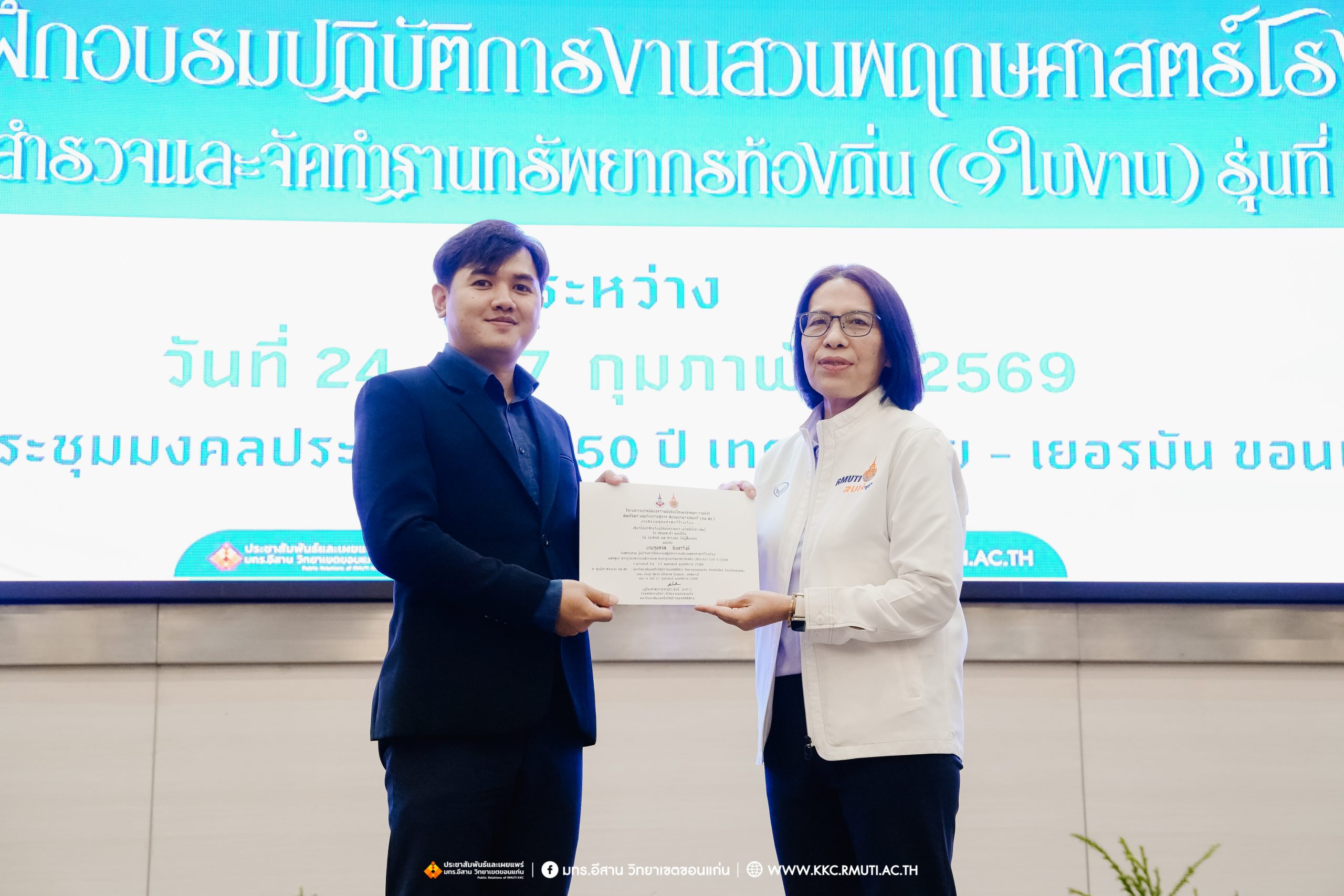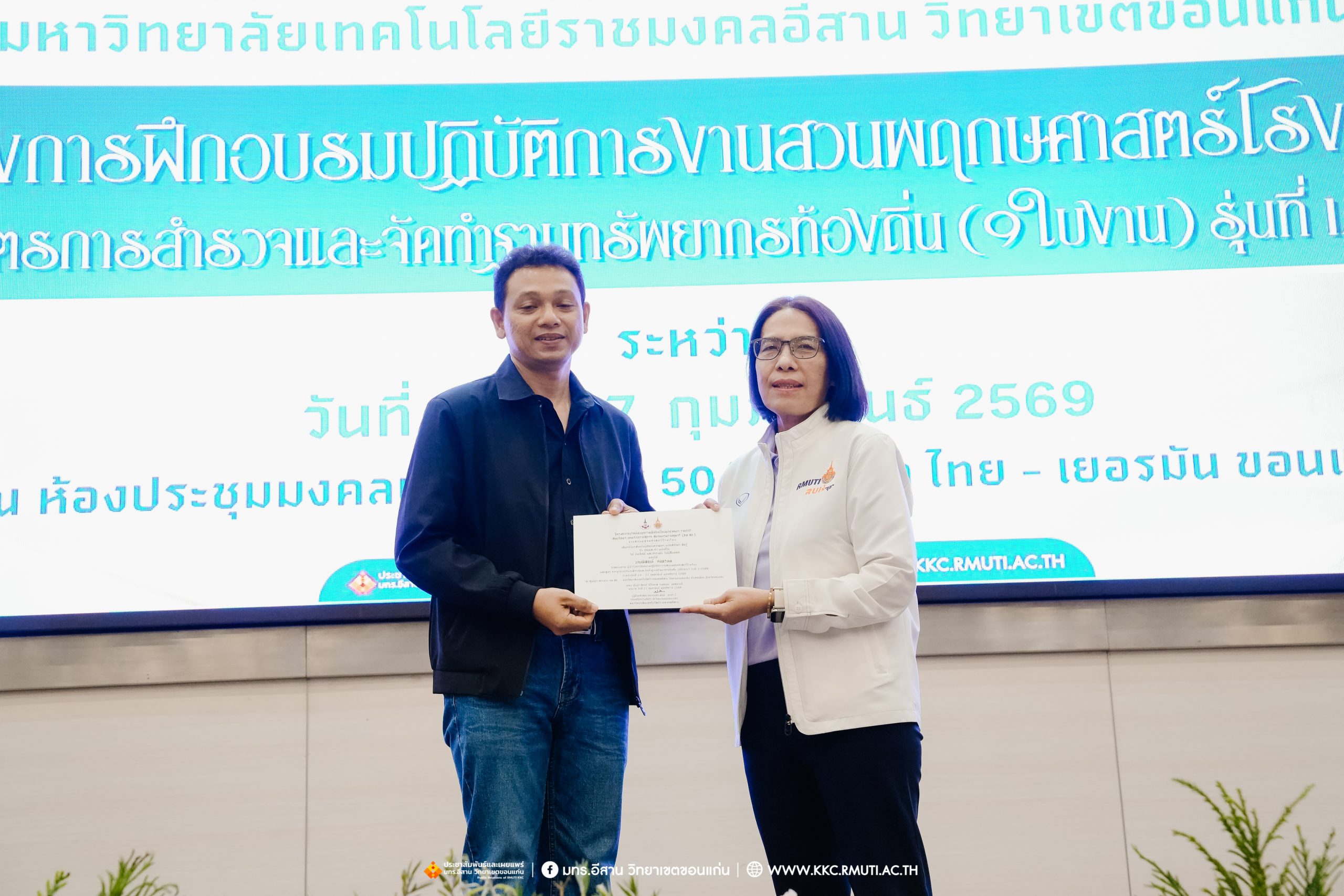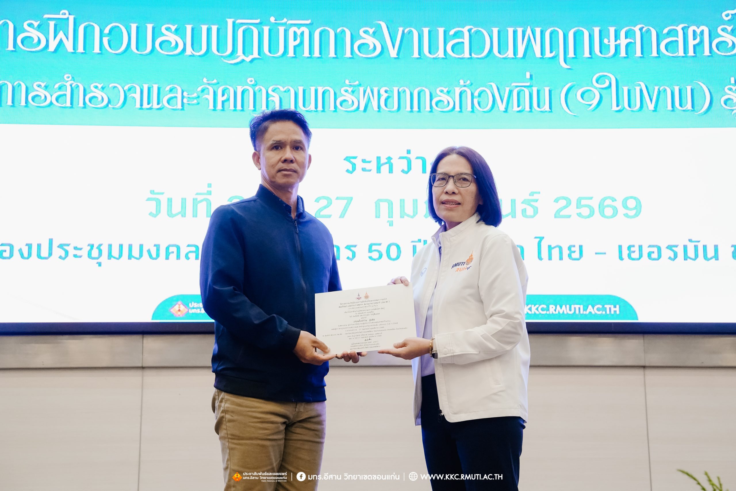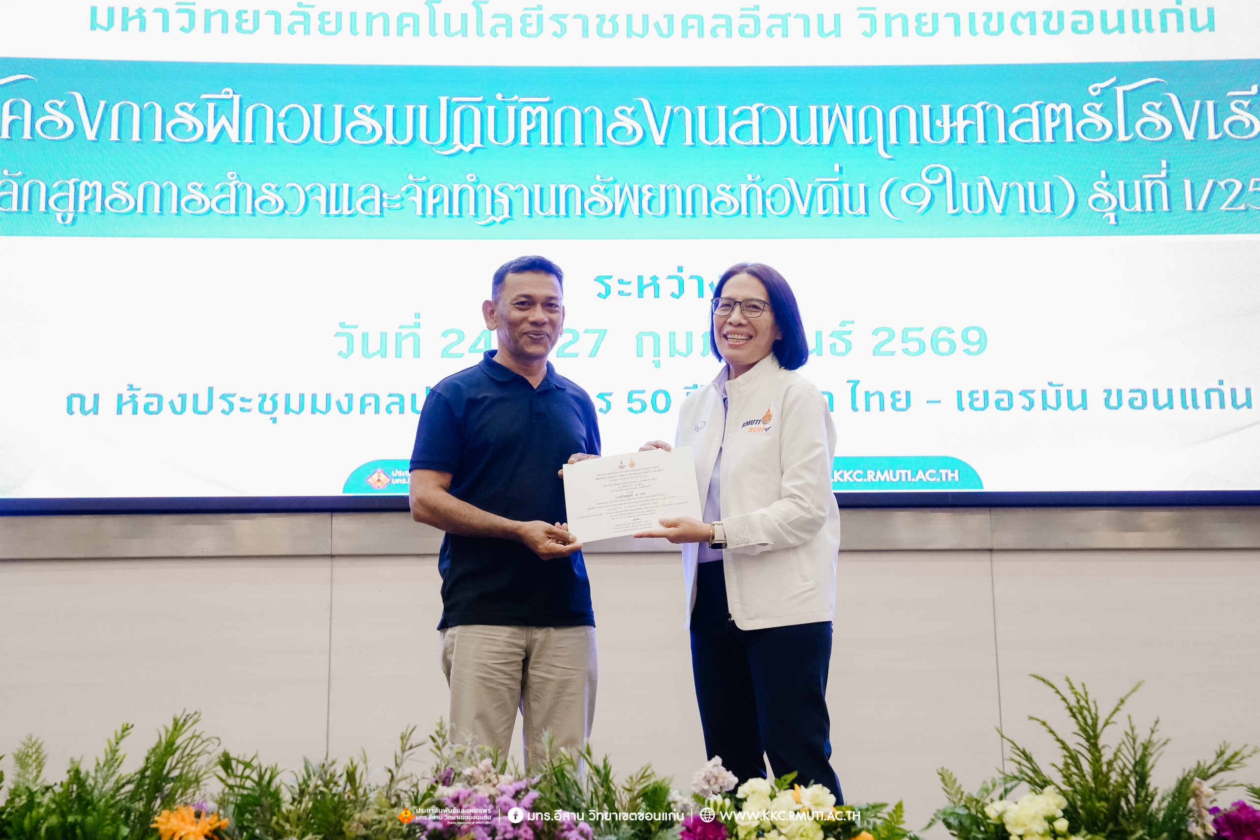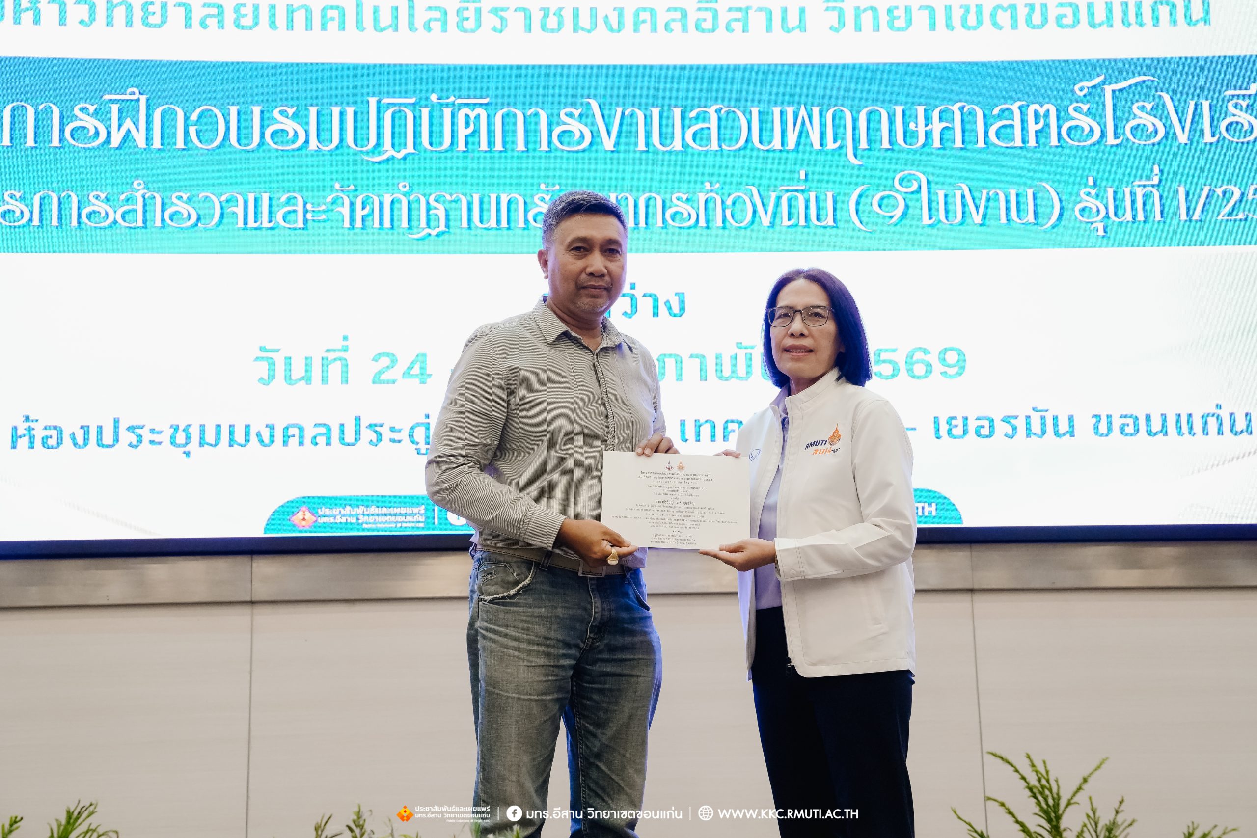วันศุกร์ที่ 27 กุมภาพันธ์ พ.ศ. 2569 ศูนย์ประสานงานโครงการ อพ.สธ. มหาวิทยาลัยเทคโนโลยีราชมงคลอีสาน วิทยาเขตขอนแก่น โดย รศ.ดร.โฆษิต ศรีภูธร อธิการบดี และผศ.ประพันธ์ ยาวระ รองอธิการบดีประจำวิทยาเขตขอนแก่น มอบ ผศ.ดร.นทยา กัมพลานนท์ ผู้ช่วยอธิการบดี ให้เกียรติมอบเกียรติบัตรแก่ผู้เข้ารับการอบรมปฏิบัติการงานสวนพฤกษศาสตร์โรงเรียน หลักสูตรการบูรณาการงานสำรวจและจัดทำฐานทรัพยากรท้องถิ่น (9 ใบงาน) รุ่นที่ 1/2569 ณ ห้องประชุมมงคลประดู่ ชั้น 3 อาคาร 50 ปี เทคนิค ไทย – เยอรมัน ขอนแก่น โดยโครงการฯ ดำเนินการอบรมในระหว่างวันที่ 24 – 27 กุมภาพันธ์ 2569 ได้รับความสนใจจากสำนักงานการปฏิรูปที่ดินเพื่อการเกษตรส่งบุคลากรพร้อมทั้งเครือข่ายเกษตรกรที่ประสบความสำเร็จในการทำเกษตรยั่งยืน 19 จังหวัด ทั่วทุกภาคของประเทศไทย รวมทั้งสิ้นจำนวน 41 คน และเครือข่ายผู้บริหารและบุคลากรทางการศึกษา 10 แห่ง จำนวน 19 คน