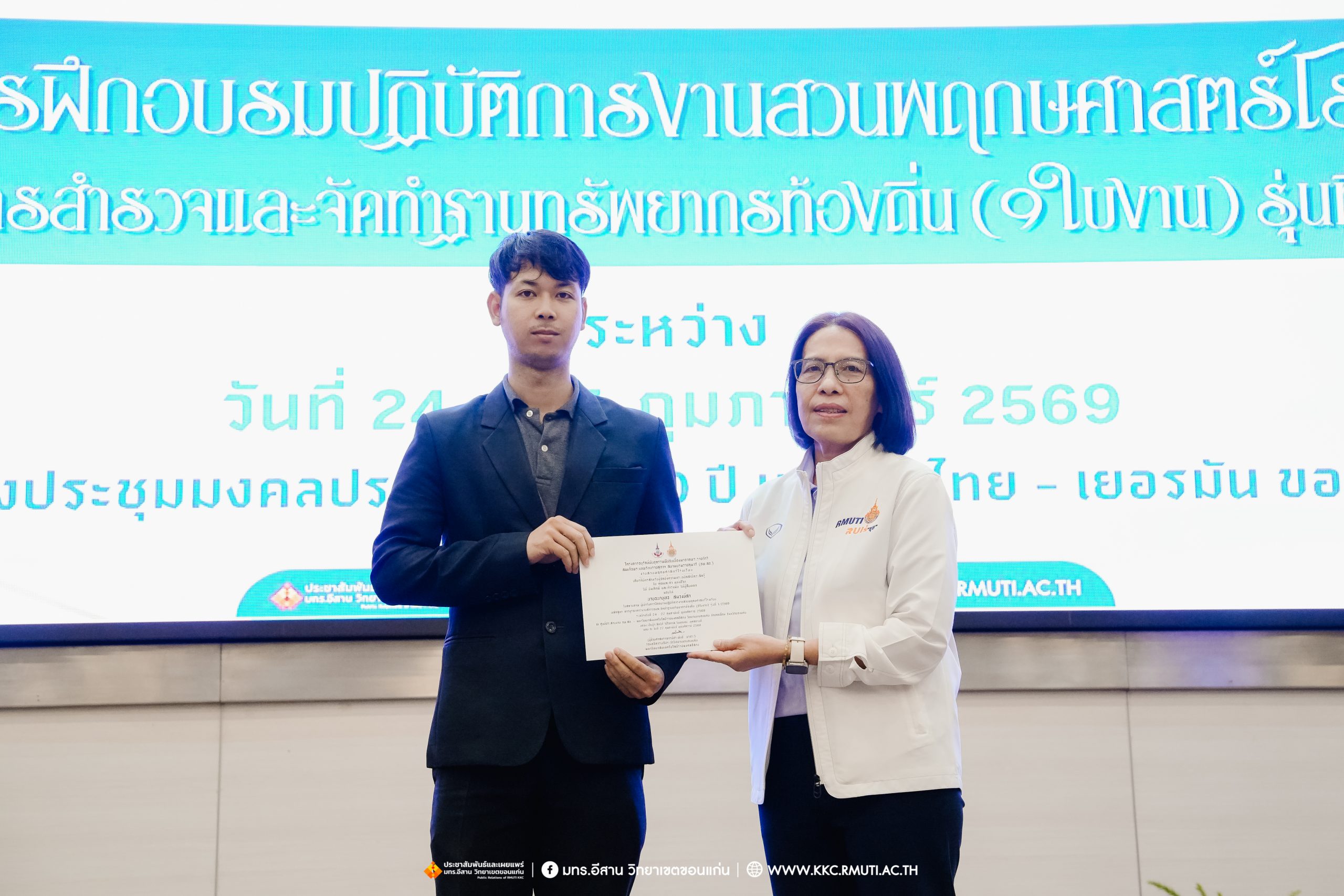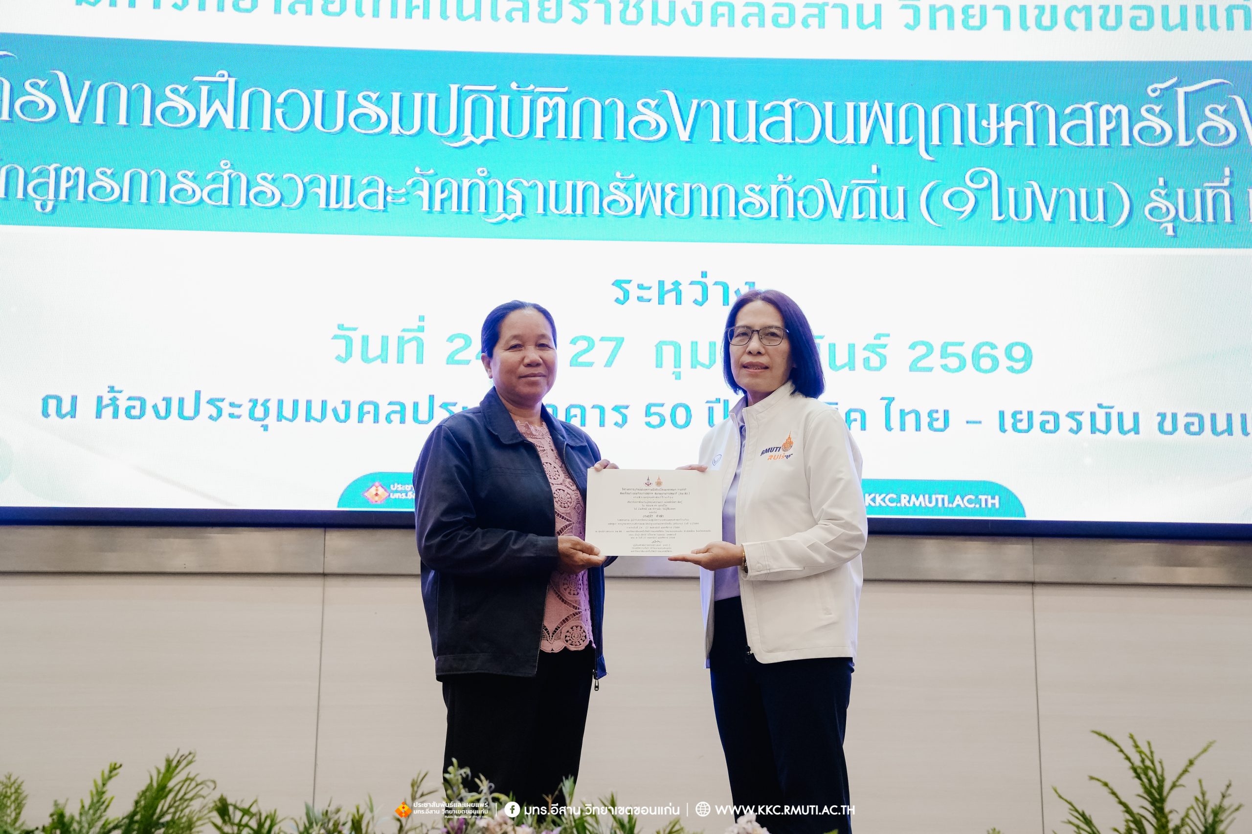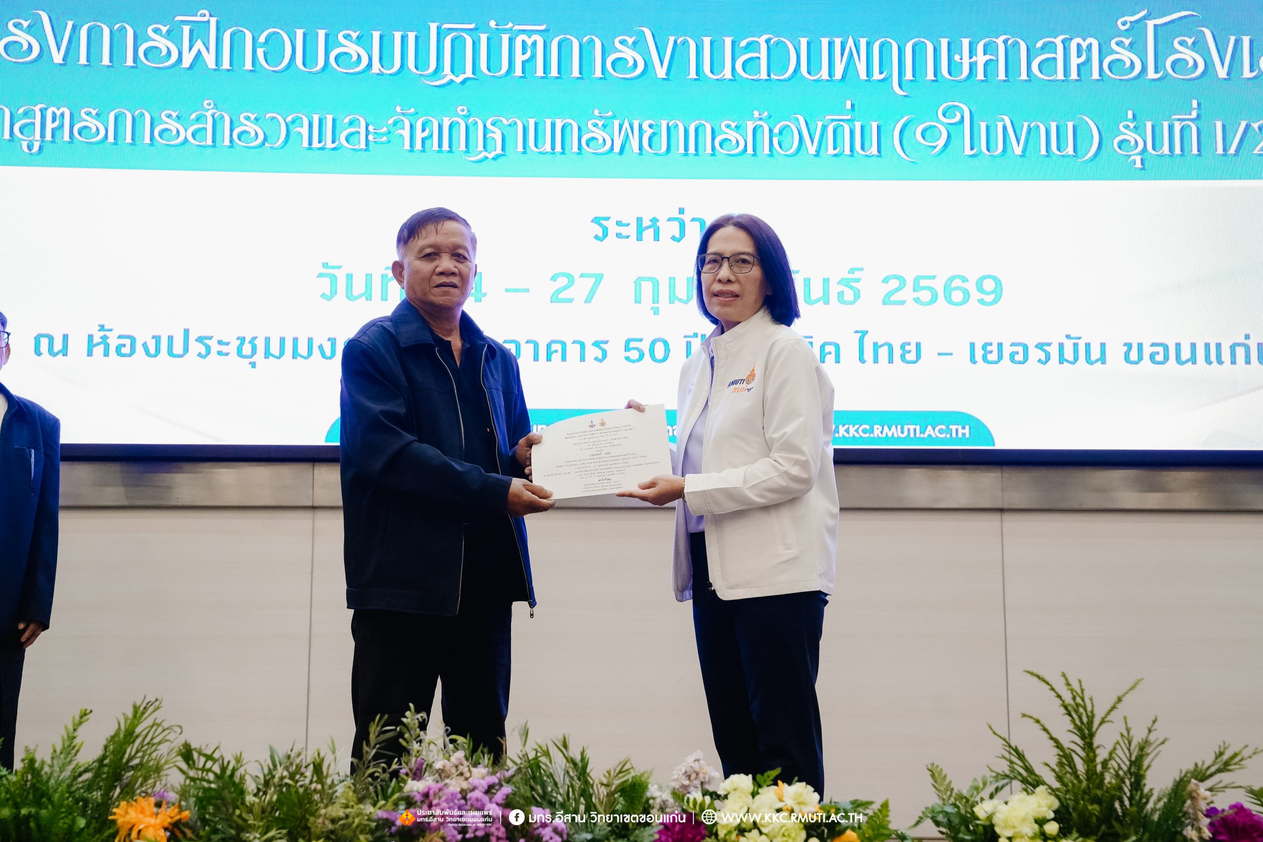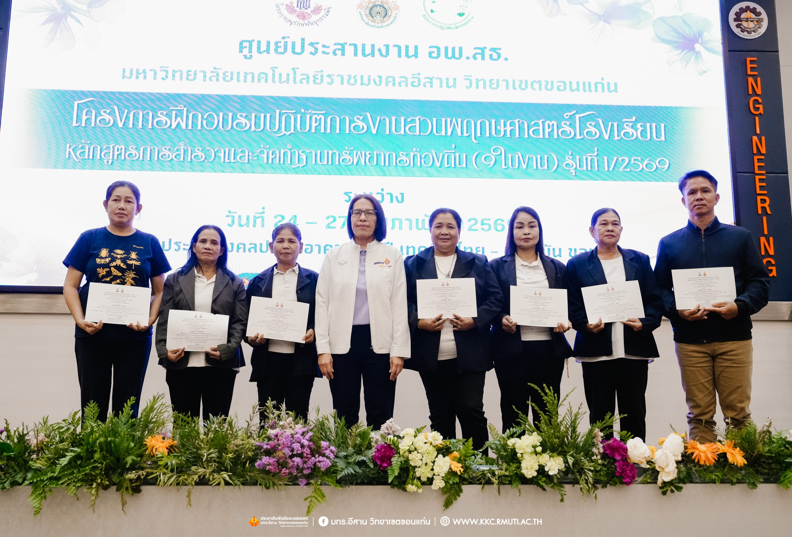 วันศุกร์ที่ 27 กุมภาพันธ์ พ.ศ. 2569 ศูนย์ประสานงานโครงการ อพ.สธ. มหาวิทยาลัยเทคโนโลยีราชมงคลอีสาน วิทยาเขตขอนแก่น โดย รศ.ดร.โฆษิต ศรีภูธร อธิการบดี และผศ.ประพันธ์ ยาวระ รองอธิการบดีประจำวิทยาเขตขอนแก่น มอบ ผศ.ดร.นทยา กัมพลานนท์ ผู้ช่วยอธิการบดี ให้เกียรติมอบเกียรติบัตรแก่ผู้เข้ารับการอบรมปฏิบัติการงานสวนพฤกษศาสตร์โรงเรียน หลักสูตรการบูรณาการงานสำรวจและจัดทำฐานทรัพยากรท้องถิ่น (9 ใบงาน) รุ่นที่ 1/2569 ณ ห้องประชุมมงคลประดู่ ชั้น 3 อาคาร 50 ปี เทคนิค ไทย – เยอรมัน ขอนแก่น โดยโครงการฯ ดำเนินการอบรมในระหว่างวันที่ 24 – 27 กุมภาพันธ์ 2569 ได้รับความสนใจจากสำนักงานการปฏิรูปที่ดินเพื่อการเกษตรส่งบุคลากรพร้อมทั้งเครือข่ายเกษตรกรที่ประสบความสำเร็จในการทำเกษตรยั่งยืน 19 จังหวัด ทั่วทุกภาคของประเทศไทย รวมทั้งสิ้นจำนวน 41 คน และเครือข่ายผู้บริหารและบุคลากรทางการศึกษา 10 แห่ง จำนวน 19 คน