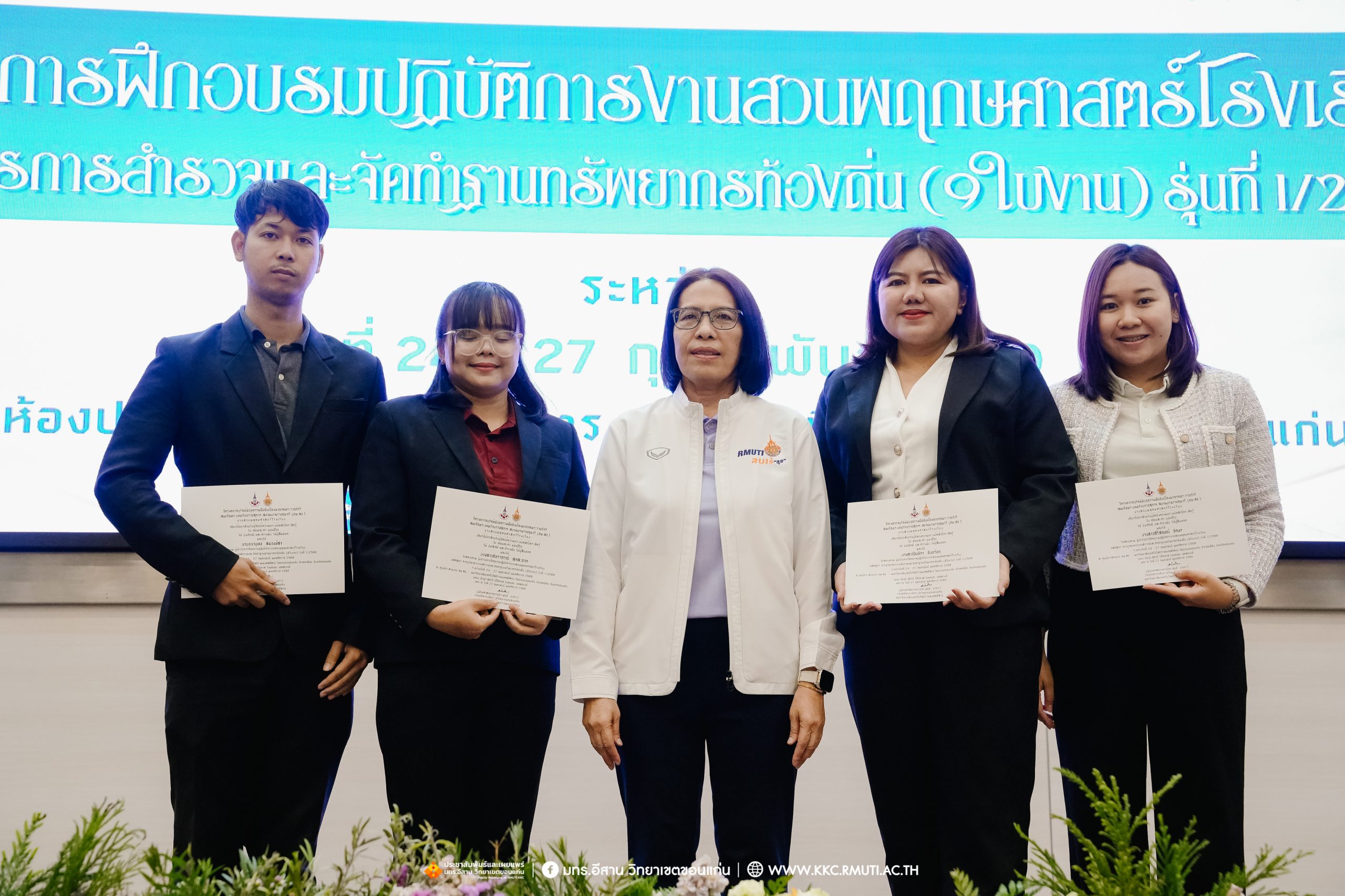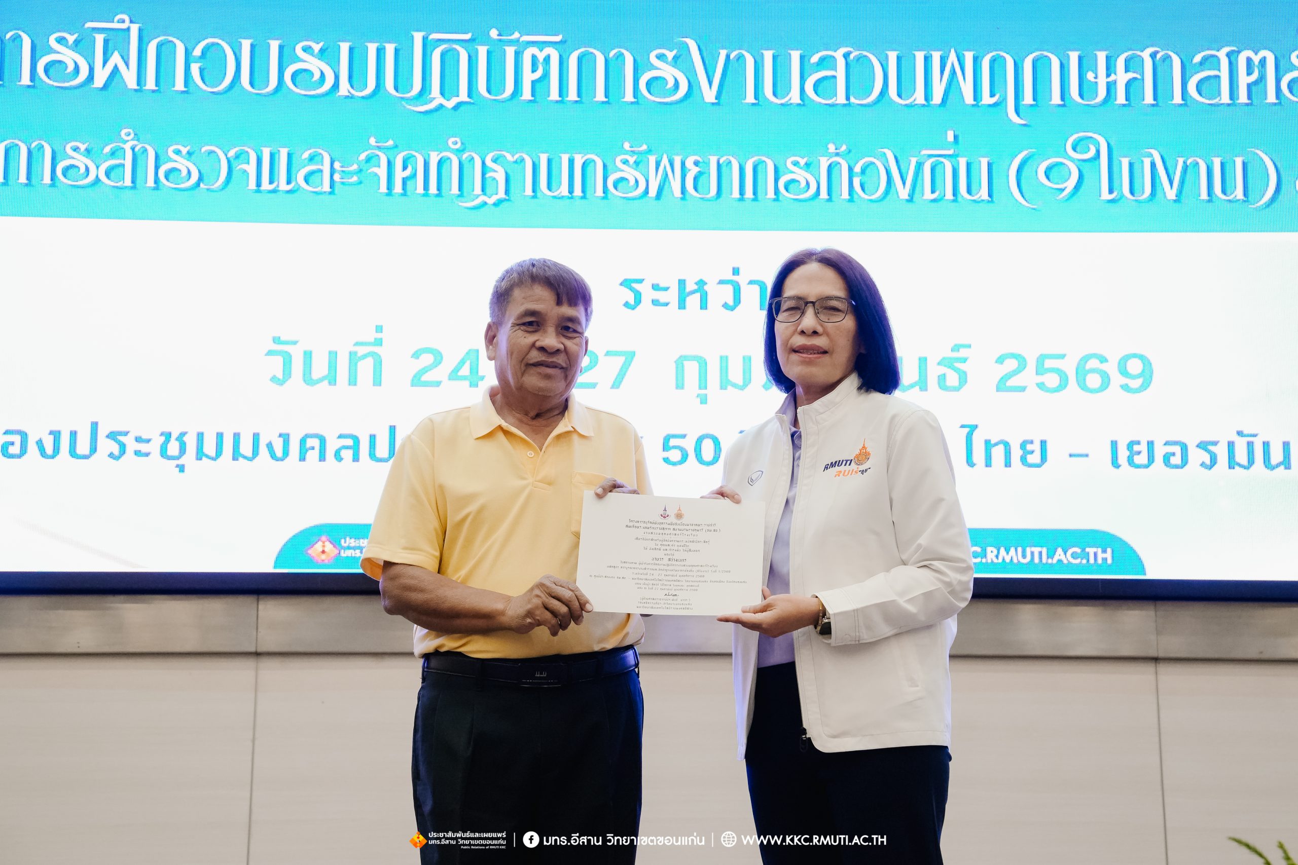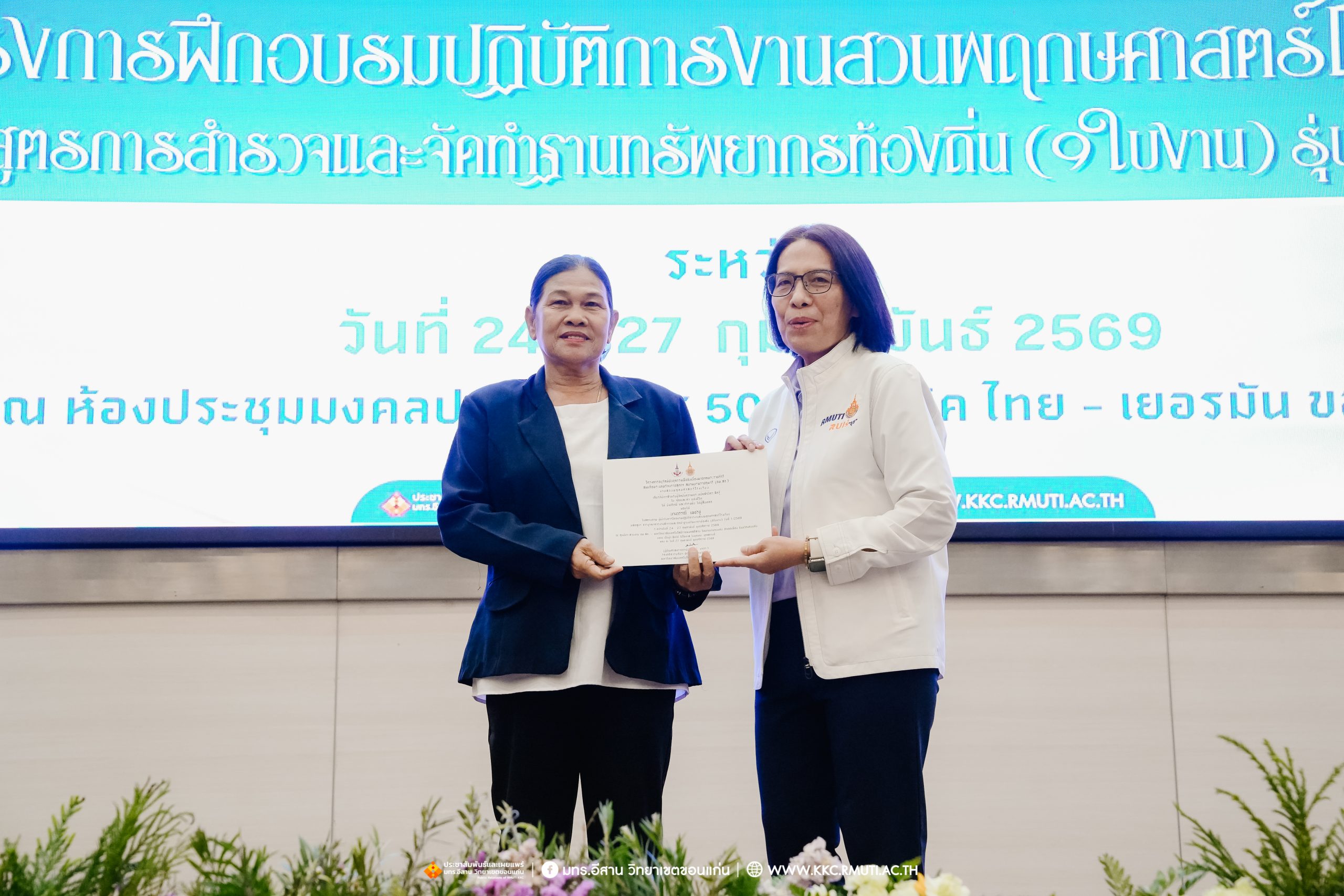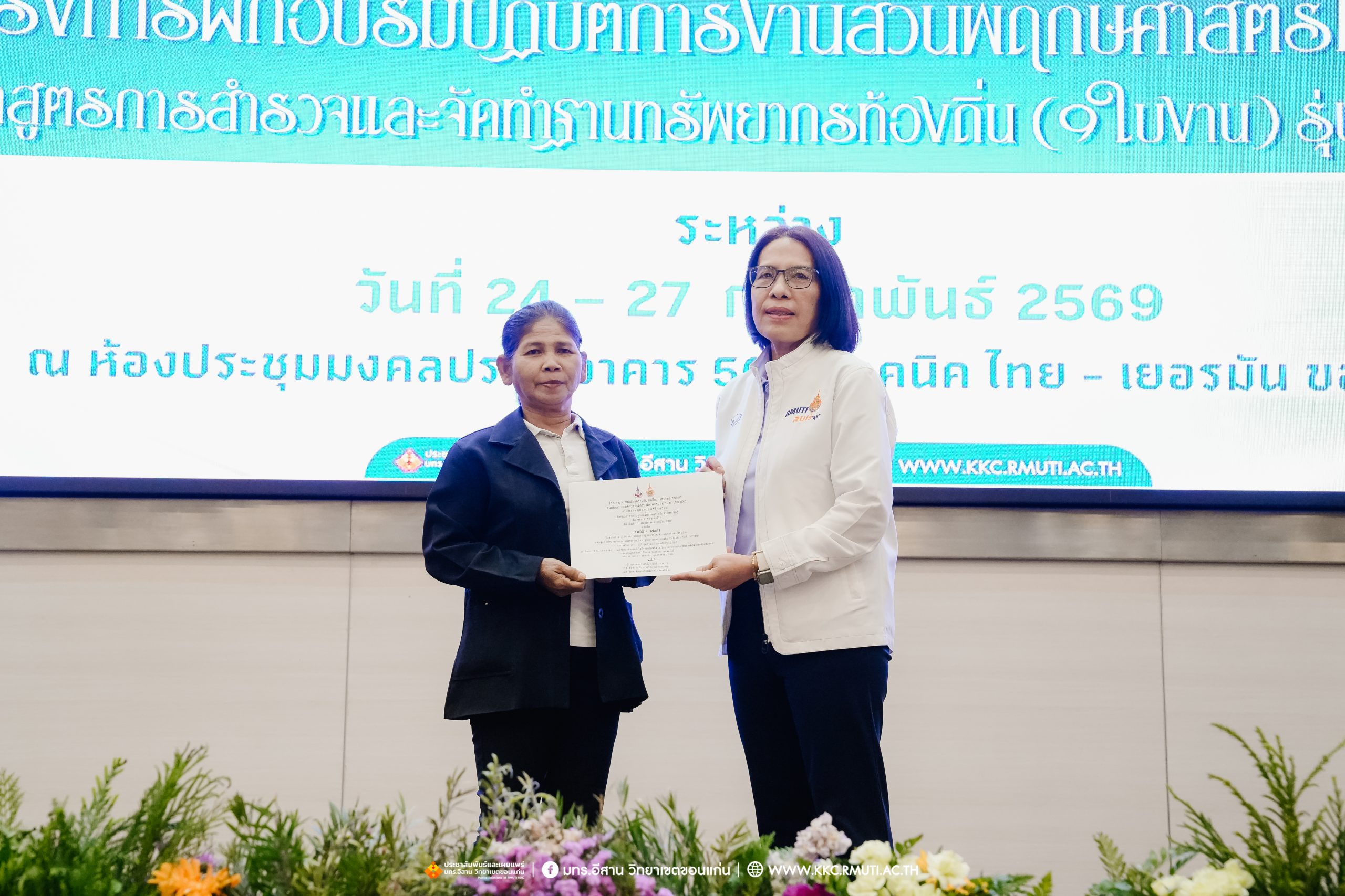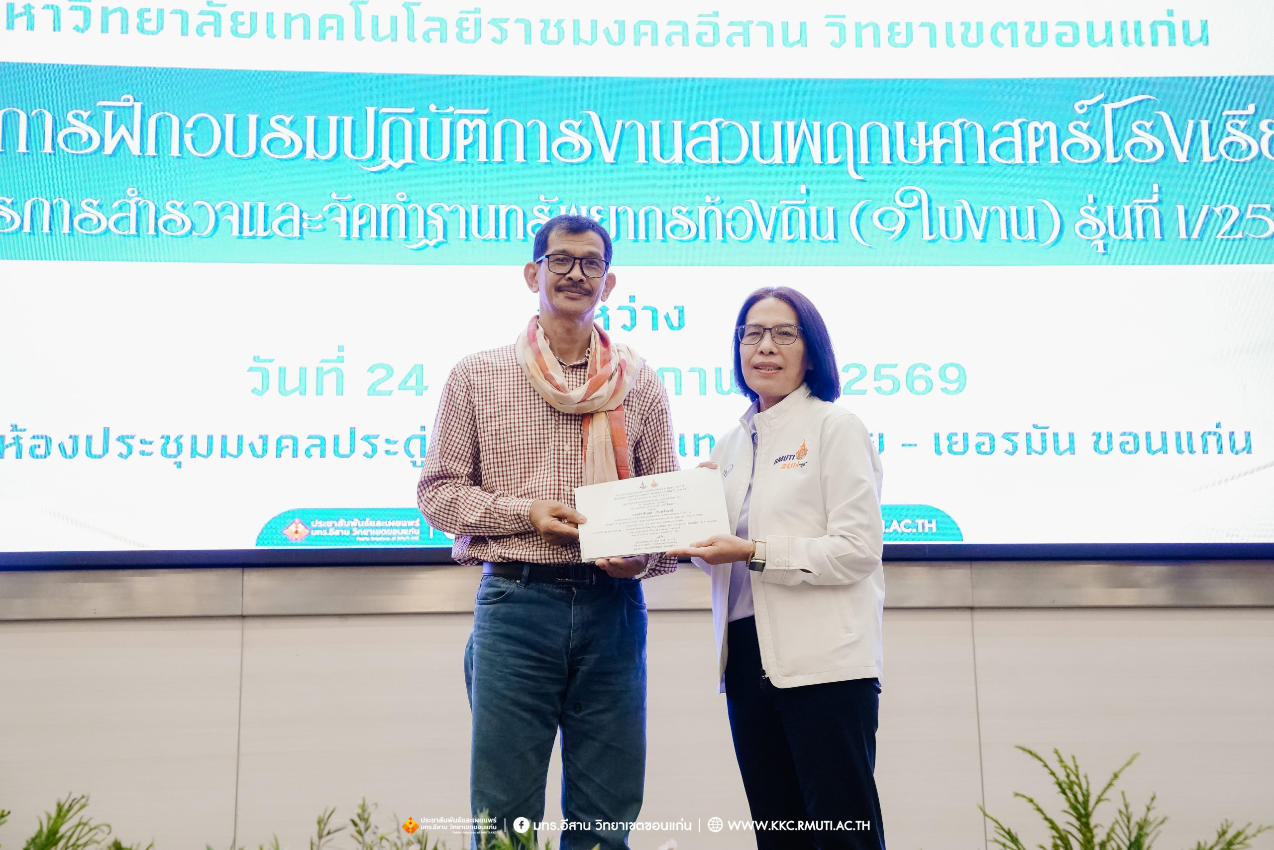 วันศุกร์ที่ 27 กุมภาพันธ์ พ.ศ. 2569 ศูนย์ประสานงานโครงการ อพ.สธ. มหาวิทยาลัยเทคโนโลยีราชมงคลอีสาน วิทยาเขตขอนแก่น โดย รศ.ดร.โฆษิต ศรีภูธร อธิการบดี และผศ.ประพันธ์ ยาวระ รองอธิการบดีประจำวิทยาเขตขอนแก่น มอบ ผศ.ดร.นทยา กัมพลานนท์ ผู้ช่วยอธิการบดี ให้เกียรติมอบเกียรติบัตรแก่ผู้เข้ารับการอบรมปฏิบัติการงานสวนพฤกษศาสตร์โรงเรียน หลักสูตรการบูรณาการงานสำรวจและจัดทำฐานทรัพยากรท้องถิ่น (9 ใบงาน) รุ่นที่ 1/2569 ณ ห้องประชุมมงคลประดู่ ชั้น 3 อาคาร 50 ปี เทคนิค ไทย – เยอรมัน ขอนแก่น โดยโครงการฯ ดำเนินการอบรมในระหว่างวันที่ 24 – 27 กุมภาพันธ์ 2569 ได้รับความสนใจจากสำนักงานการปฏิรูปที่ดินเพื่อการเกษตรส่งบุคลากรพร้อมทั้งเครือข่ายเกษตรกรที่ประสบความสำเร็จในการทำเกษตรยั่งยืน 19 จังหวัด ทั่วทุกภาคของประเทศไทย รวมทั้งสิ้นจำนวน 41 คน และเครือข่ายผู้บริหารและบุคลากรทางการศึกษา 10 แห่ง จำนวน 19 คน