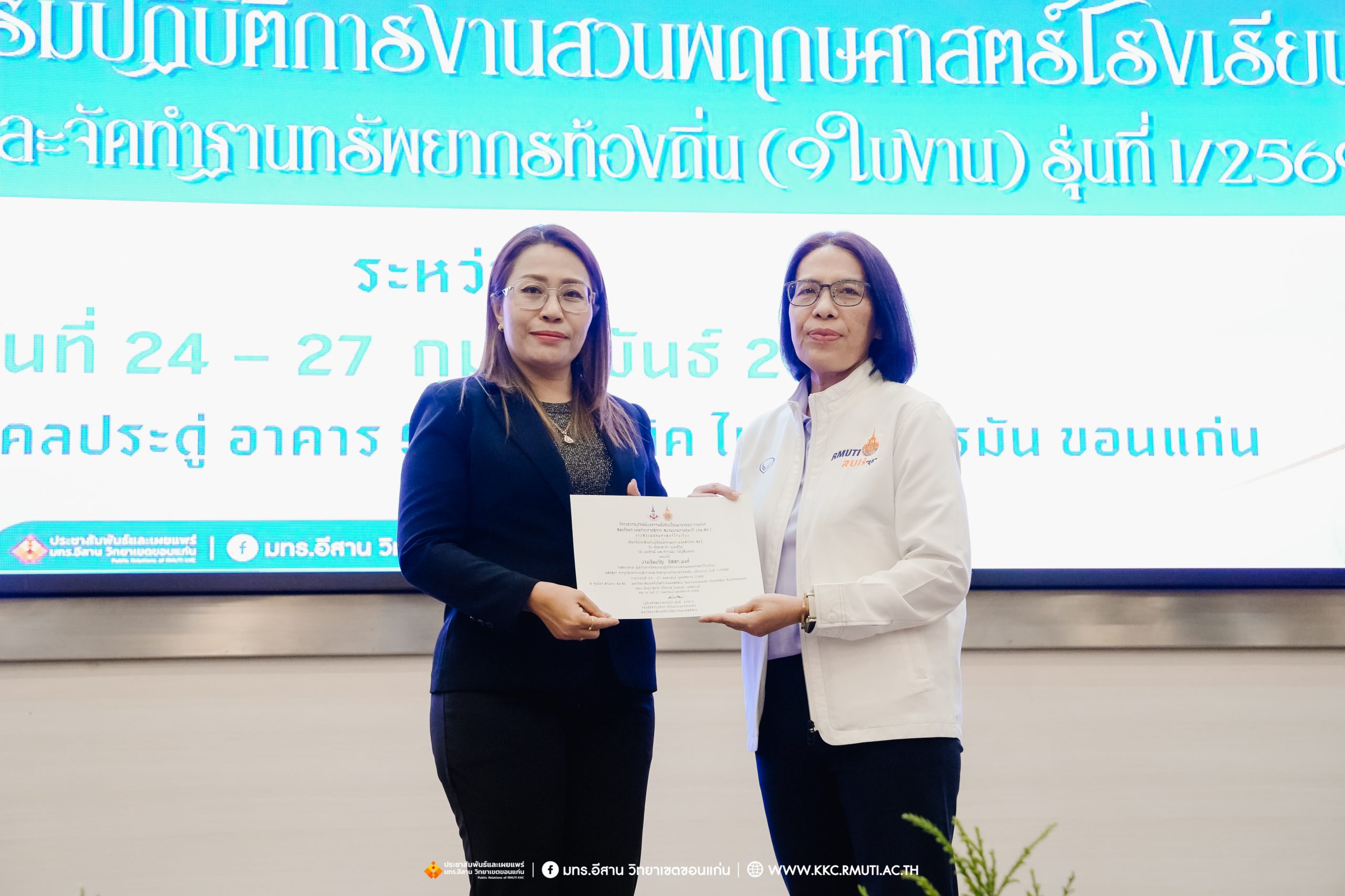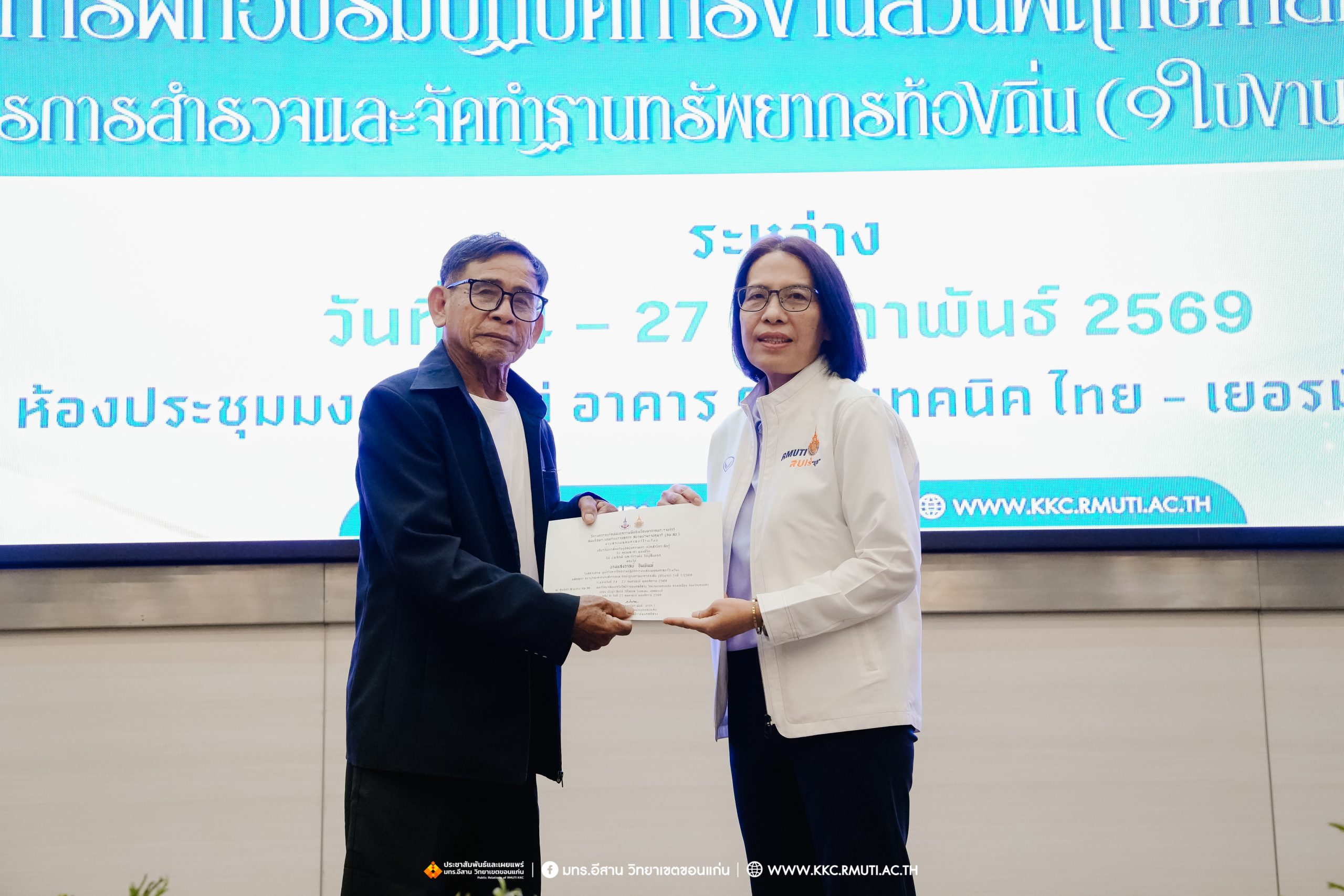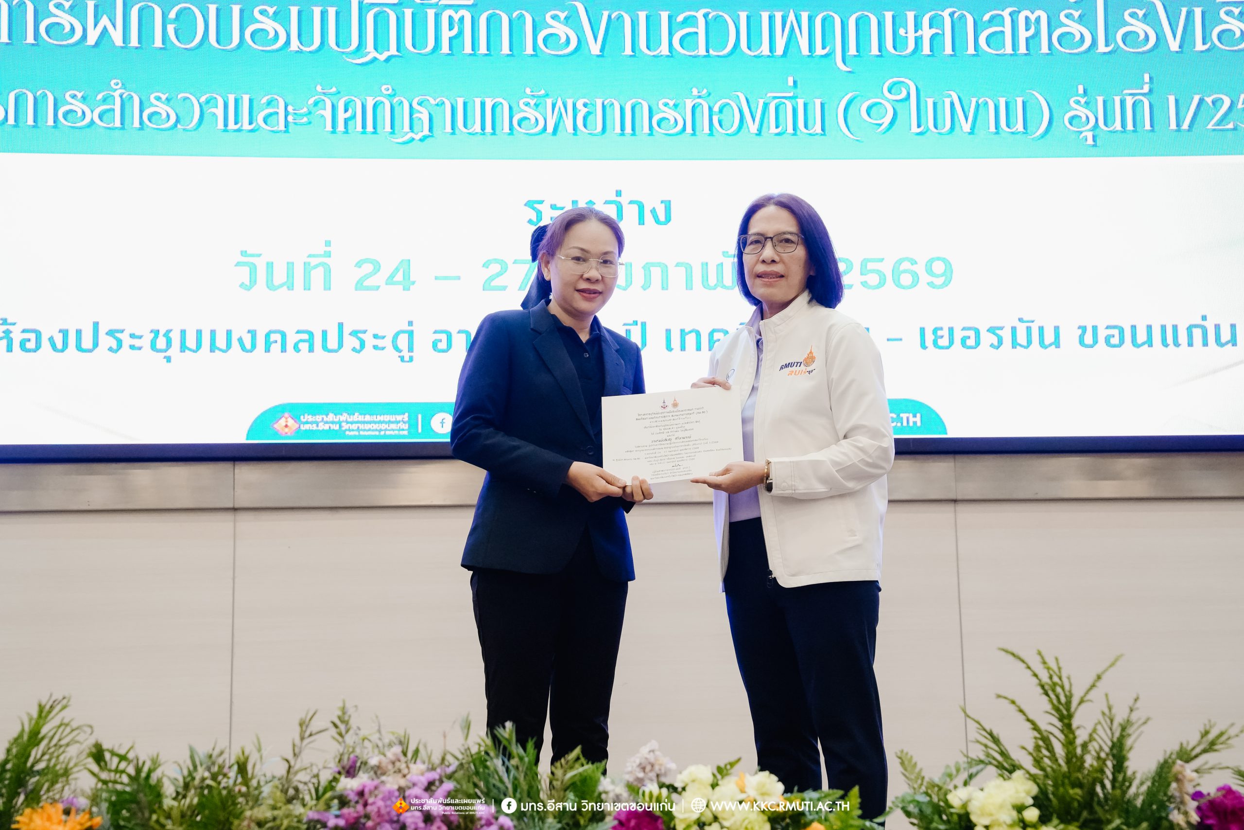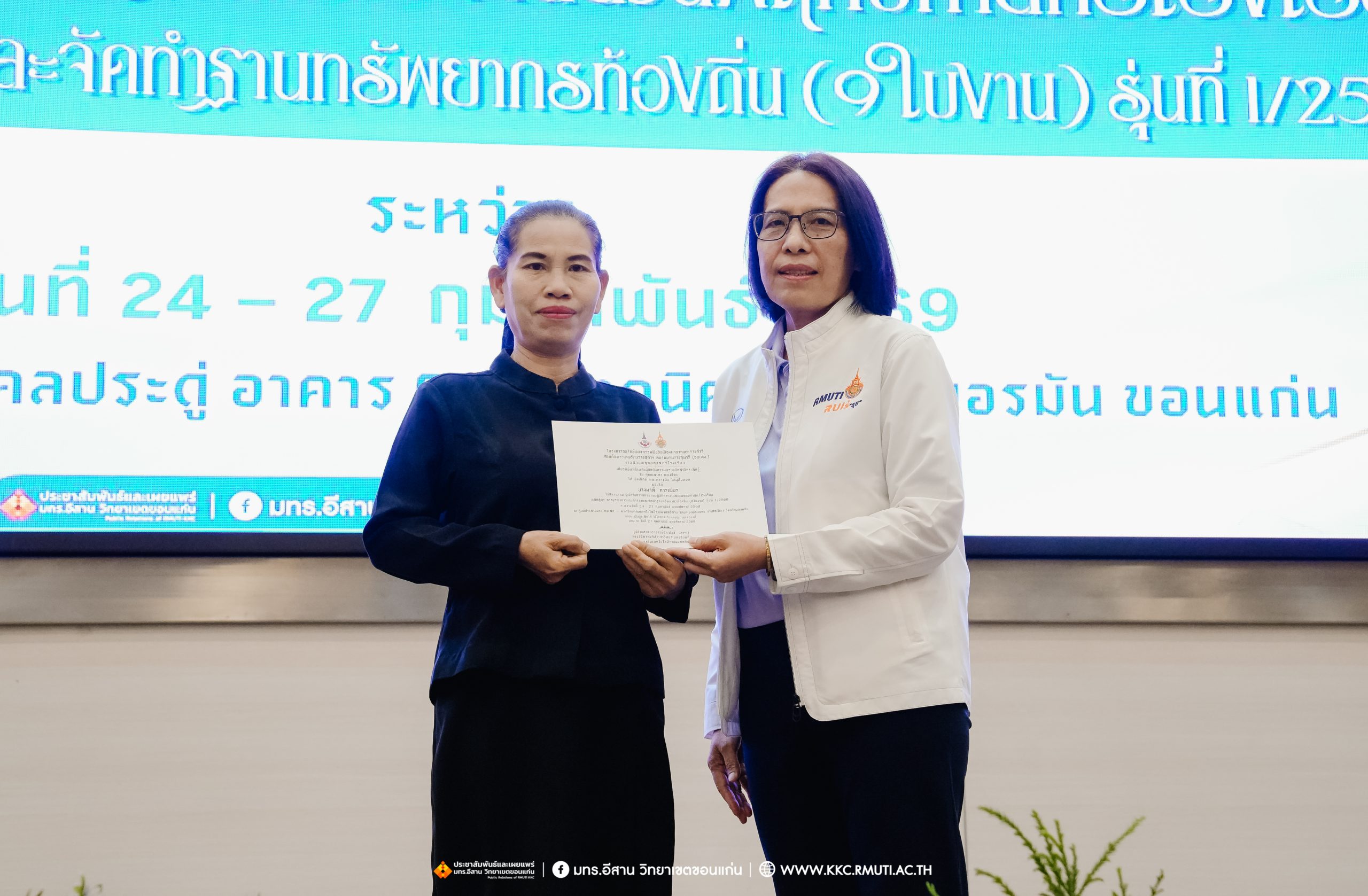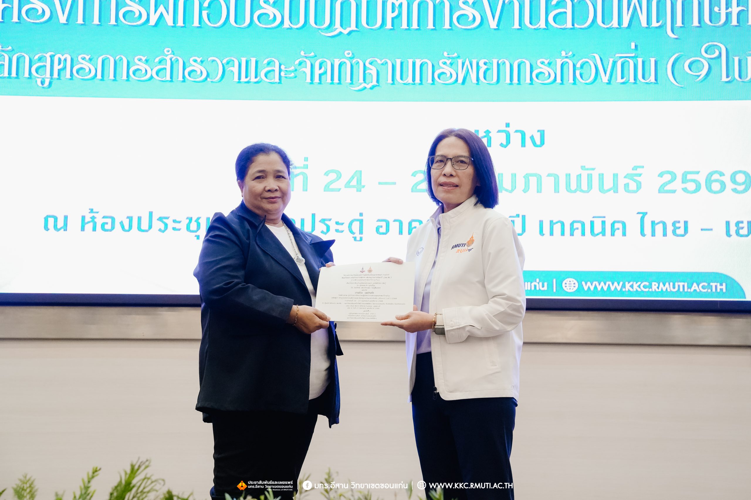วันศุกร์ที่ 27 กุมภาพันธ์ พ.ศ. 2569 ศูนย์ประสานงานโครงการ อพ.สธ. มหาวิทยาลัยเทคโนโลยีราชมงคลอีสาน วิทยาเขตขอนแก่น โดย รศ.ดร.โฆษิต ศรีภูธร อธิการบดี และผศ.ประพันธ์ ยาวระ รองอธิการบดีประจำวิทยาเขตขอนแก่น มอบ ผศ.ดร.นทยา กัมพลานนท์ ผู้ช่วยอธิการบดี ให้เกียรติมอบเกียรติบัตรแก่ผู้เข้ารับการอบรมปฏิบัติการงานสวนพฤกษศาสตร์โรงเรียน หลักสูตรการบูรณาการงานสำรวจและจัดทำฐานทรัพยากรท้องถิ่น (9 ใบงาน) รุ่นที่ 1/2569 ณ ห้องประชุมมงคลประดู่ ชั้น 3 อาคาร 50 ปี เทคนิค ไทย – เยอรมัน ขอนแก่น โดยโครงการฯ ดำเนินการอบรมในระหว่างวันที่ 24 – 27 กุมภาพันธ์ 2569 ได้รับความสนใจจากสำนักงานการปฏิรูปที่ดินเพื่อการเกษตรส่งบุคลากรพร้อมทั้งเครือข่ายเกษตรกรที่ประสบความสำเร็จในการทำเกษตรยั่งยืน 19 จังหวัด ทั่วทุกภาคของประเทศไทย รวมทั้งสิ้นจำนวน 41 คน และเครือข่ายผู้บริหารและบุคลากรทางการศึกษา 10 แห่ง จำนวน 19 คน
