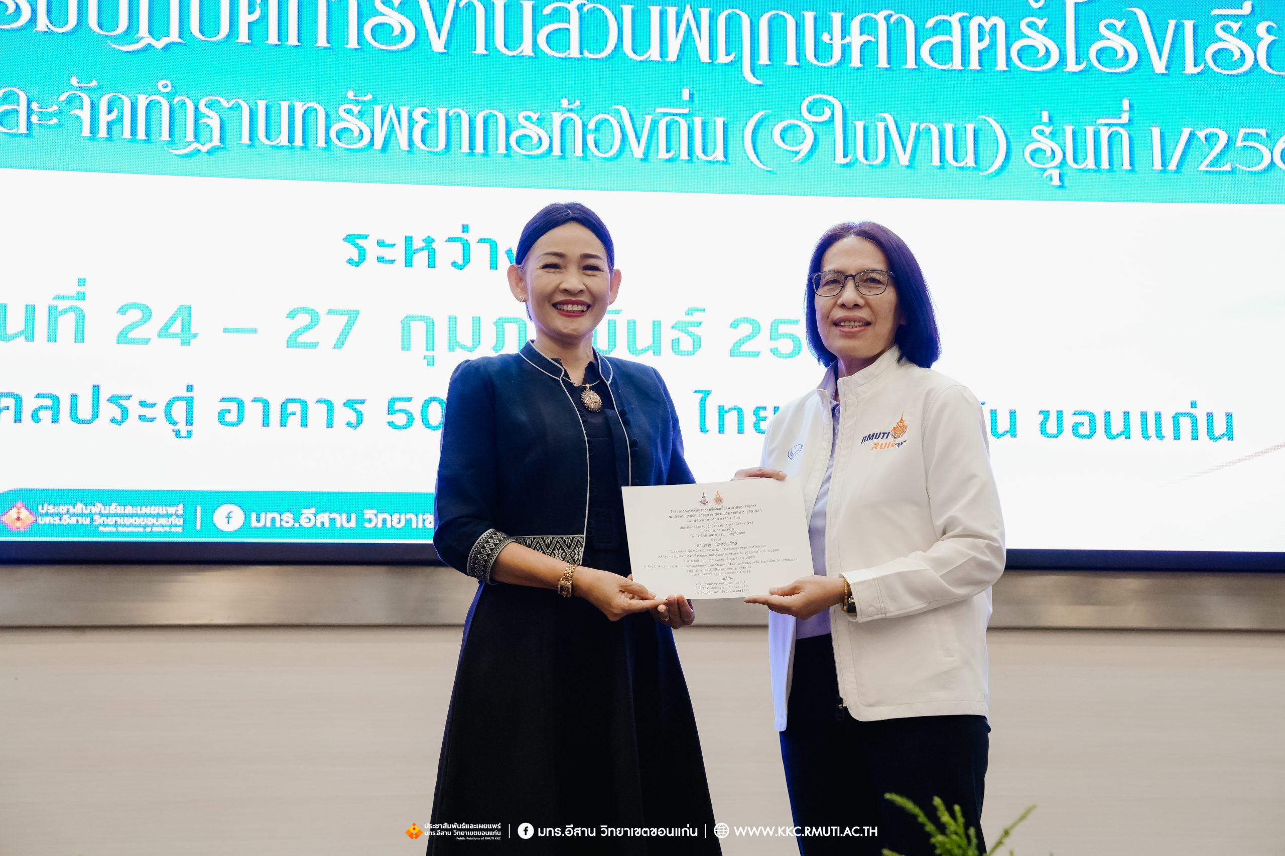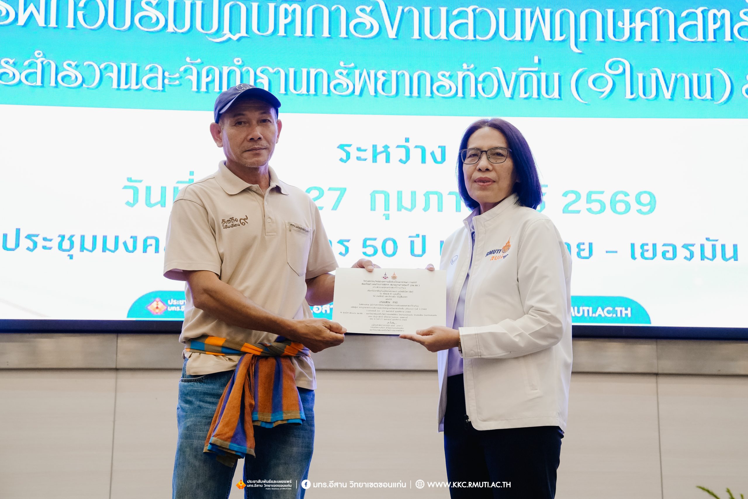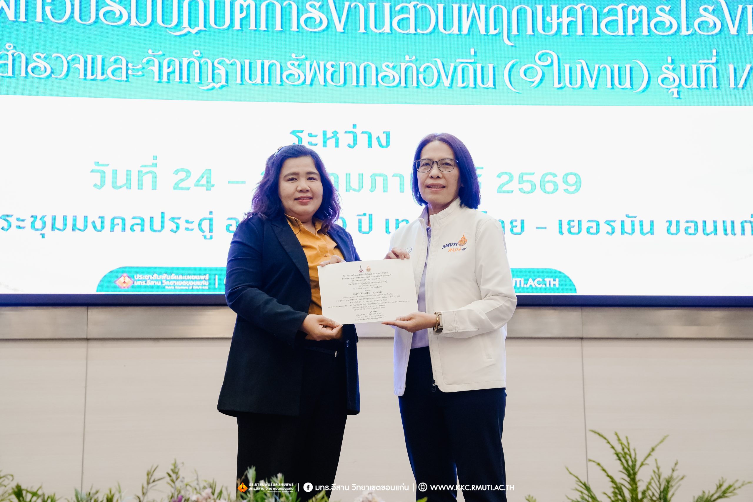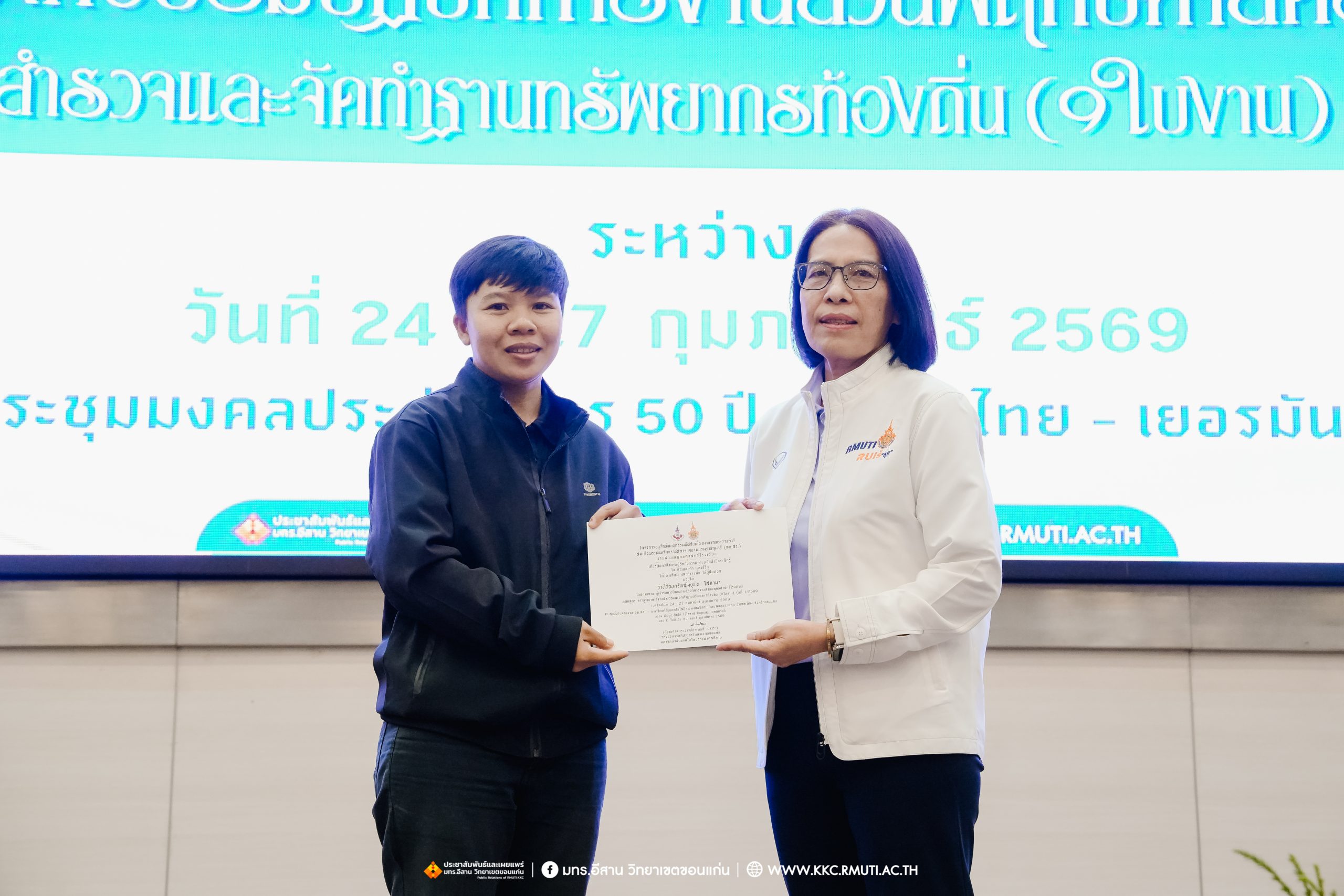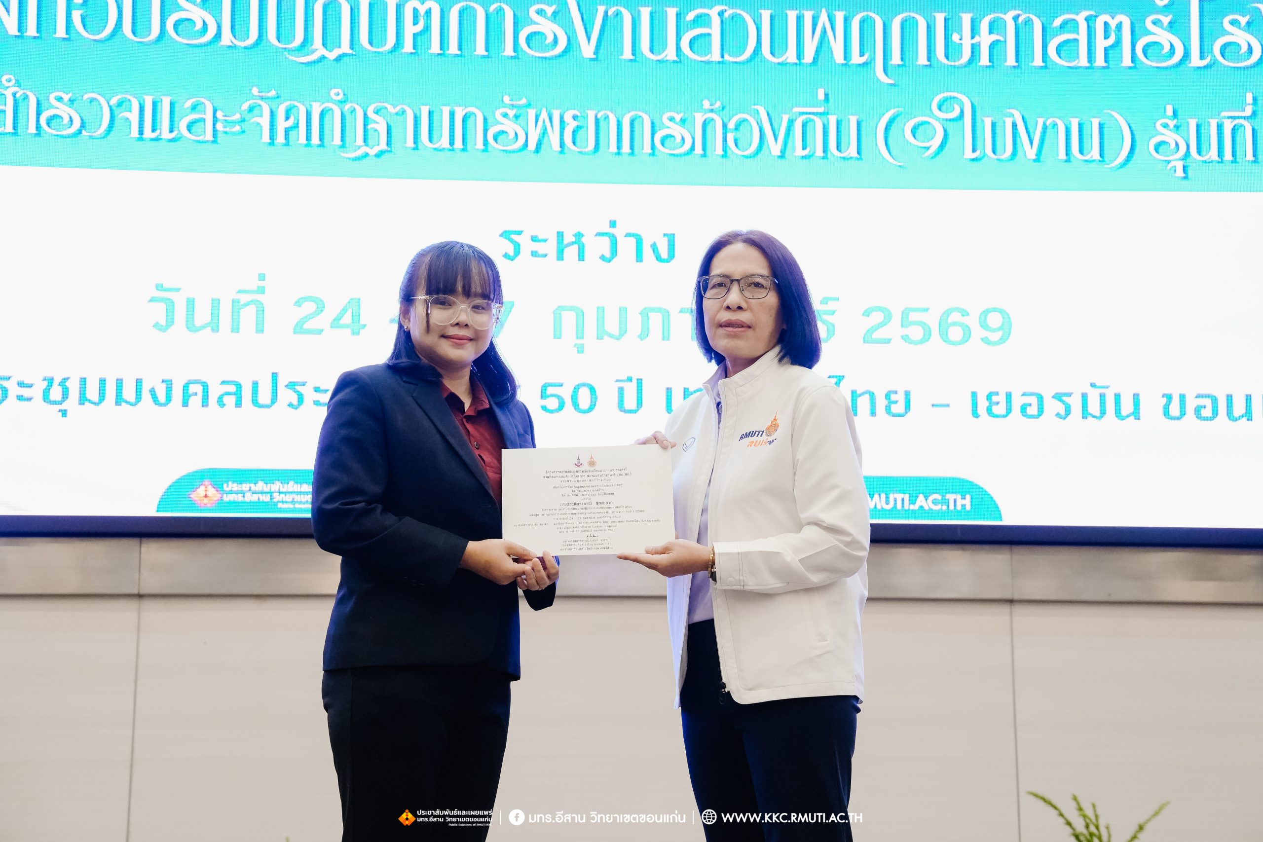 วันศุกร์ที่ 27 กุมภาพันธ์ พ.ศ. 2569 ศูนย์ประสานงานโครงการ อพ.สธ. มหาวิทยาลัยเทคโนโลยีราชมงคลอีสาน วิทยาเขตขอนแก่น โดย รศ.ดร.โฆษิต ศรีภูธร อธิการบดี และผศ.ประพันธ์ ยาวระ รองอธิการบดีประจำวิทยาเขตขอนแก่น มอบ ผศ.ดร.นทยา กัมพลานนท์ ผู้ช่วยอธิการบดี ให้เกียรติมอบเกียรติบัตรแก่ผู้เข้ารับการอบรมปฏิบัติการงานสวนพฤกษศาสตร์โรงเรียน หลักสูตรการบูรณาการงานสำรวจและจัดทำฐานทรัพยากรท้องถิ่น (9 ใบงาน) รุ่นที่ 1/2569 ณ ห้องประชุมมงคลประดู่ ชั้น 3 อาคาร 50 ปี เทคนิค ไทย – เยอรมัน ขอนแก่น โดยโครงการฯ ดำเนินการอบรมในระหว่างวันที่ 24 – 27 กุมภาพันธ์ 2569 ได้รับความสนใจจากสำนักงานการปฏิรูปที่ดินเพื่อการเกษตรส่งบุคลากรพร้อมทั้งเครือข่ายเกษตรกรที่ประสบความสำเร็จในการทำเกษตรยั่งยืน 19 จังหวัด ทั่วทุกภาคของประเทศไทย รวมทั้งสิ้นจำนวน 41 คน และเครือข่ายผู้บริหารและบุคลากรทางการศึกษา 10 แห่ง จำนวน 19 คน