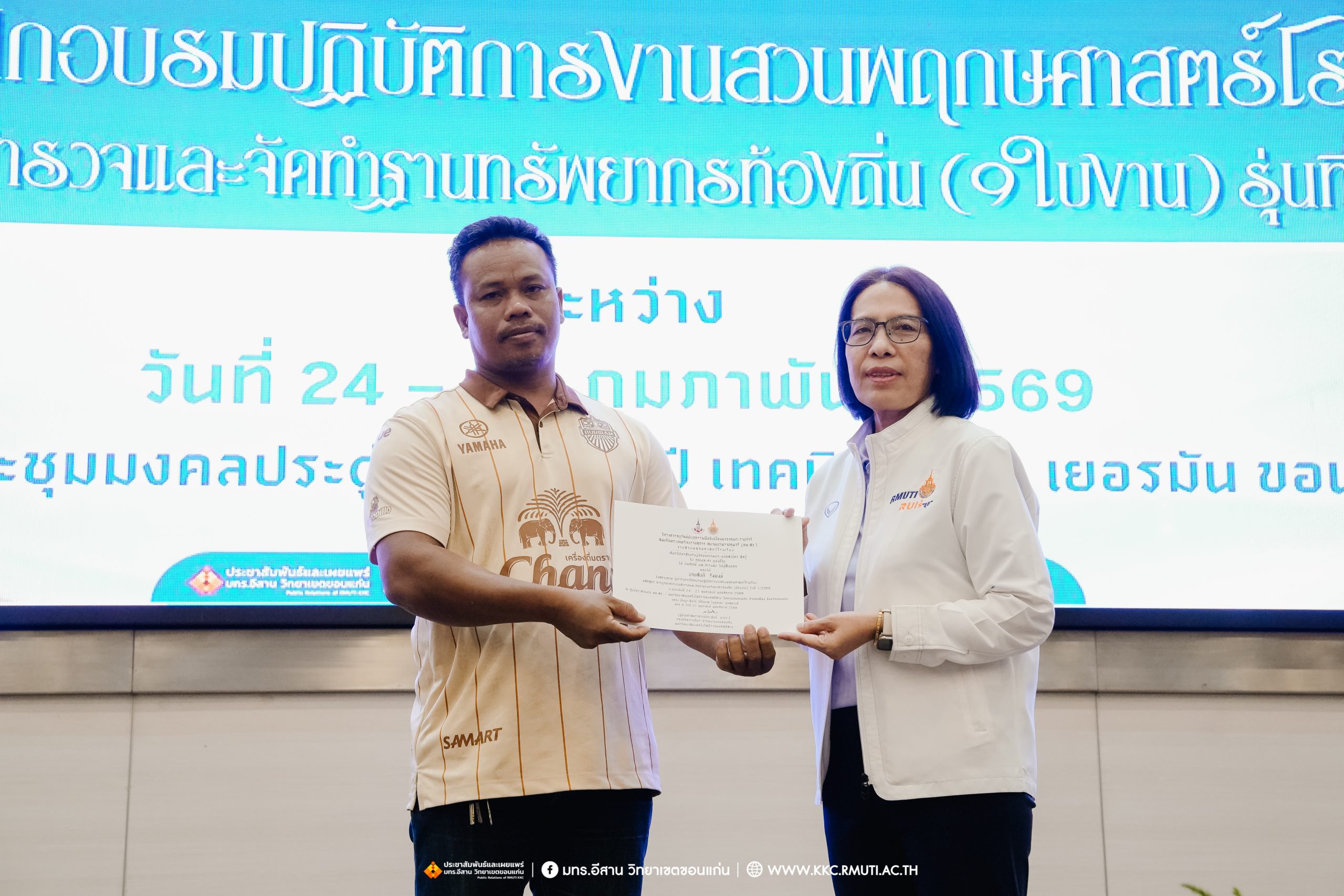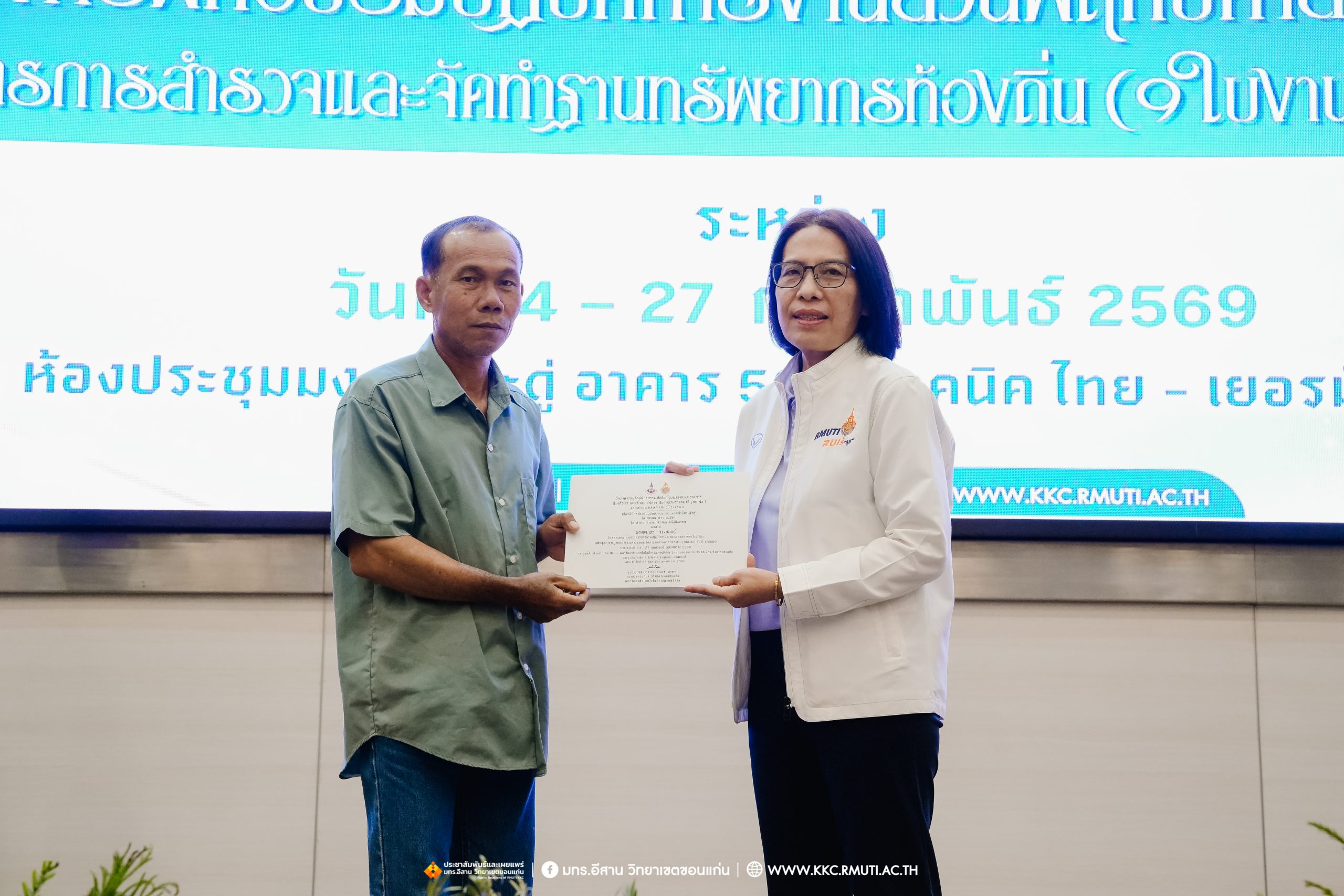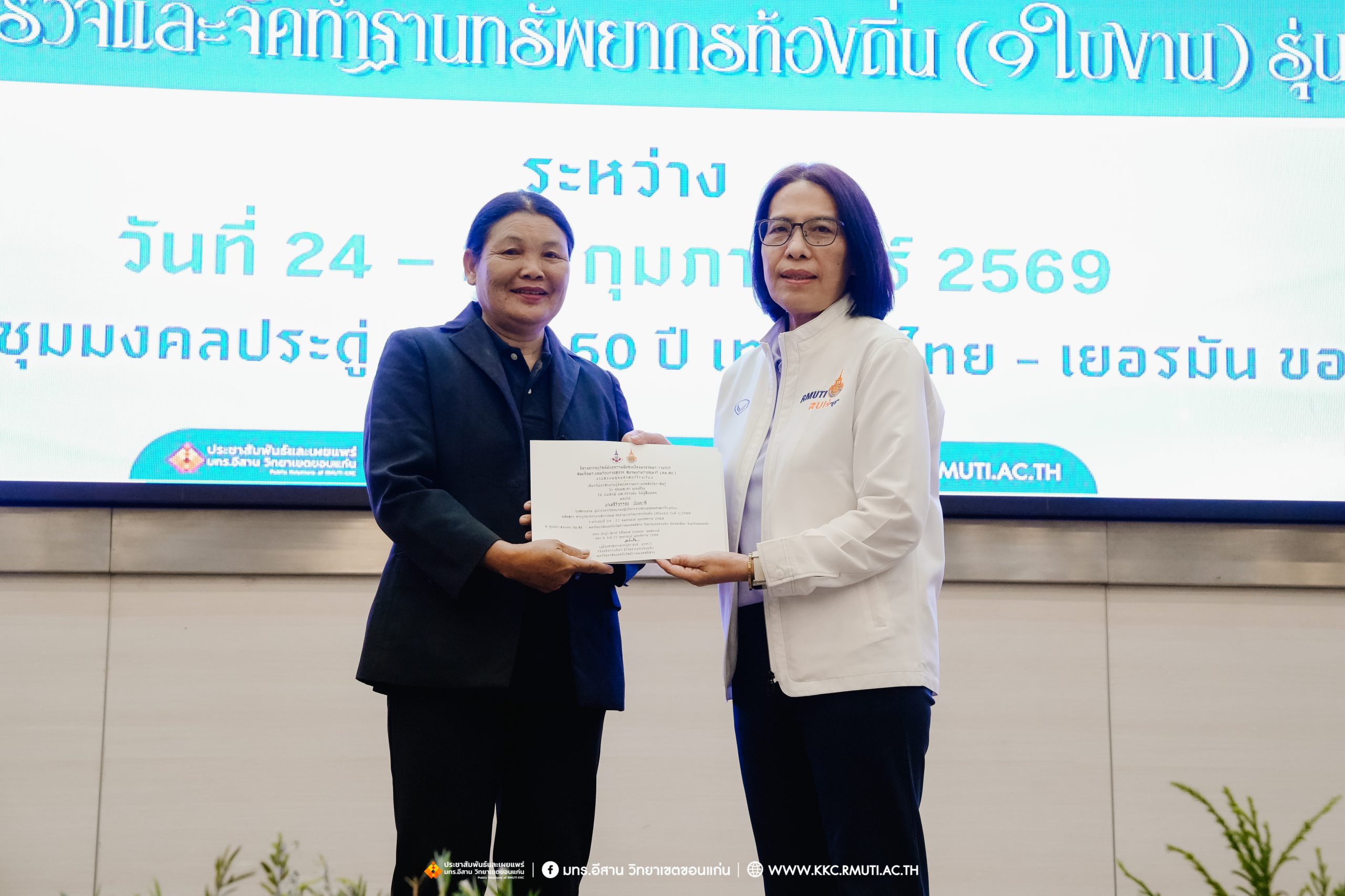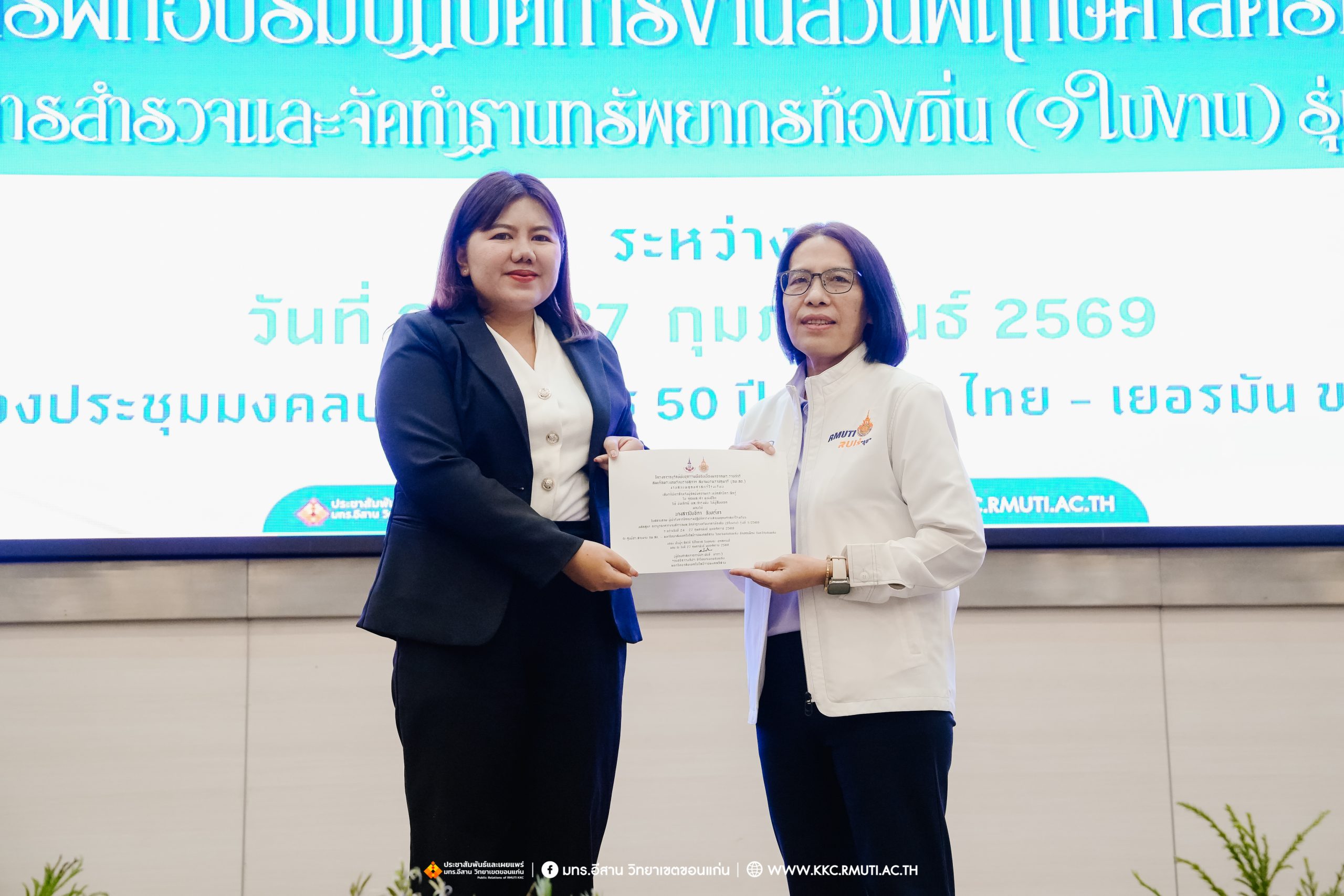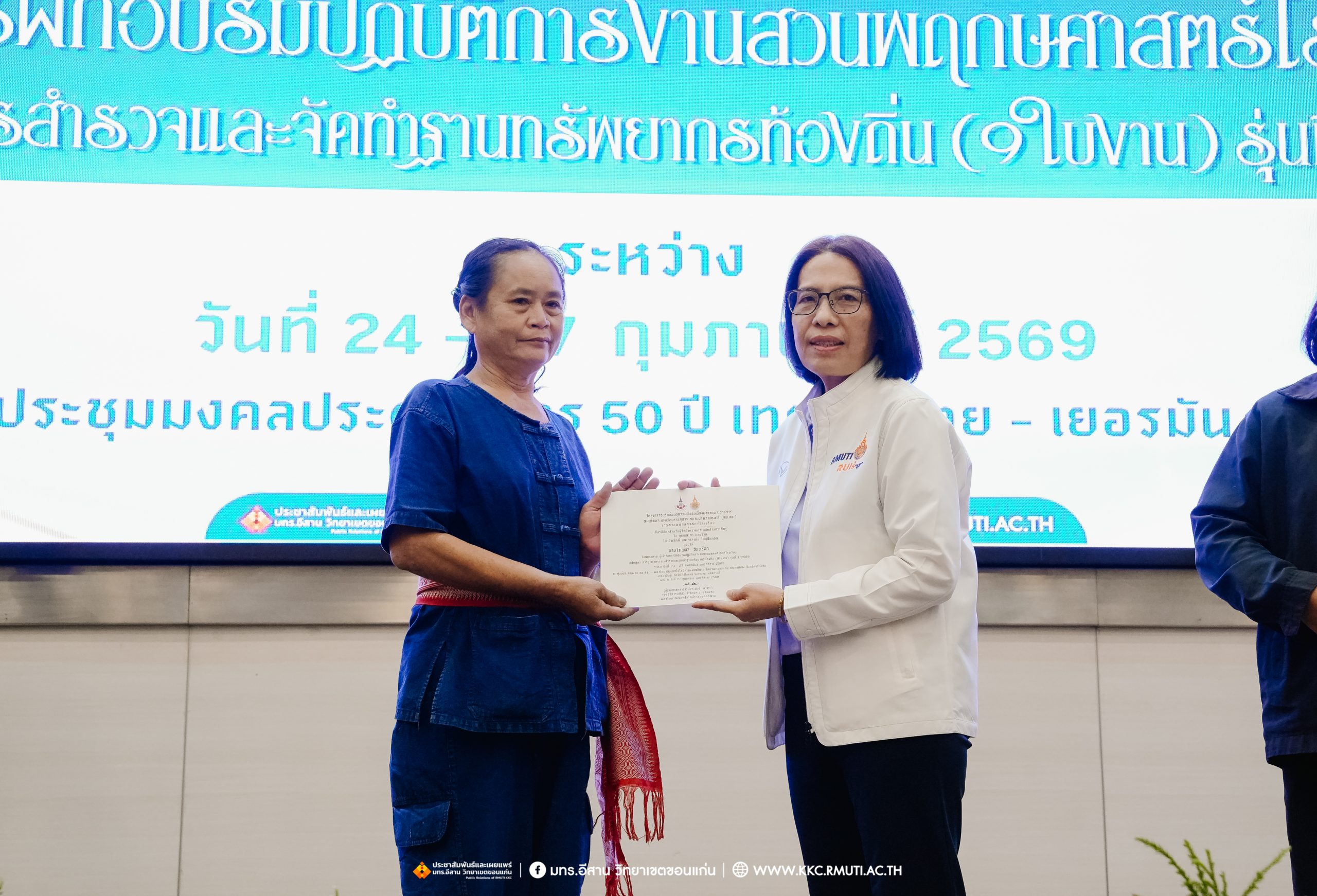 วันศุกร์ที่ 27 กุมภาพันธ์ พ.ศ. 2569 ศูนย์ประสานงานโครงการ อพ.สธ. มหาวิทยาลัยเทคโนโลยีราชมงคลอีสาน วิทยาเขตขอนแก่น โดย รศ.ดร.โฆษิต ศรีภูธร อธิการบดี และผศ.ประพันธ์ ยาวระ รองอธิการบดีประจำวิทยาเขตขอนแก่น มอบ ผศ.ดร.นทยา กัมพลานนท์ ผู้ช่วยอธิการบดี ให้เกียรติมอบเกียรติบัตรแก่ผู้เข้ารับการอบรมปฏิบัติการงานสวนพฤกษศาสตร์โรงเรียน หลักสูตรการบูรณาการงานสำรวจและจัดทำฐานทรัพยากรท้องถิ่น (9 ใบงาน) รุ่นที่ 1/2569 ณ ห้องประชุมมงคลประดู่ ชั้น 3 อาคาร 50 ปี เทคนิค ไทย – เยอรมัน ขอนแก่น โดยโครงการฯ ดำเนินการอบรมในระหว่างวันที่ 24 – 27 กุมภาพันธ์ 2569 ได้รับความสนใจจากสำนักงานการปฏิรูปที่ดินเพื่อการเกษตรส่งบุคลากรพร้อมทั้งเครือข่ายเกษตรกรที่ประสบความสำเร็จในการทำเกษตรยั่งยืน 19 จังหวัด ทั่วทุกภาคของประเทศไทย รวมทั้งสิ้นจำนวน 41 คน และเครือข่ายผู้บริหารและบุคลากรทางการศึกษา 10 แห่ง จำนวน 19 คน