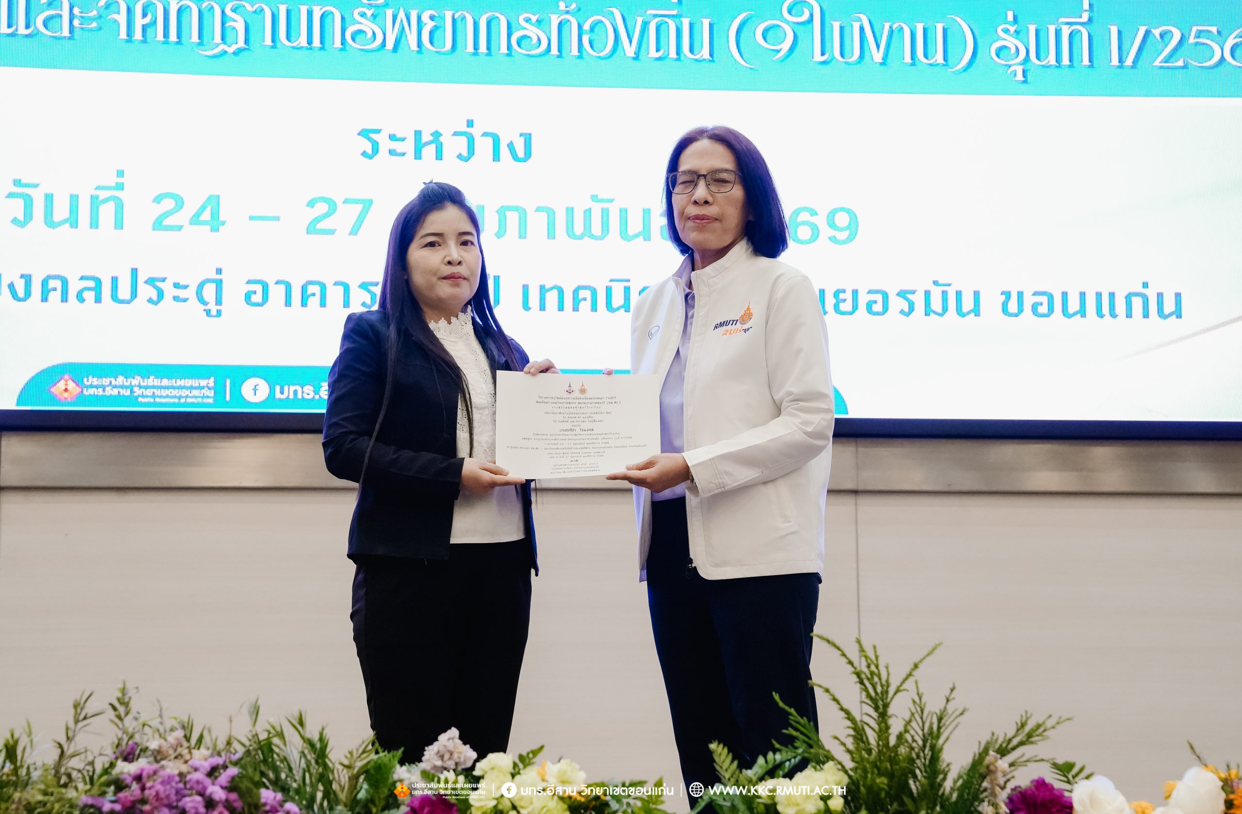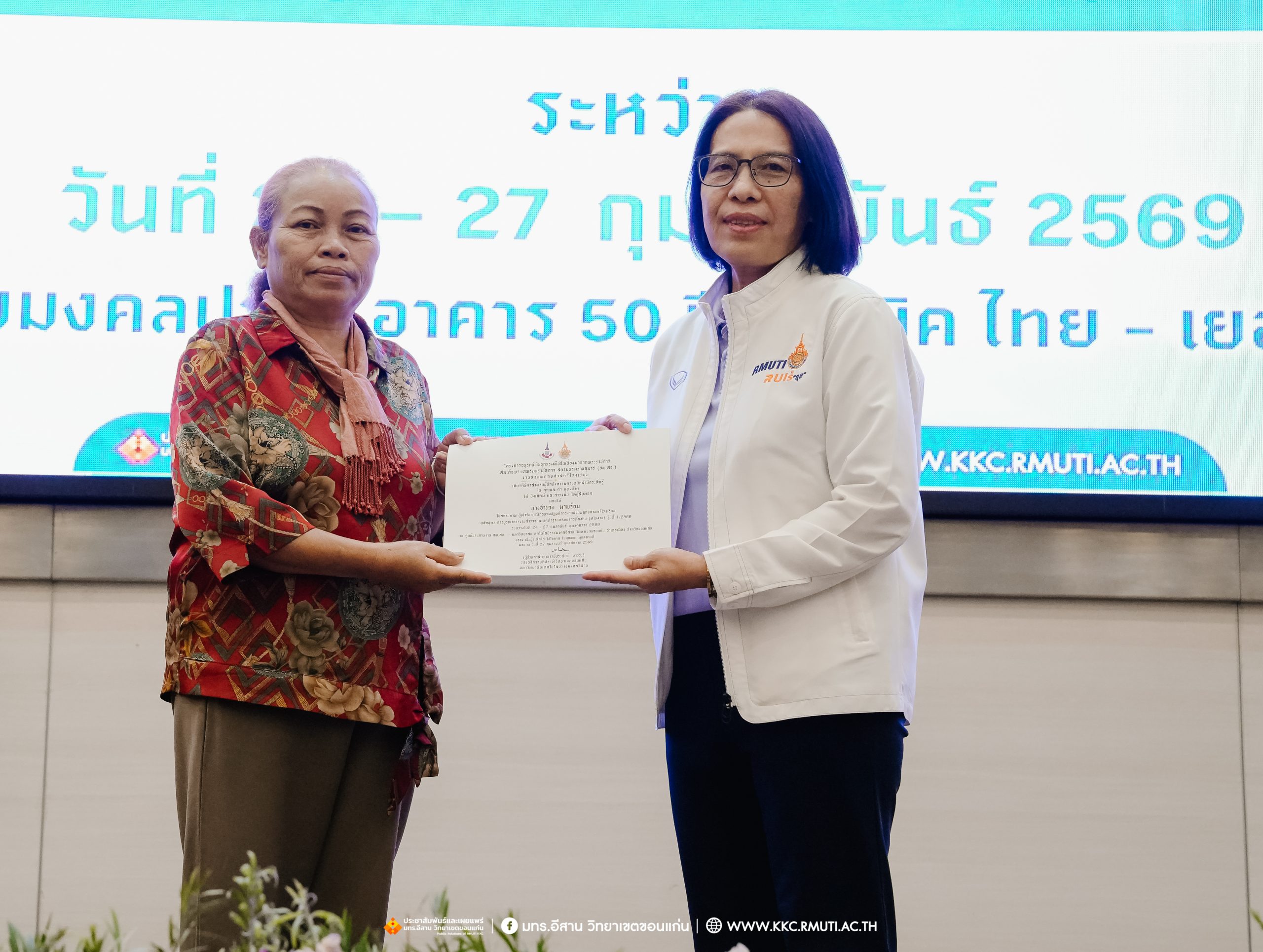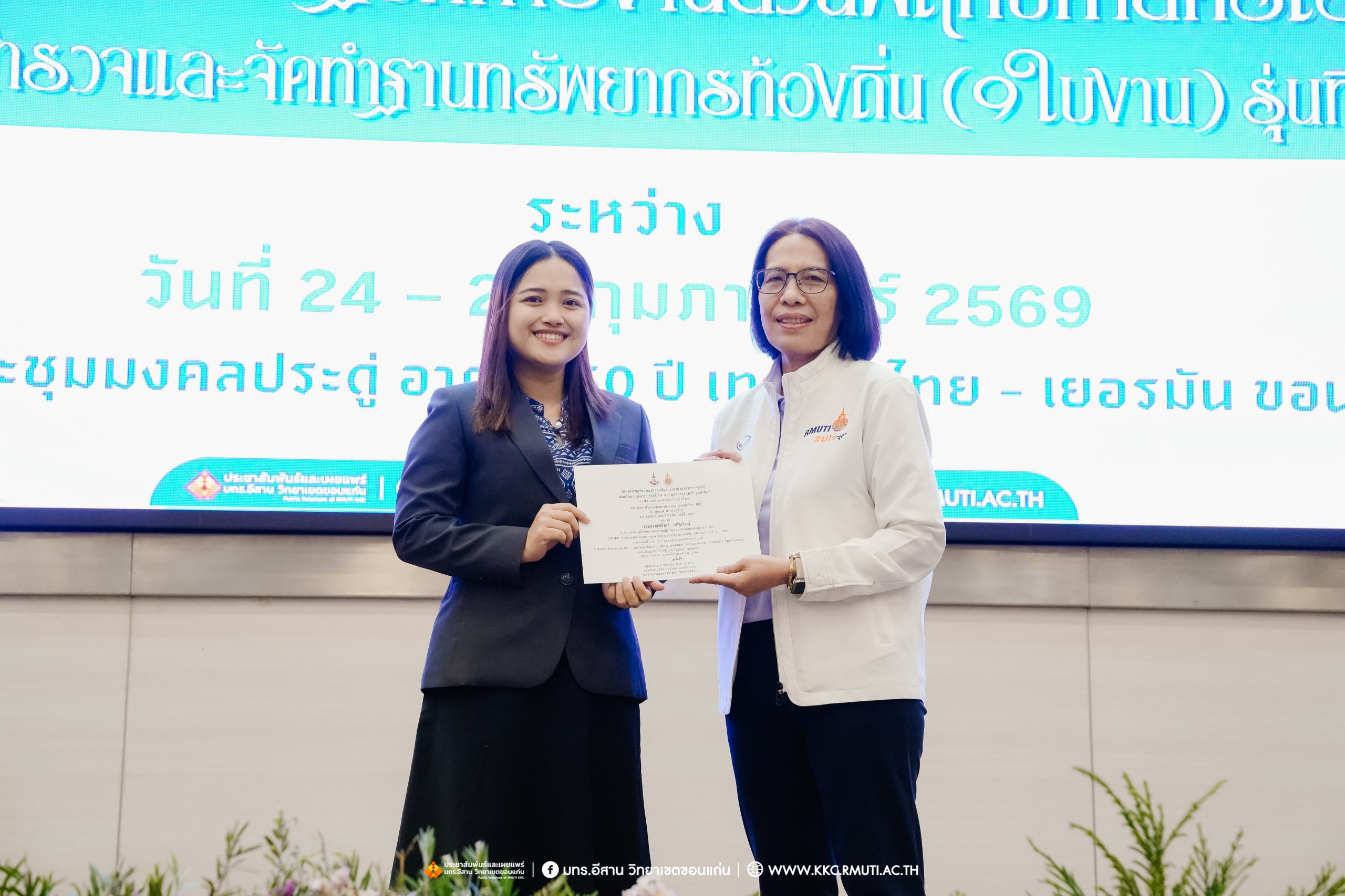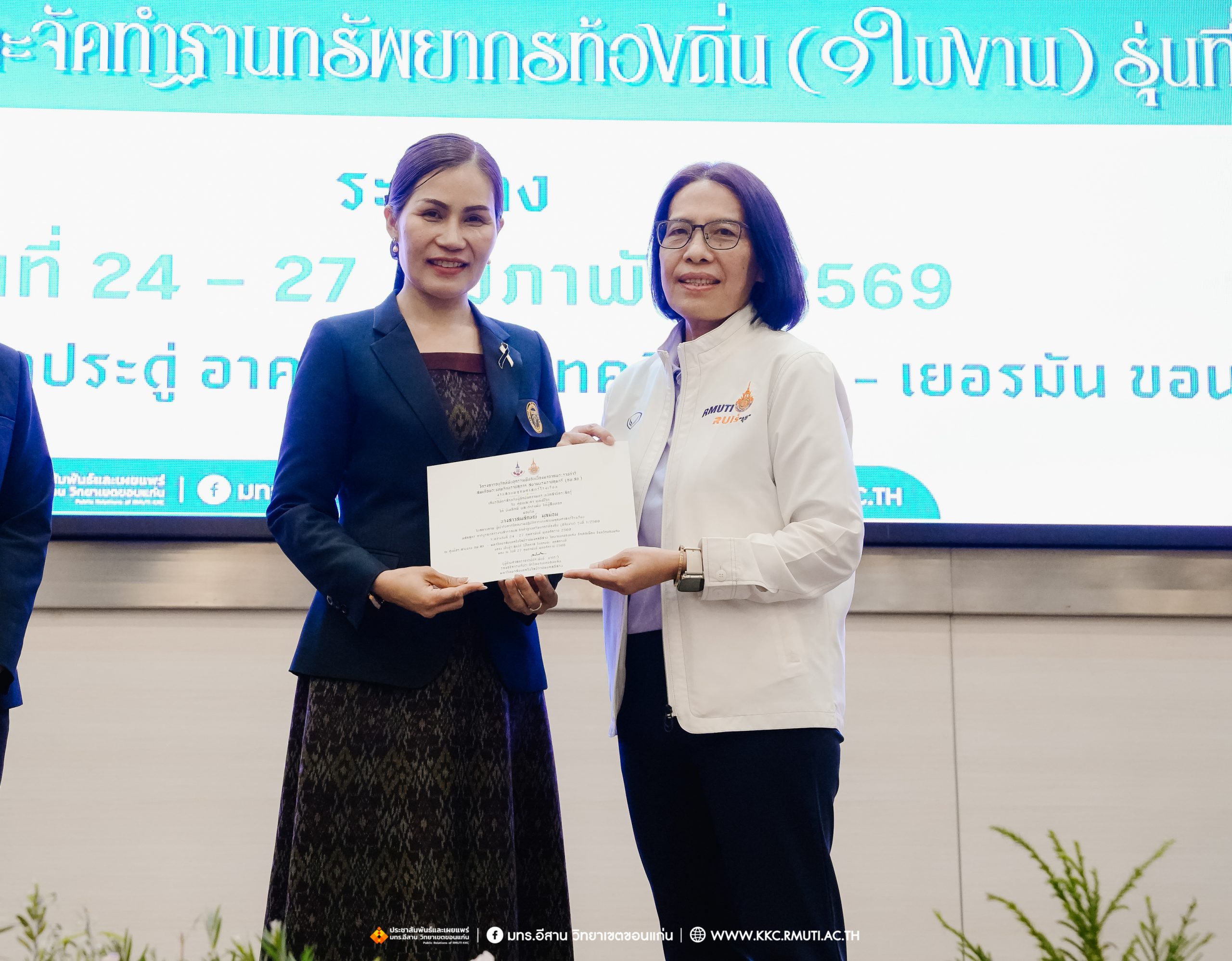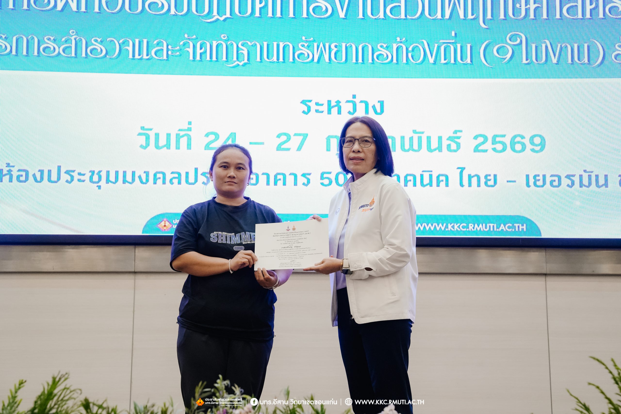 วันศุกร์ที่ 27 กุมภาพันธ์ พ.ศ. 2569 ศูนย์ประสานงานโครงการ อพ.สธ. มหาวิทยาลัยเทคโนโลยีราชมงคลอีสาน วิทยาเขตขอนแก่น โดย รศ.ดร.โฆษิต ศรีภูธร อธิการบดี และผศ.ประพันธ์ ยาวระ รองอธิการบดีประจำวิทยาเขตขอนแก่น มอบ ผศ.ดร.นทยา กัมพลานนท์ ผู้ช่วยอธิการบดี ให้เกียรติมอบเกียรติบัตรแก่ผู้เข้ารับการอบรมปฏิบัติการงานสวนพฤกษศาสตร์โรงเรียน หลักสูตรการบูรณาการงานสำรวจและจัดทำฐานทรัพยากรท้องถิ่น (9 ใบงาน) รุ่นที่ 1/2569 ณ ห้องประชุมมงคลประดู่ ชั้น 3 อาคาร 50 ปี เทคนิค ไทย – เยอรมัน ขอนแก่น โดยโครงการฯ ดำเนินการอบรมในระหว่างวันที่ 24 – 27 กุมภาพันธ์ 2569 ได้รับความสนใจจากสำนักงานการปฏิรูปที่ดินเพื่อการเกษตรส่งบุคลากรพร้อมทั้งเครือข่ายเกษตรกรที่ประสบความสำเร็จในการทำเกษตรยั่งยืน 19 จังหวัด ทั่วทุกภาคของประเทศไทย รวมทั้งสิ้นจำนวน 41 คน และเครือข่ายผู้บริหารและบุคลากรทางการศึกษา 10 แห่ง จำนวน 19 คน