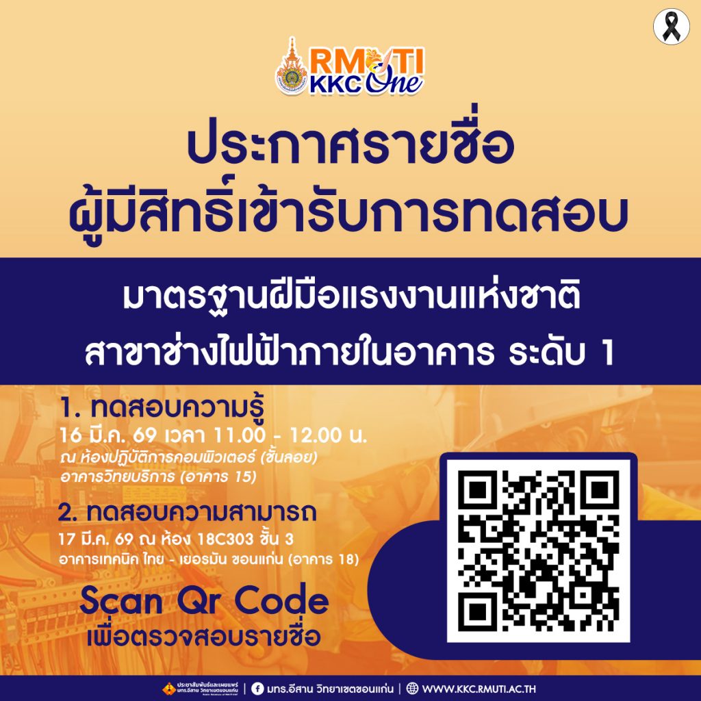 ศูนย์ทดสอบมาตรฐานฝีมือแรงงานแห่งชาติประกาศรายชื่อผู้มีสิทธิ์เข้ารับการทดสอบมาตรฐานฝีมือแรงงานแห่งชาติ สาขาช่างไฟฟ้าภายในอาคาร ระดับ 1 มีนาคม 11, 2026มีนาคม 14, 2026ประชาสัมพันธ์ประกาศ Facebook iconFacebookTwitter iconTwitterLINE iconLine