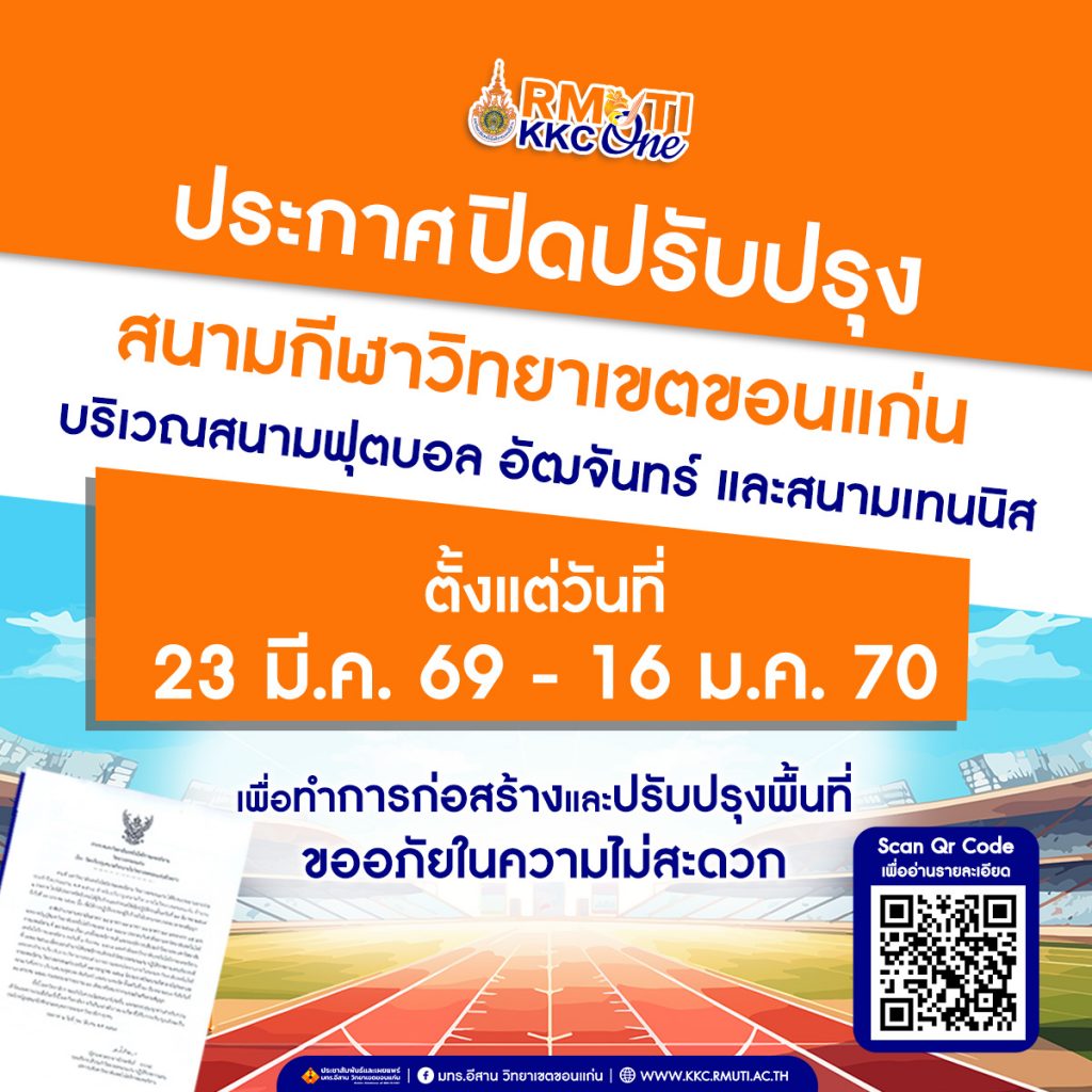 ประกาศมหาวิทยาลัยเทคโนโลยีราชมงคลอีสาน วิทยาเขตขอนแก่น เรื่อง ปิดปรับปรุงสนามกีฬาภายในวิทยาเขตขอนแก่นชั่วคราว มีนาคม 18, 2026มีนาคม 18, 2026ประชาสัมพันธ์ประกาศ Facebook iconFacebookTwitter iconTwitterLINE iconLine